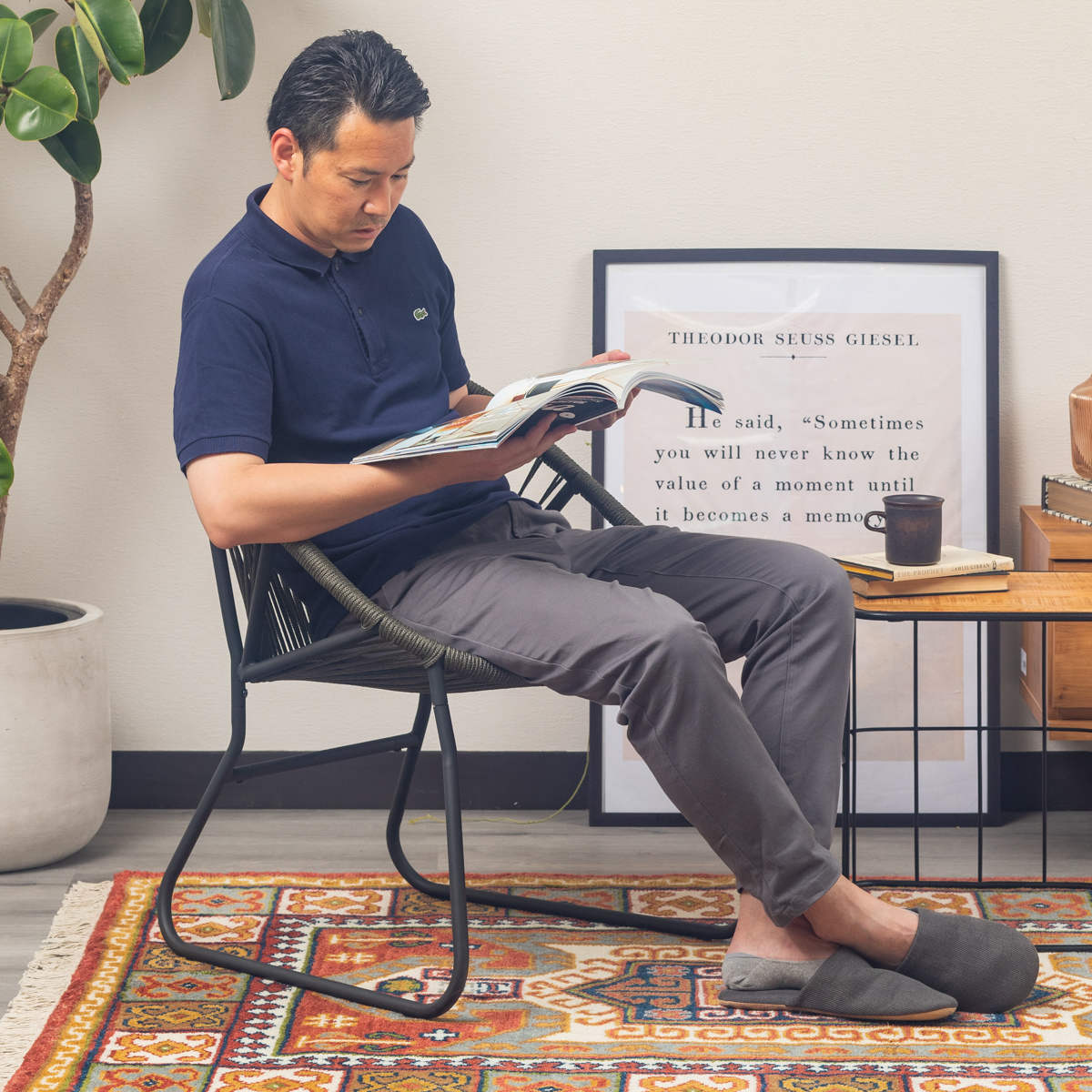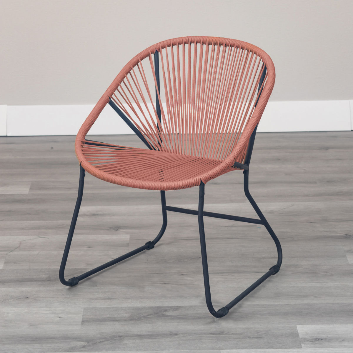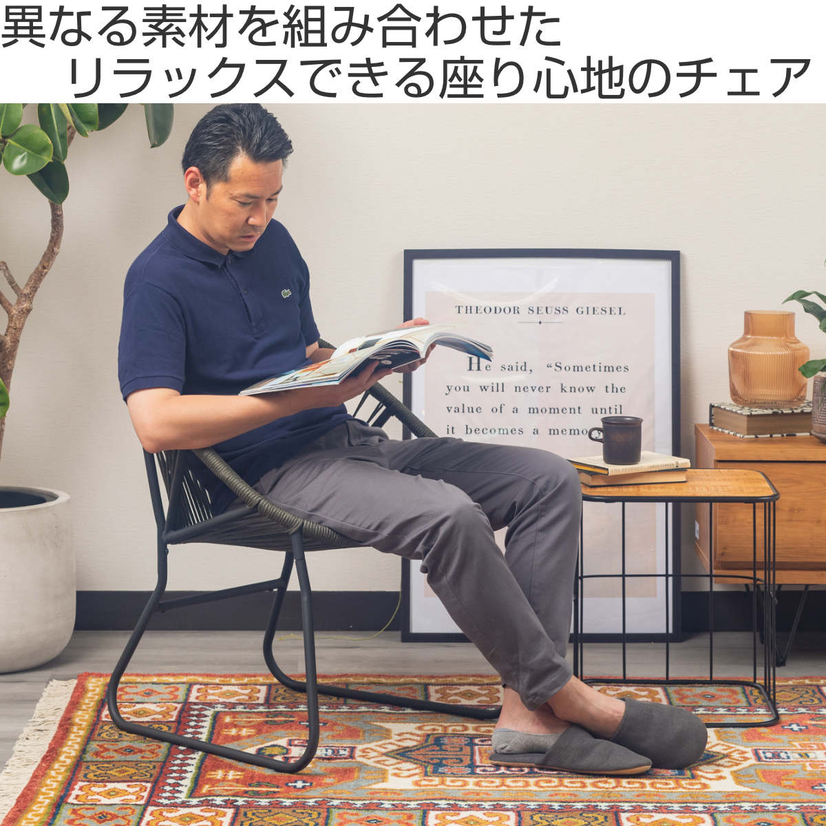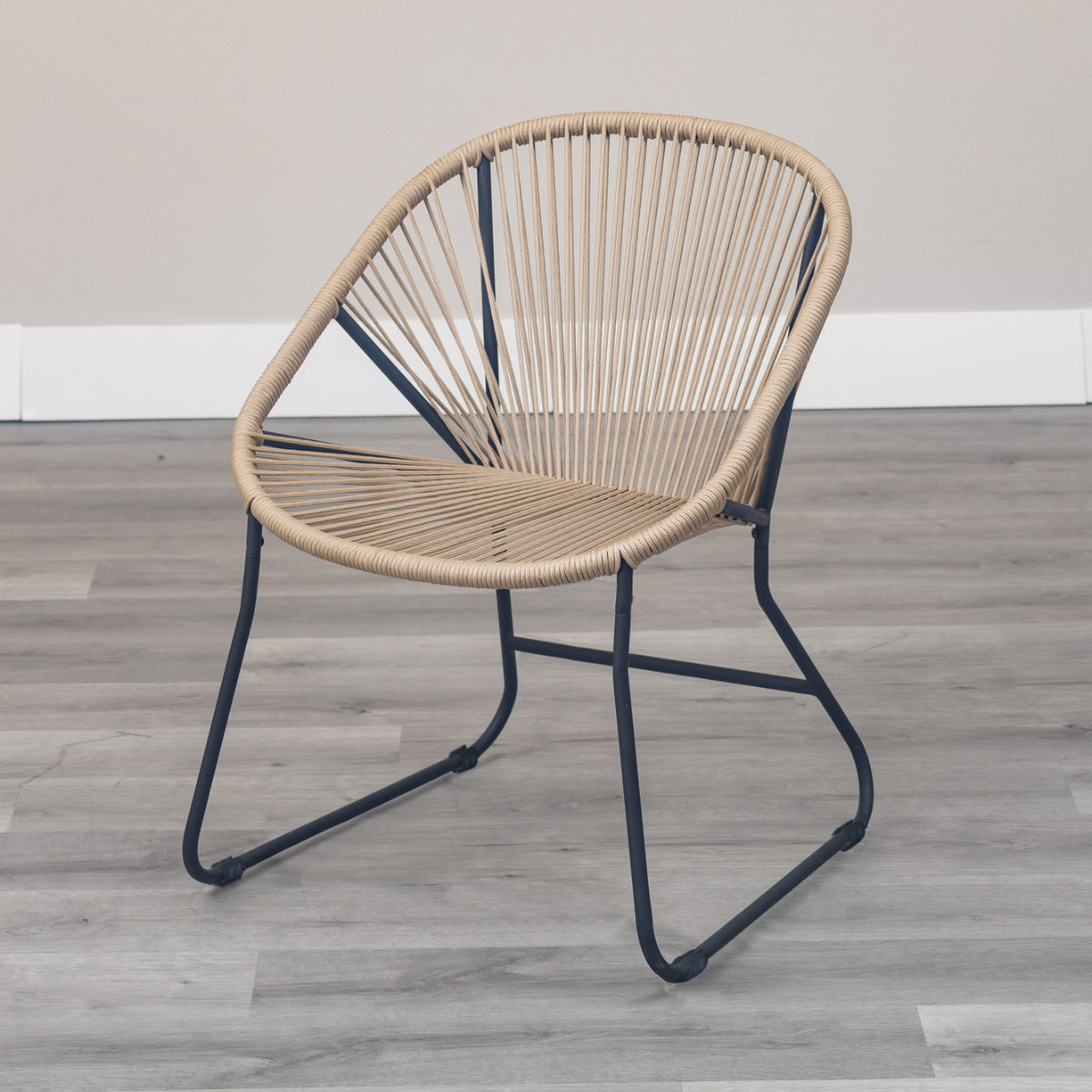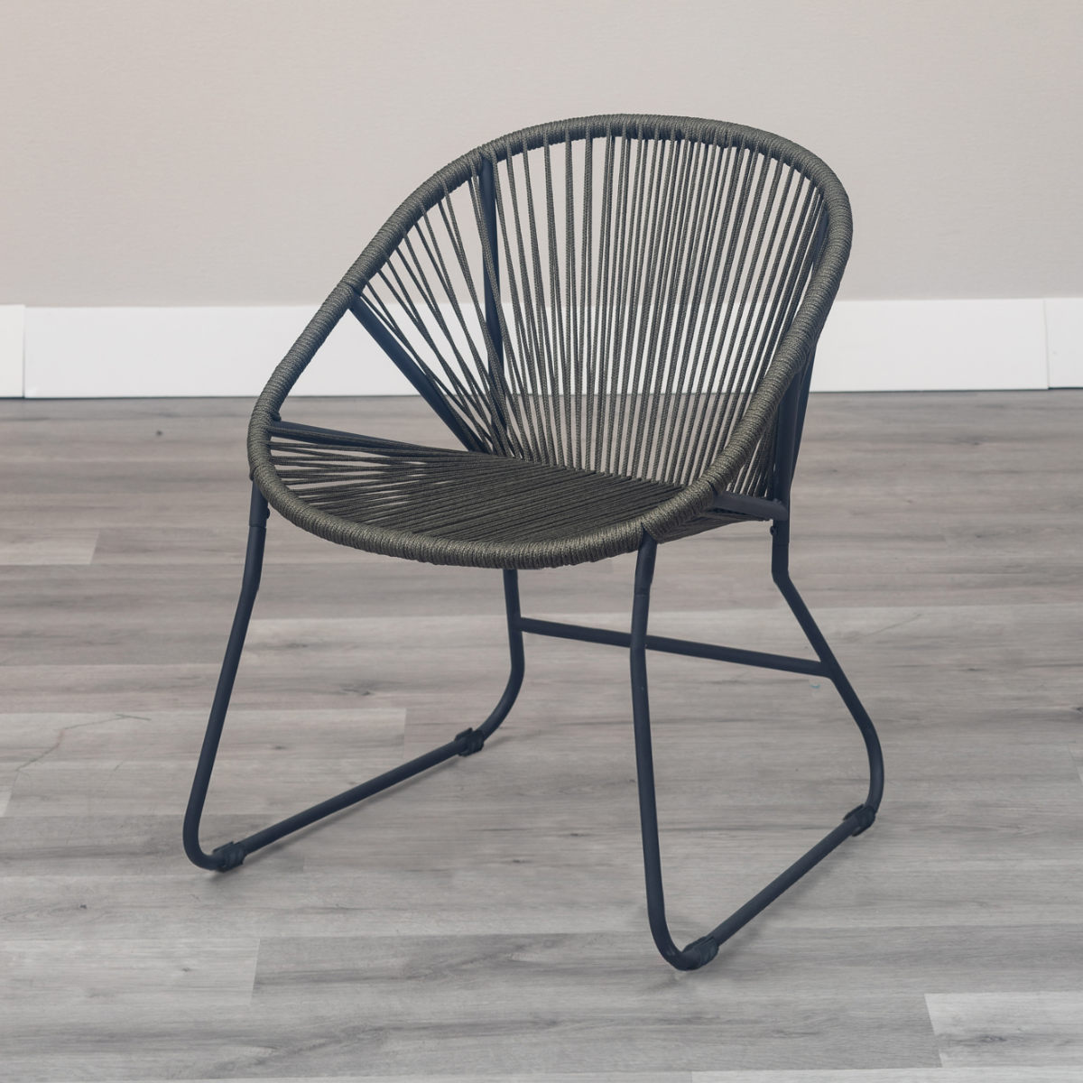 温かみのあるロープとマットなブラックスチールのフレームを組み合わせたチェアです。海外風インテリアのような開放的な雰囲気を持ち合わせています。手作業で編んでいるため、どこか柔らかな印象でインテリアとして愛着が湧いてくるアイテムです。