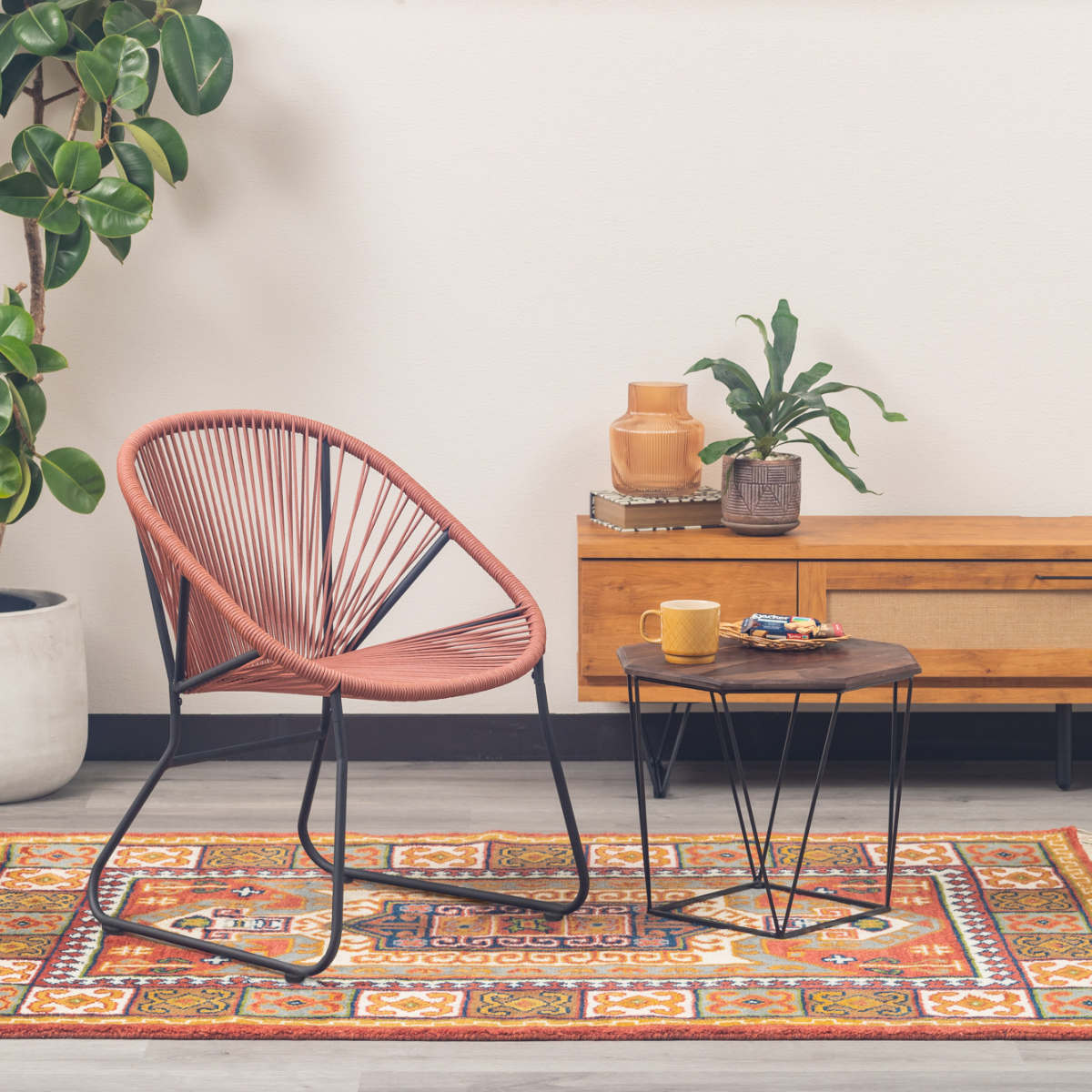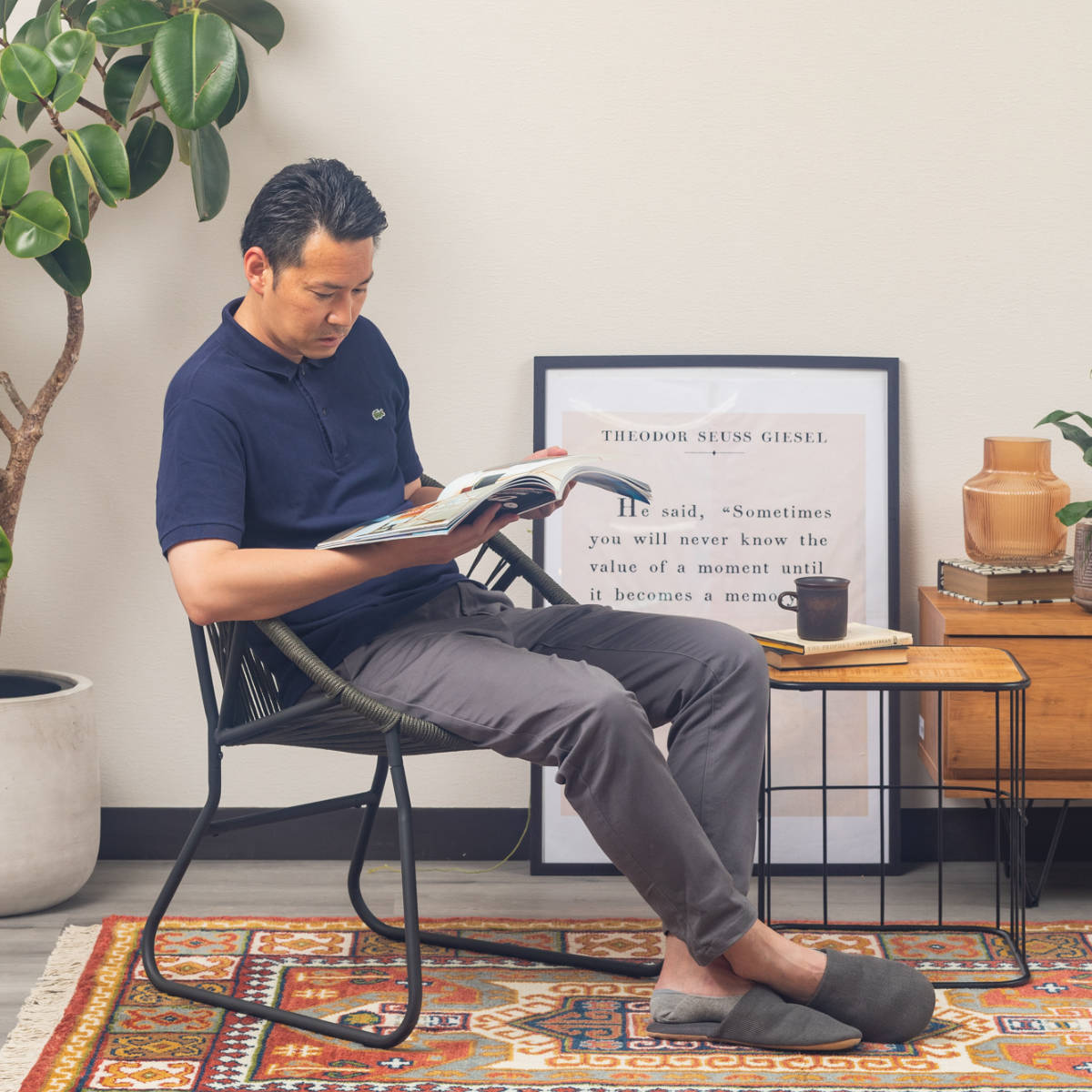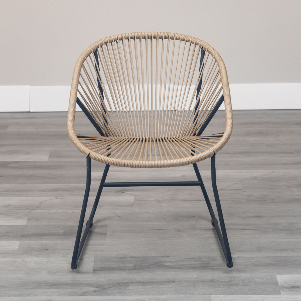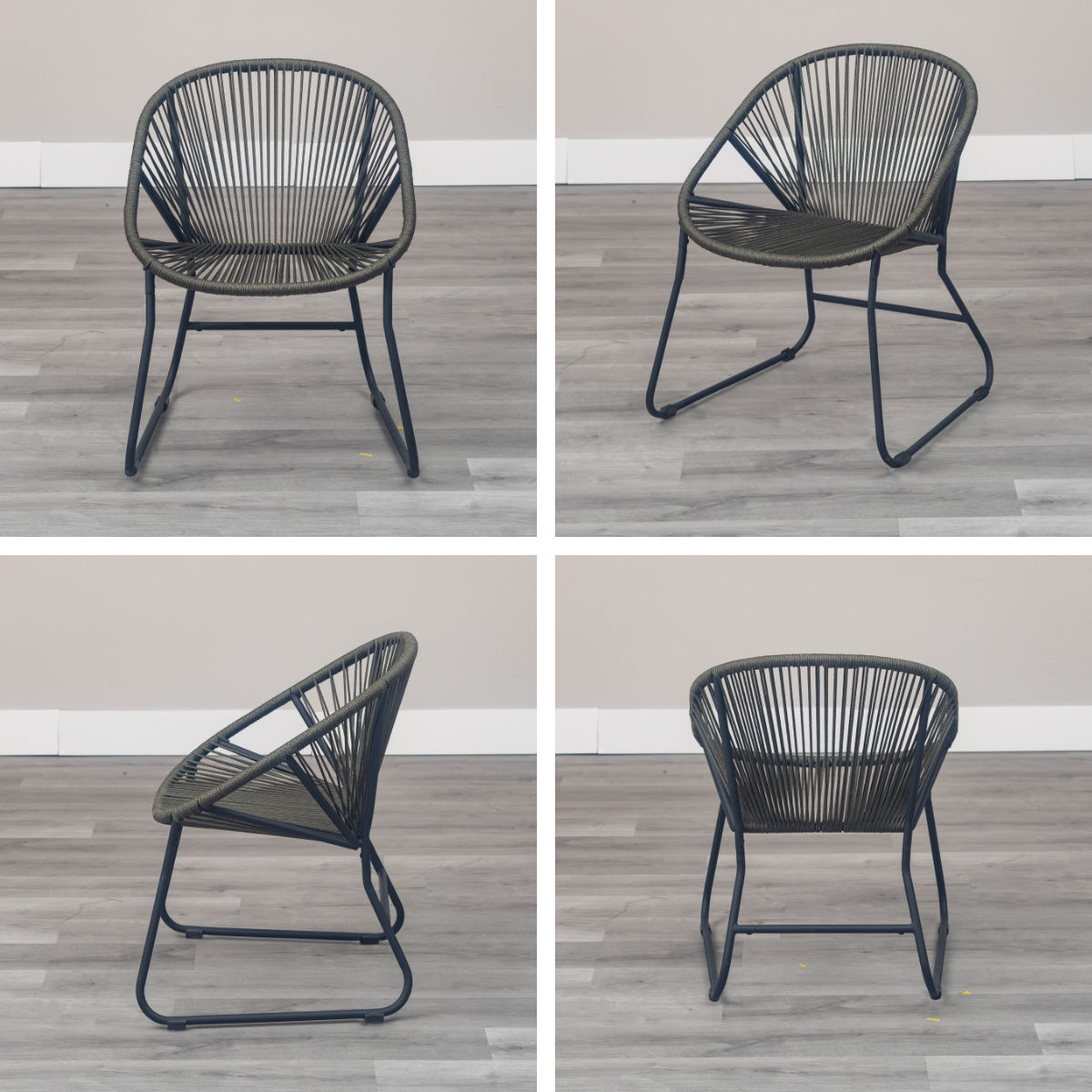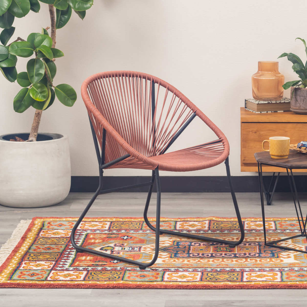温かみのあるロープとマットなブラックスチールのフレームを組み合わせたチェアです。海外風インテリアのような開放的な雰囲気を持ち合わせています。手作業で編んでいるため、どこか柔らかな印象でインテリアとして愛着が湧いてくるアイテムです。