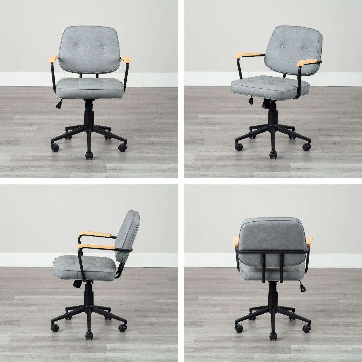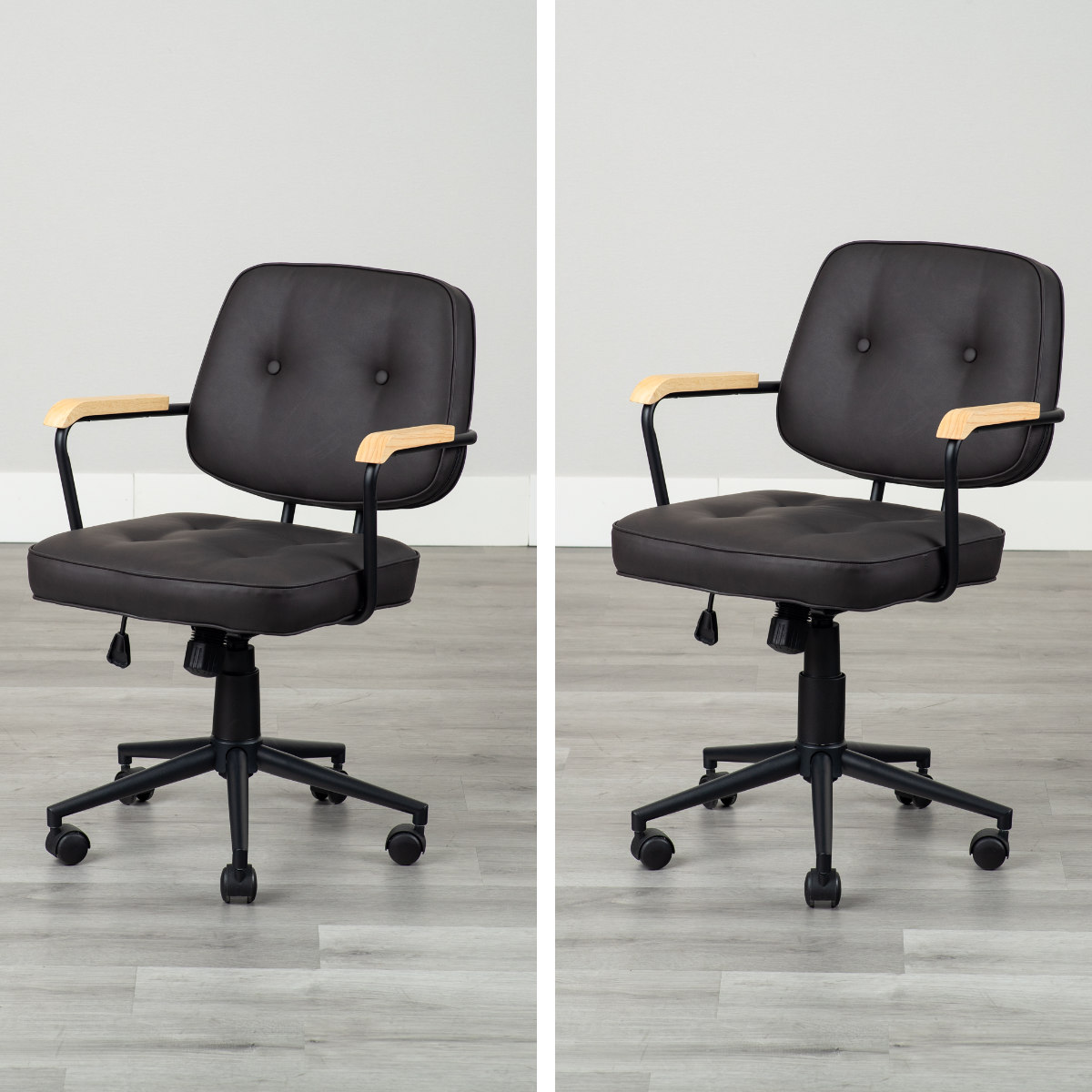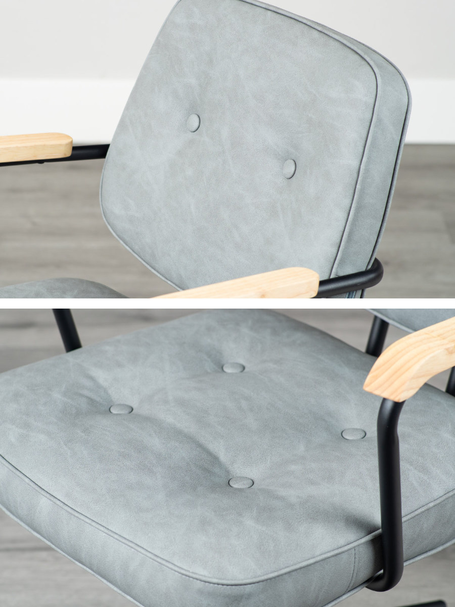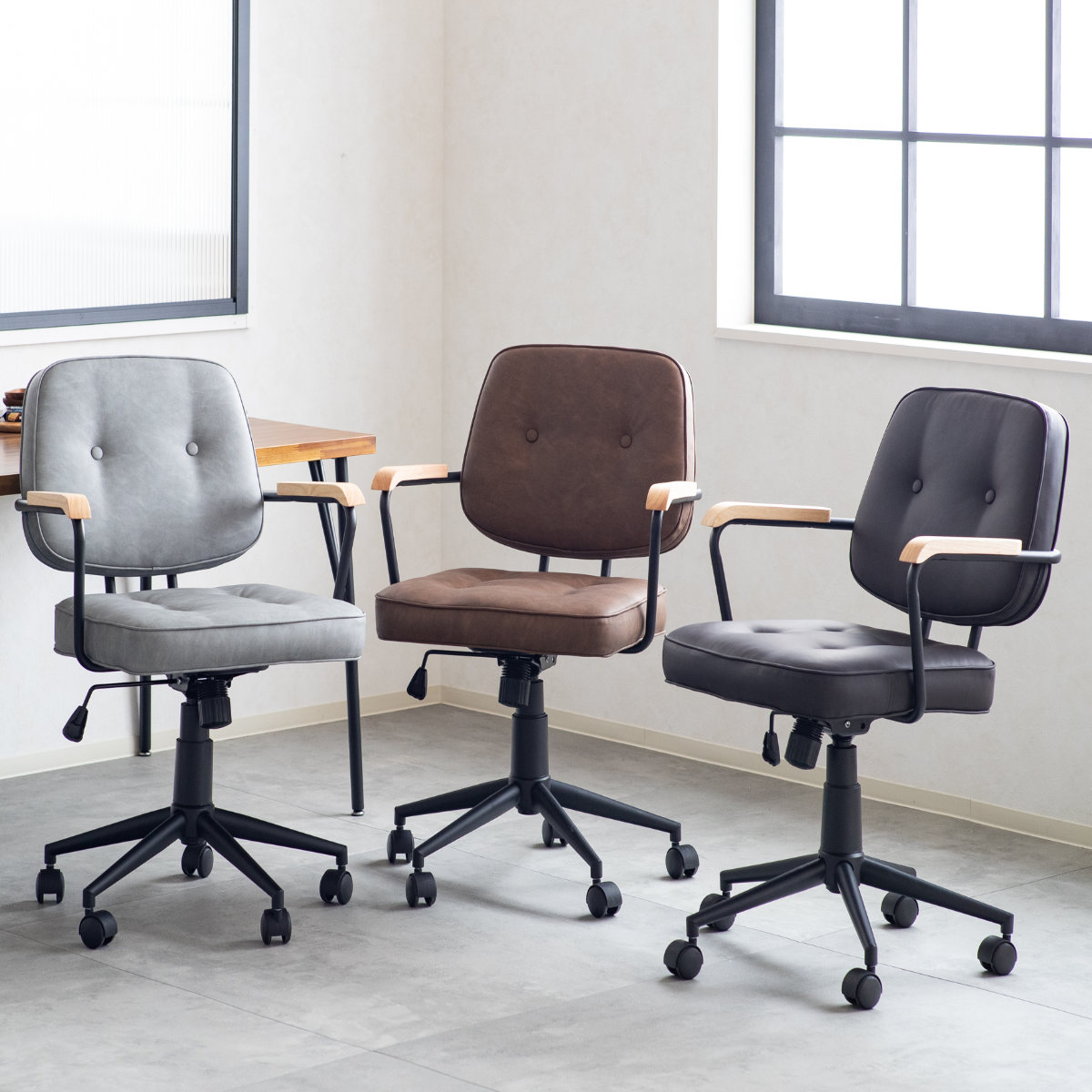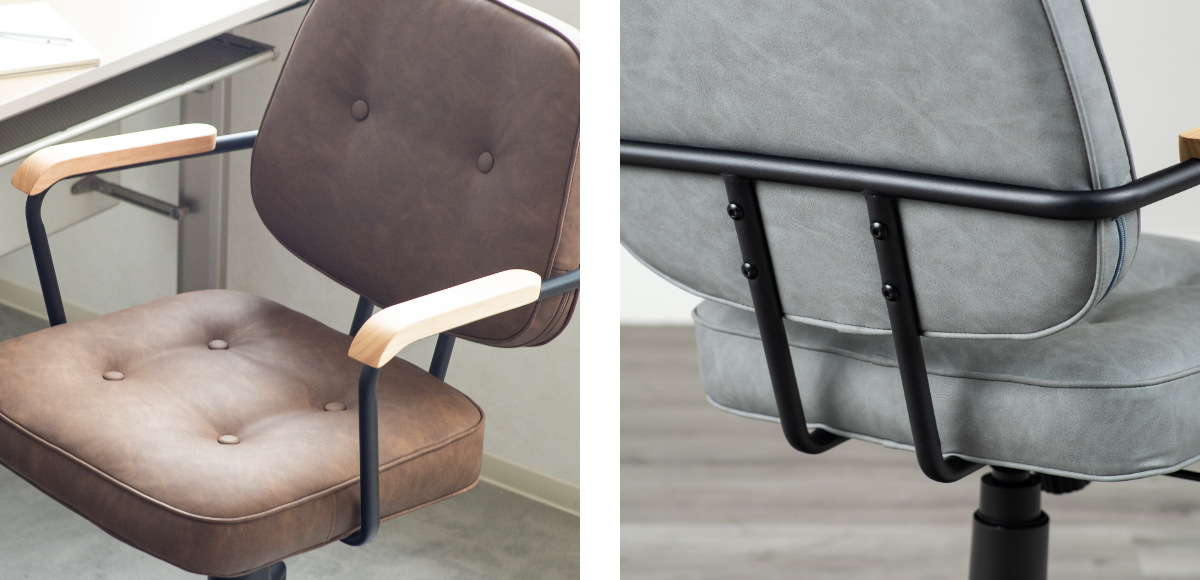 機能性とデザイン性を兼ね備えたチェアです。木肘とレトロなボタン留め風ステッチがアクセントになっております。レザーファブリック・スチール・木製の肘掛けで温かみのある雰囲気を演出し、こだわりのワークスペースになります。