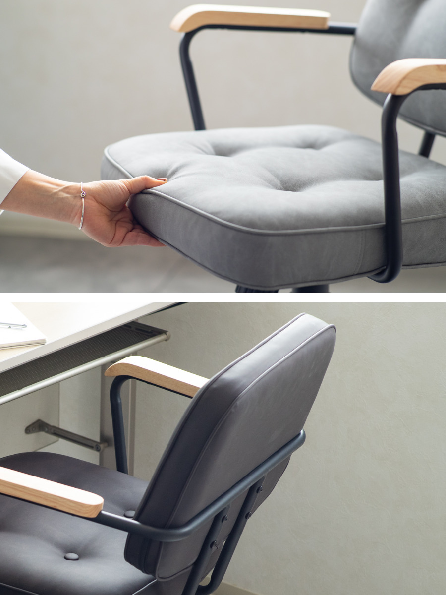 肉厚な座面と背もたれのクッションがしっかりと身体を支えてくれます。長時間座っていても疲れにくく、快適にデスクワークすることができます。