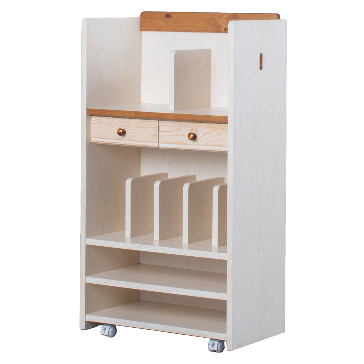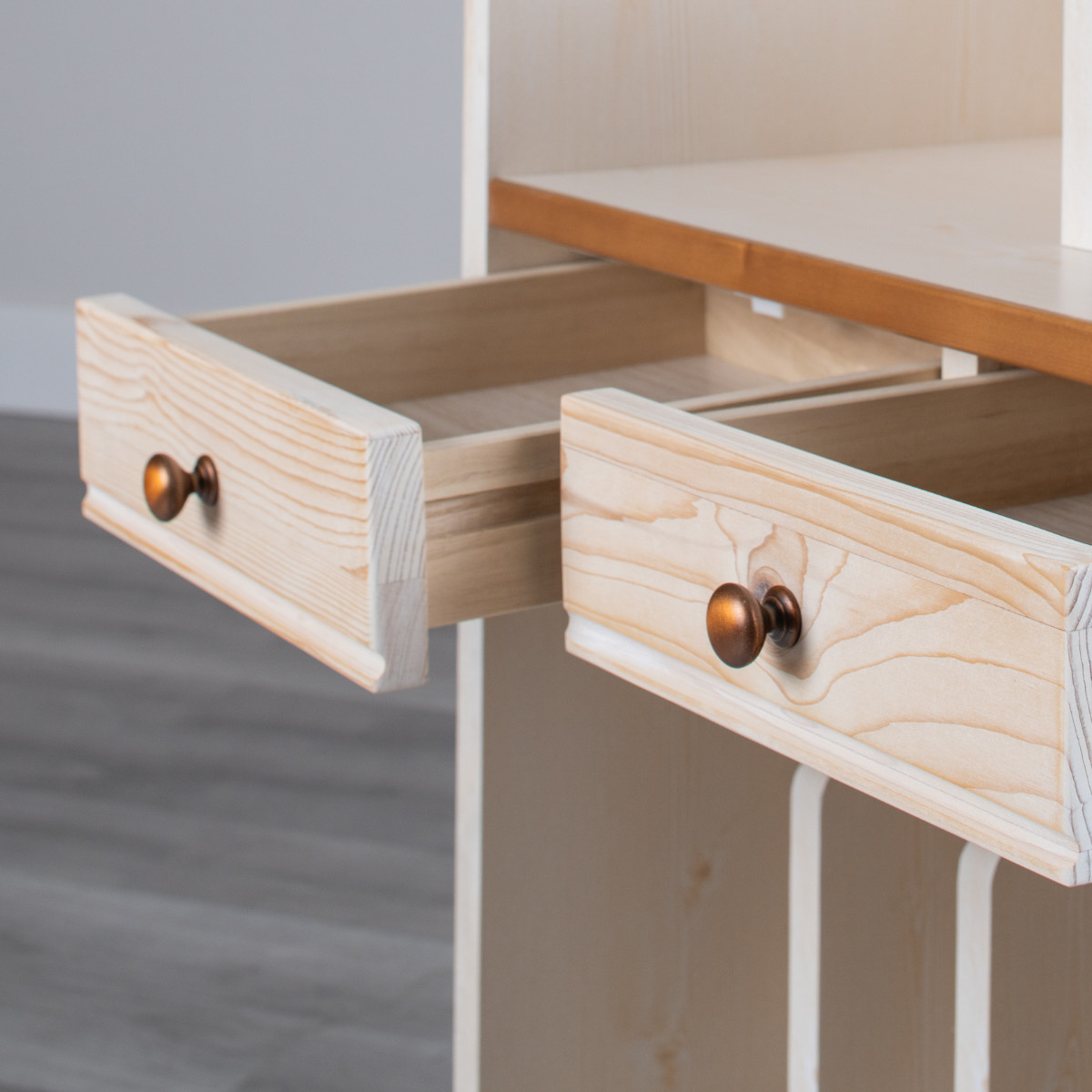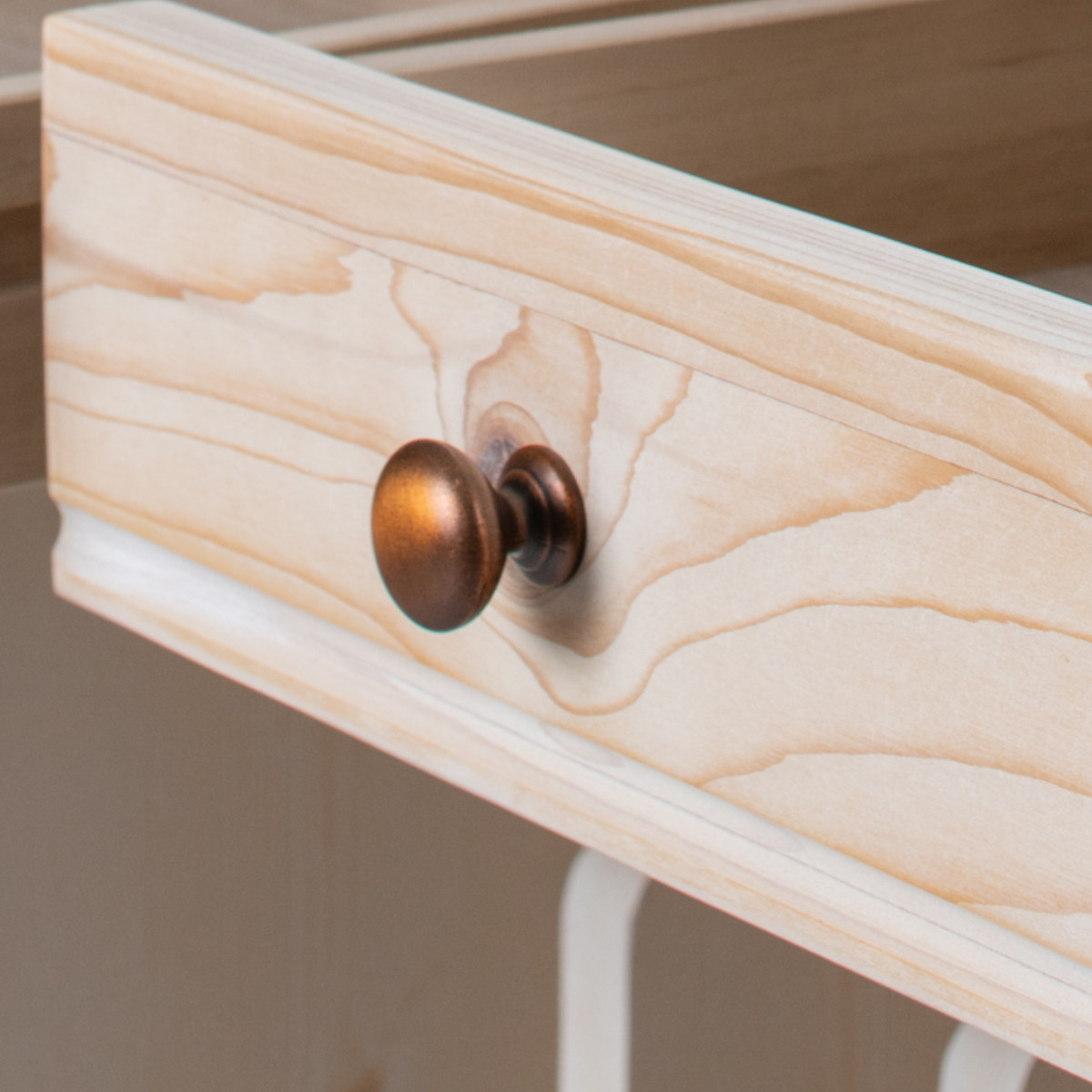 引き出しが2杯付いています。文房具やハンカチなどの小物を収納するのに便利です。アンティークなブロンズ色のお洒落な取っ手が付いています。