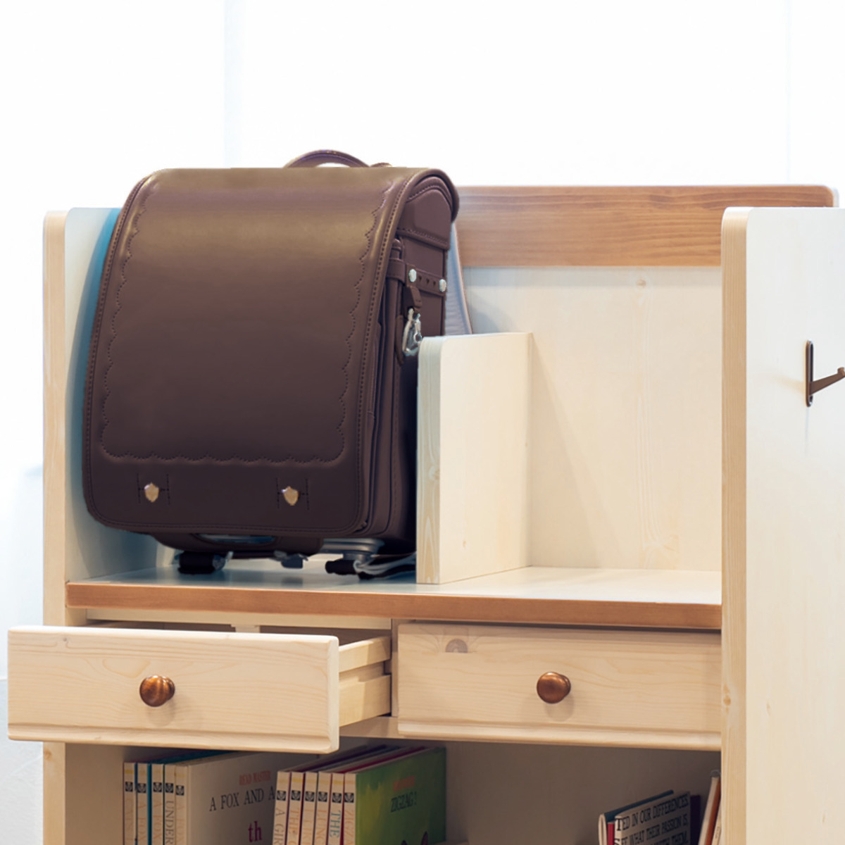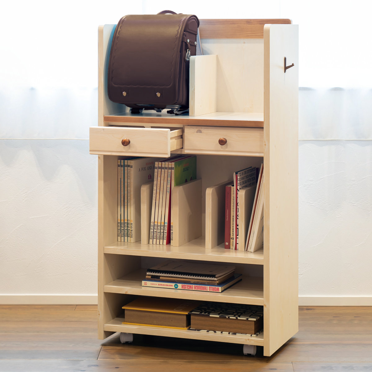 ランドセルと学校教材をまとめて収納できる、やさしい風合いのカントリー調のランドセルラックです。奥行きがコンパクトなので、リビングにも置きやすいサイズです。家族で一緒に楽しみながら学習することでやる気がアップします。