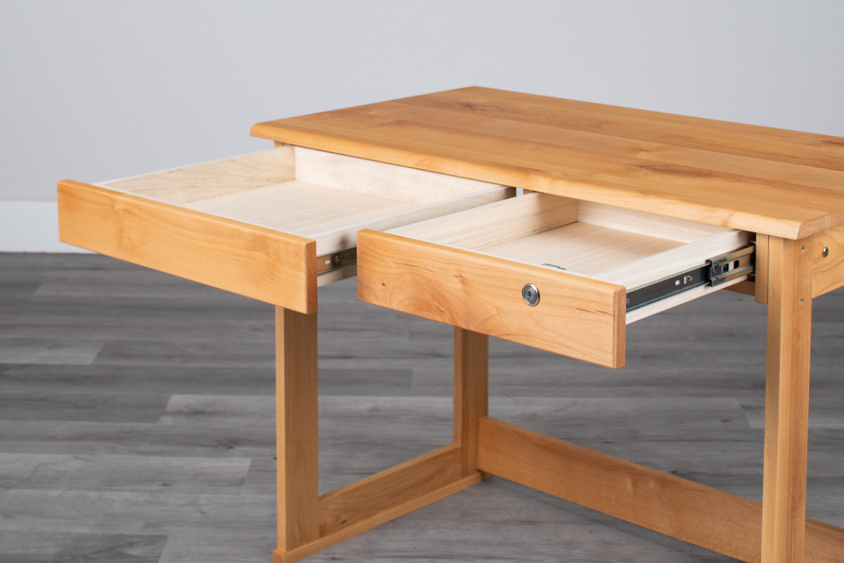 お子様から大人まで幅広く、永くご愛用いただけるアルダー無垢材を使用した、シンプルなデザインのデスクです。引出しはフルオープンで使い勝手が良く、別売りのワゴンやオープンラックなどと組み合わせれば様々なスタイルでお使いいただけます。