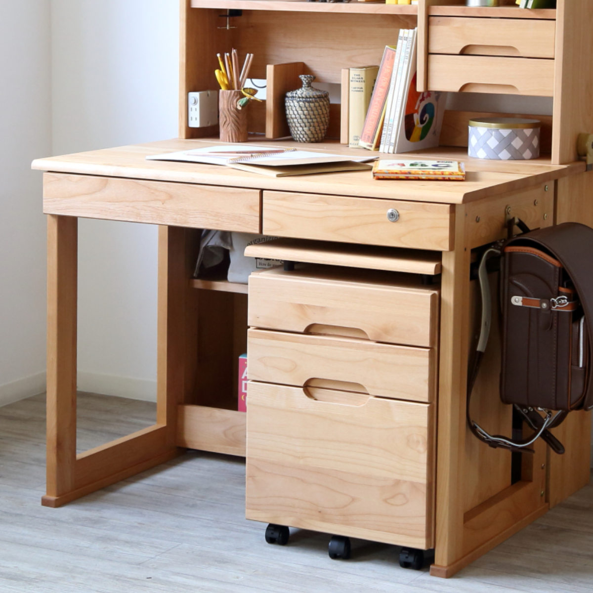 お子様から大人まで幅広く、永くご愛用いただけるアルダー無垢材を使用した、シンプルなデザインのデスクです。引出しはフルオープンで使い勝手が良く、別売りのワゴンやオープンラックなどと組み合わせれば様々なスタイルでお使いいただけます。