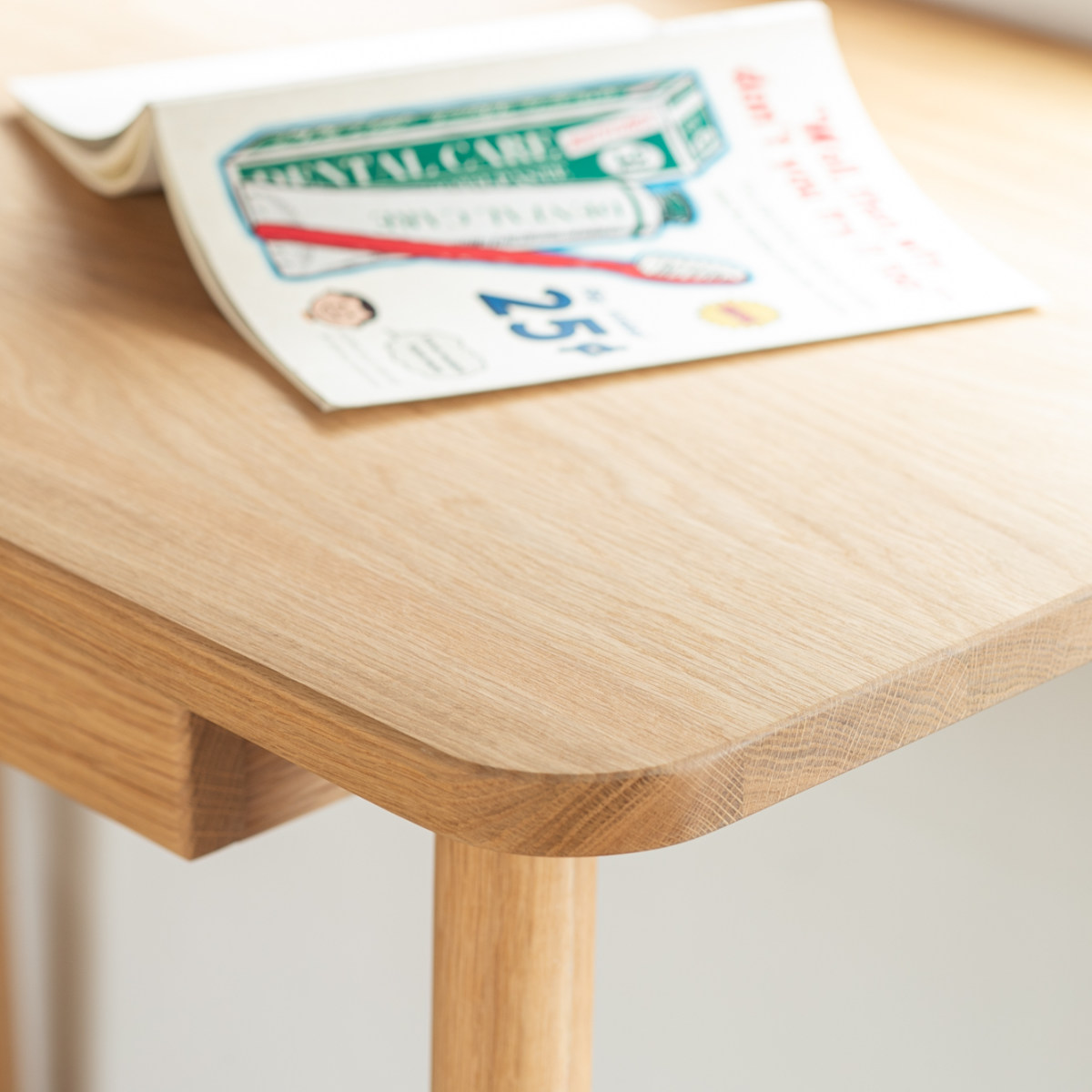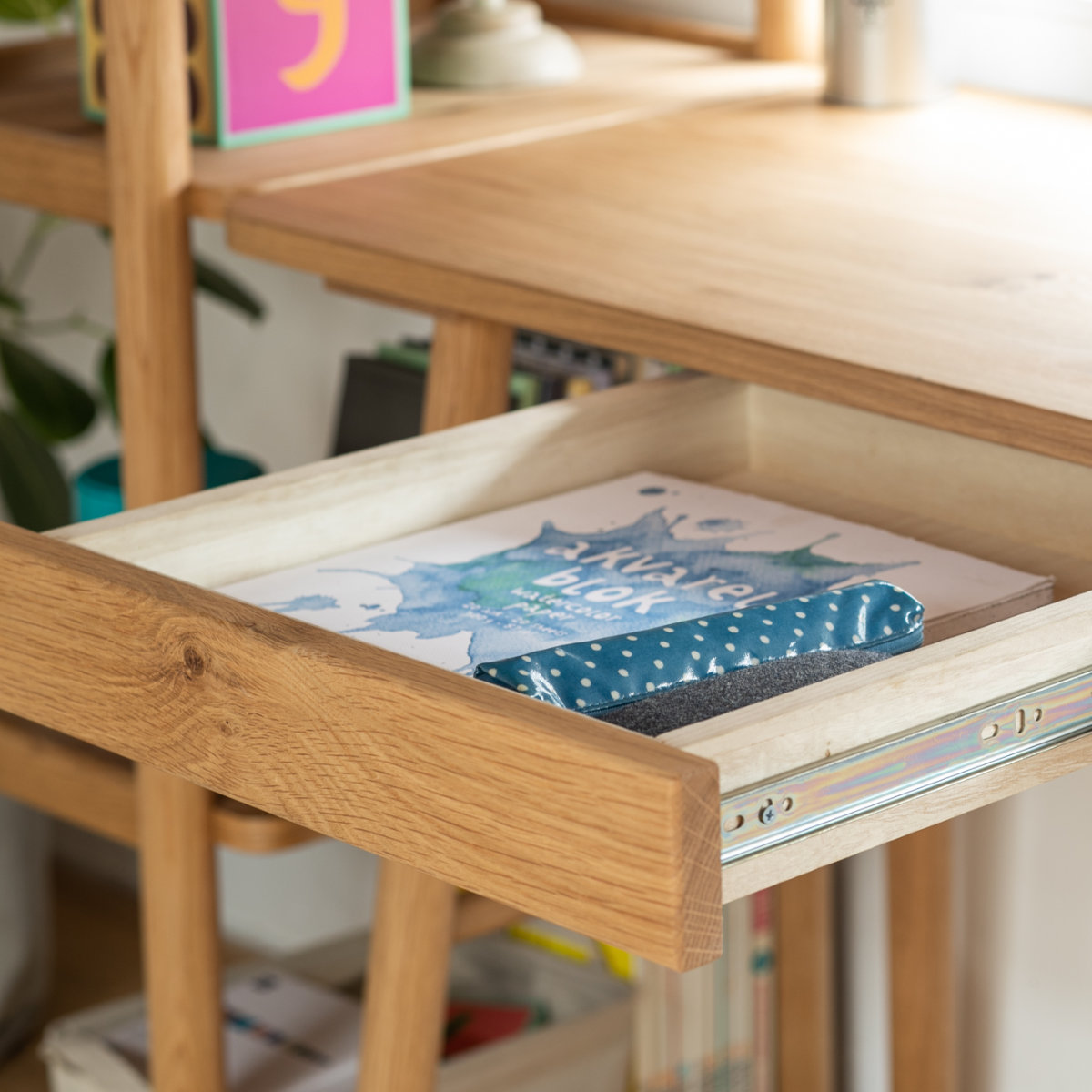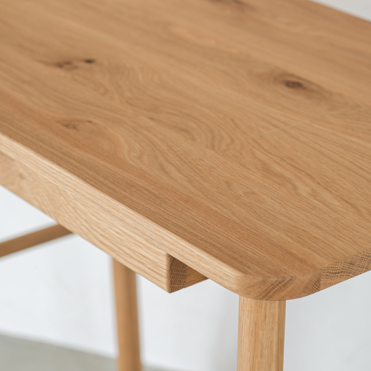 温かみのあるオーク無垢材を贅沢に使用したデスクです。お部屋のちょっとしたスペースに収まるコンパクトなサイズ感なのでキッチン横のスペースなどに設置でき、お子様の学習を見守ることができます。シンプルなデザインのため、年齢や性別を問わずお使いいただけます。