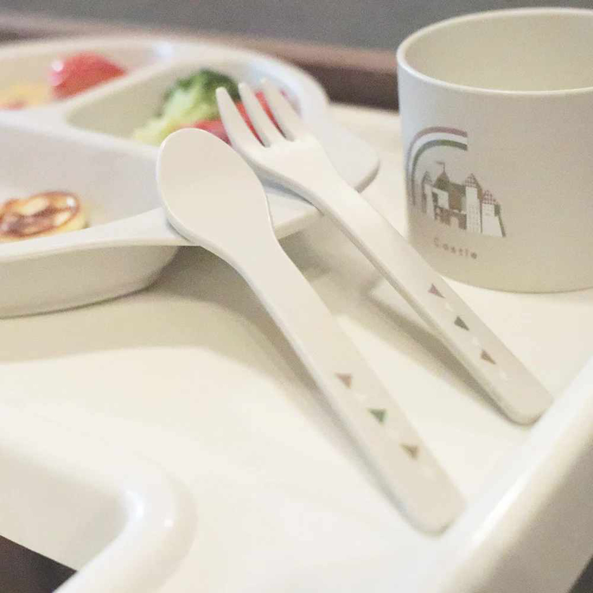 小さなお子さまのお口に合わせたサイズ感で、離乳食時期から自分で食べるようになる時期まで長くお使いいただけます。また、フォークの先端は丸みがあり安心です。