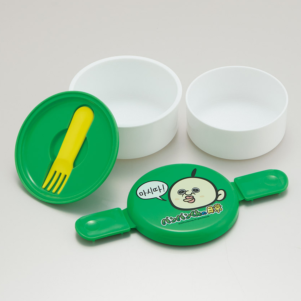 丸型のかわいい2段タイプのランチボックスです。プラスチック製のミニフォーク付きで別でカトラリーを持ち歩かなくても大丈夫です。食べ終わった後は、下段に上段を収納できる入れ子式で、コンパクトに持ち帰ることができます。