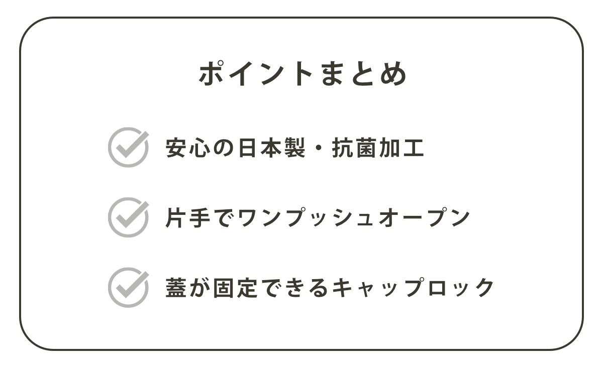 | 材質 | キャップ:飽和ポリエステル樹脂 本体・蓋・ベルト:ポリプロピレン パッキン:シリコーンゴム バネ・ピン:ステンレス |
