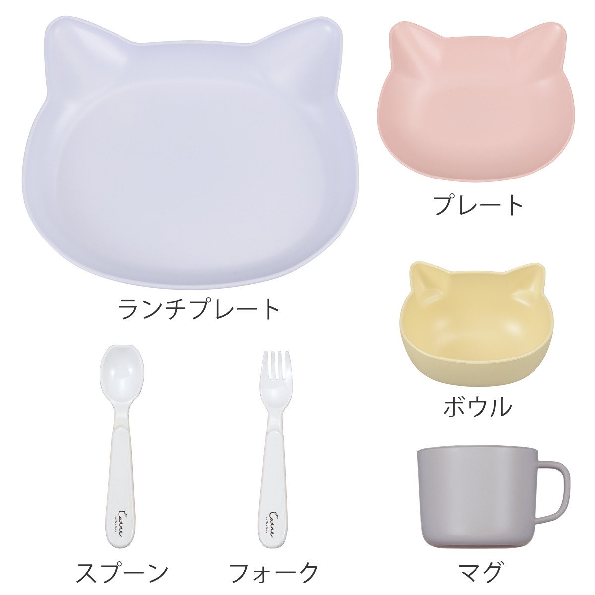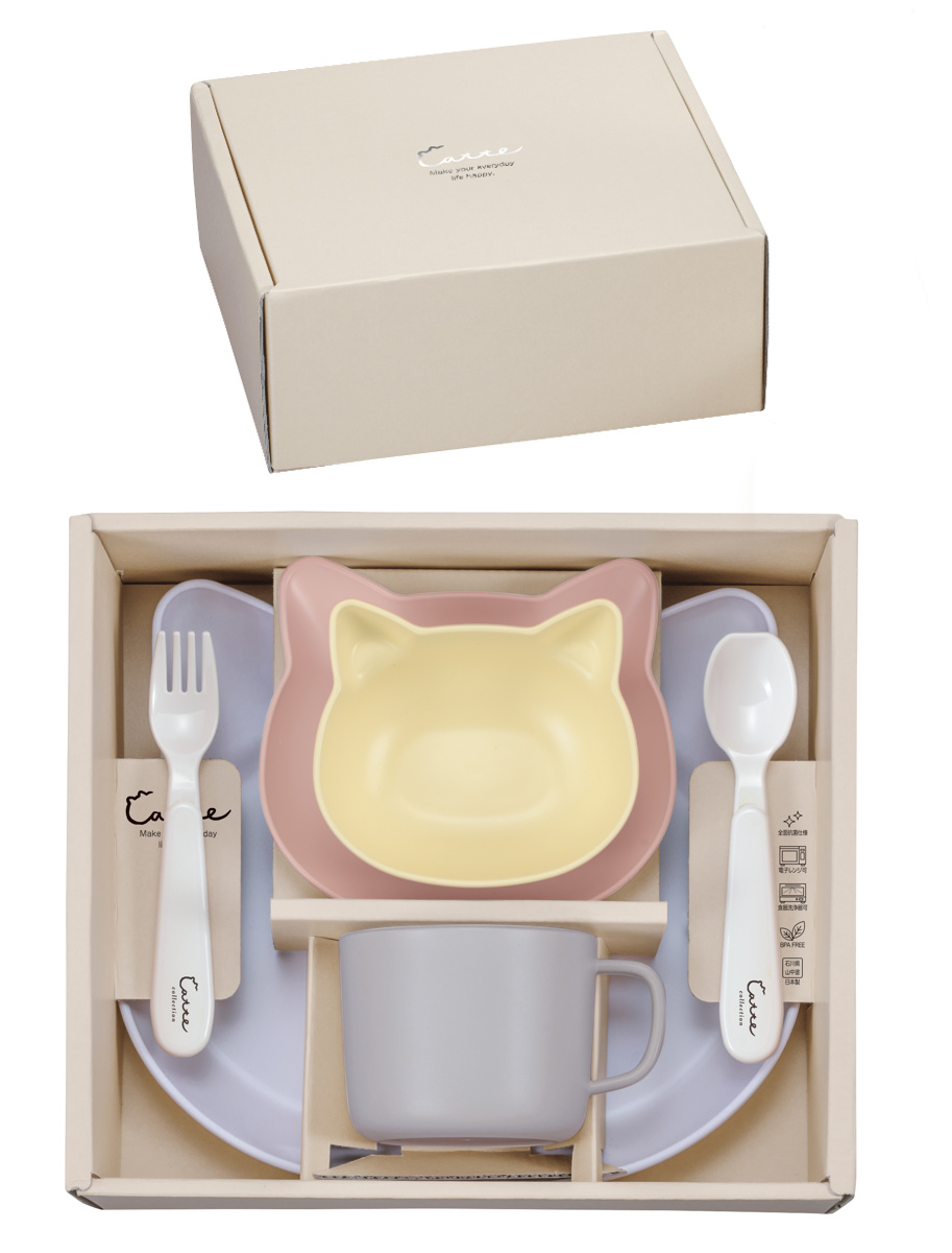 猫のお顔デザインがかわいい子ども用食器です。大人の食器と一緒に食卓に並べてもやさしく馴染むパステルカラーも魅力です。 抗菌加工により、衛生的にお使いいただけます。