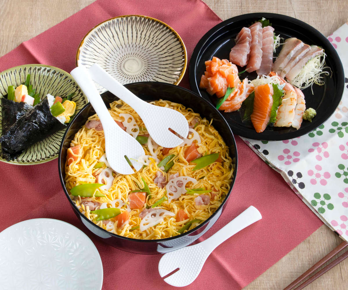 お好きな具材を用意して家族や友人と手巻き寿司が楽しめる、すし桶、具材を並べられるトレー、しゃもじ3本の5点セットです。手巻き寿司だけでなく、ちらし寿司や行事ごとのごちそう作りに最適な寿司桶は、ご家族の集まりやお祝いごとなど特別な日の食卓を彩ります。