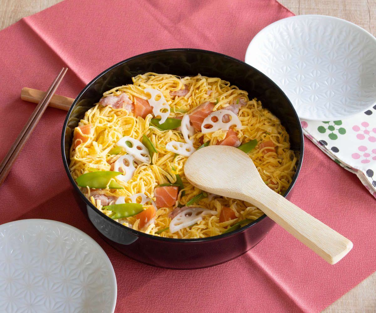寿司桶にちらし寿司を入れると、トレーはオードブルの盛り付け皿として使用できます。
