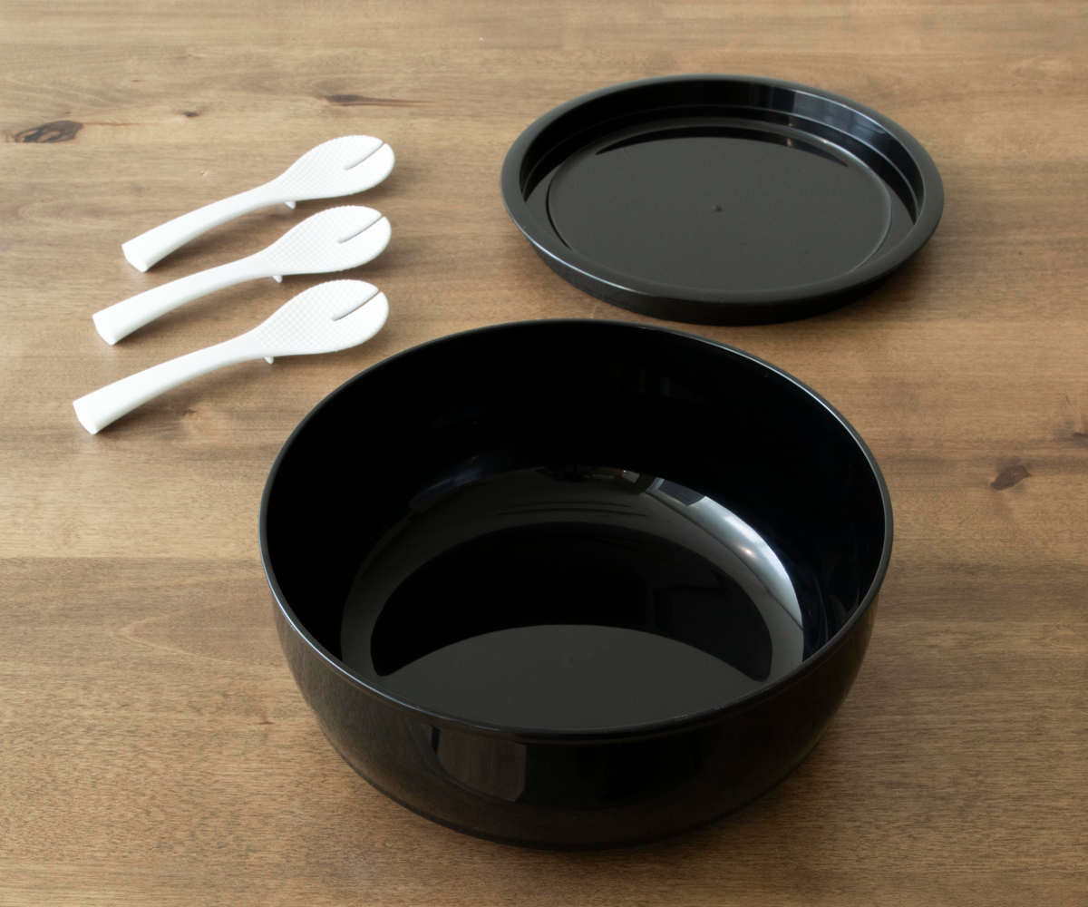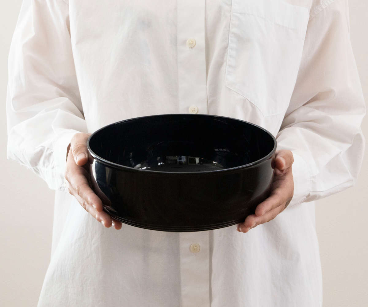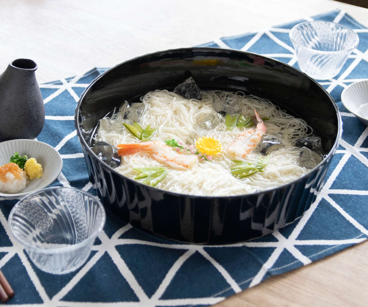 漆器のような上品なデザインで、食卓に温かみを添えます。夏はそうめんの器として、トレーには薬味やおかずを並べて使える便利なセットです。