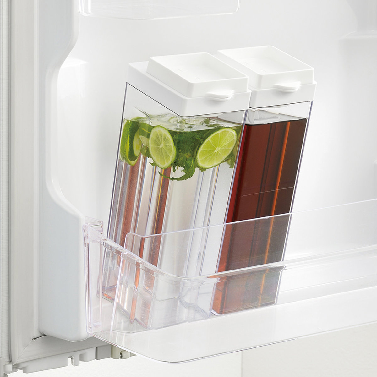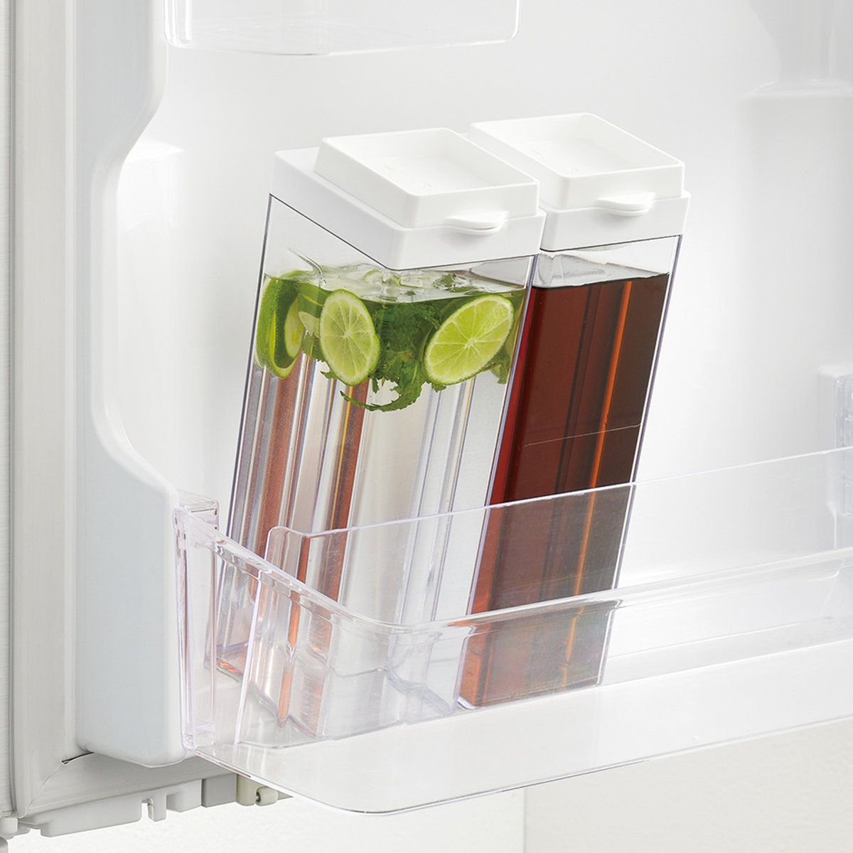 ドアポケットが調味料でいっぱいの時は、横置きにして冷蔵庫の棚にも置けます。無駄なスペースをとらずコンパクトに収納できます。