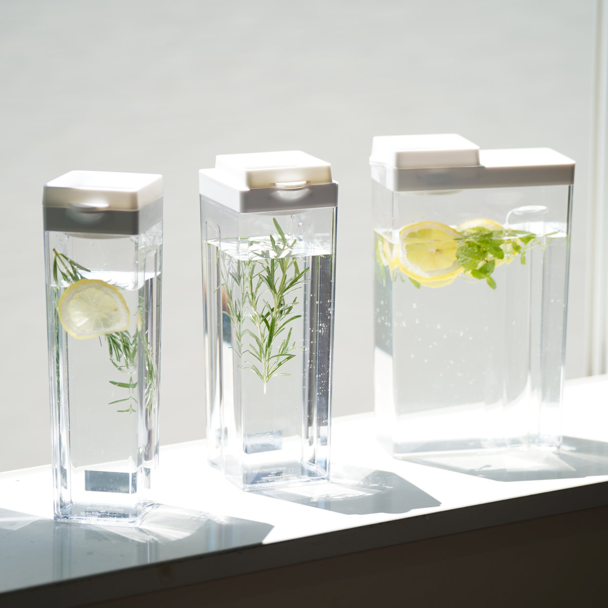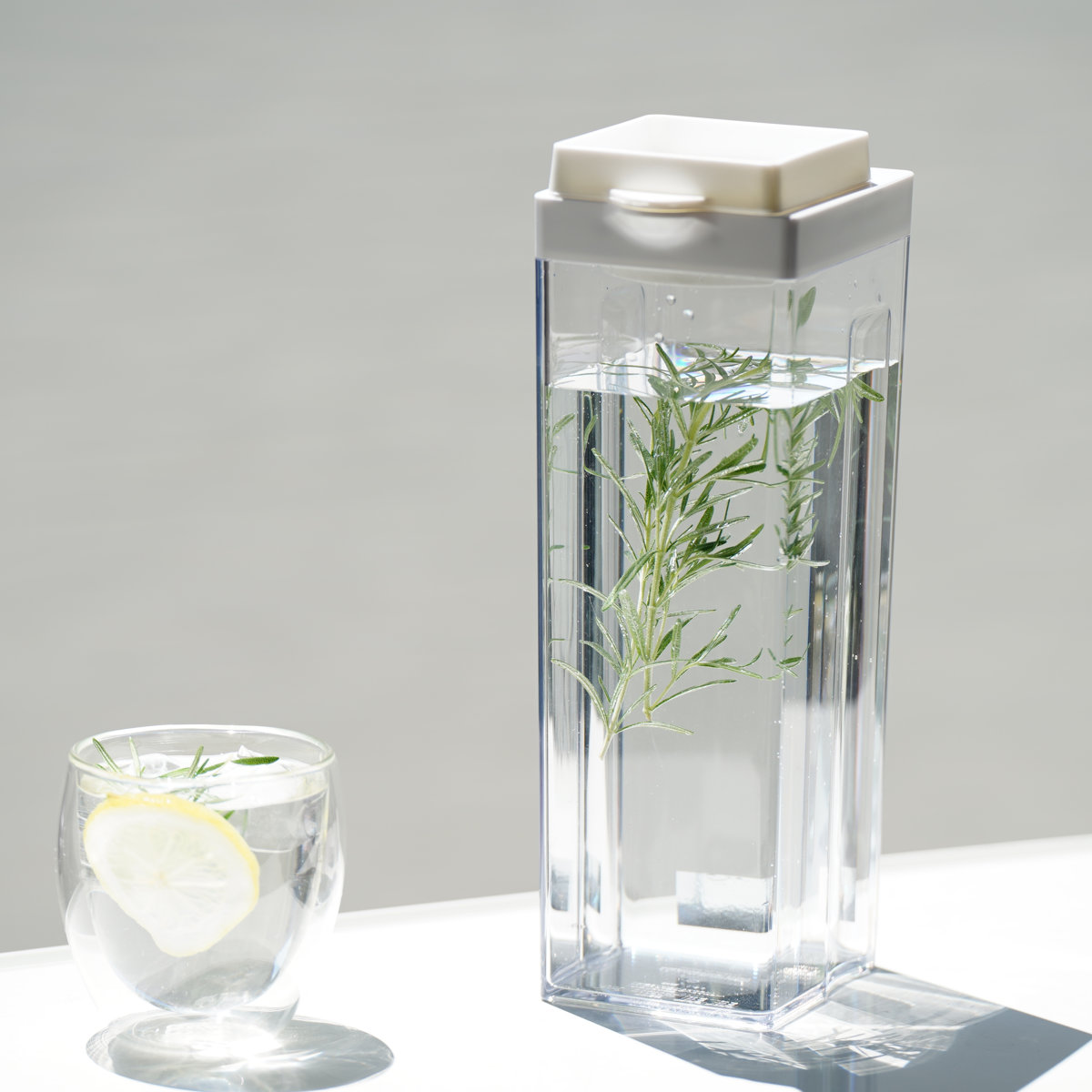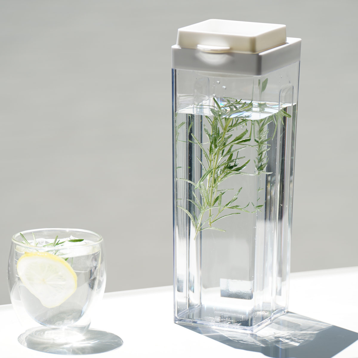 見た目はガラスのような透明感ですが、樹脂製で軽くて割れにくい材質です。使いやすい1.8Lサイズで水出し茶はもちろん、フレーバーウォーターなども作って保存しておけます。