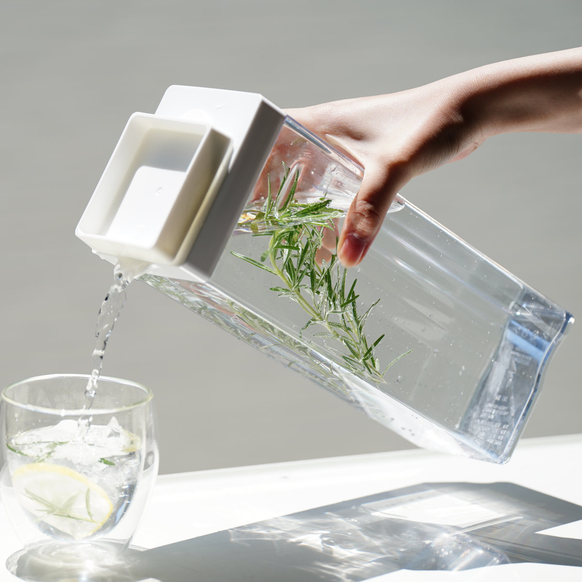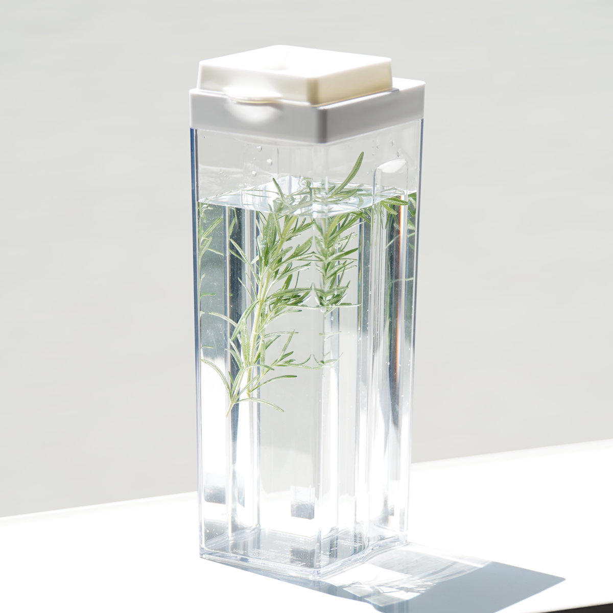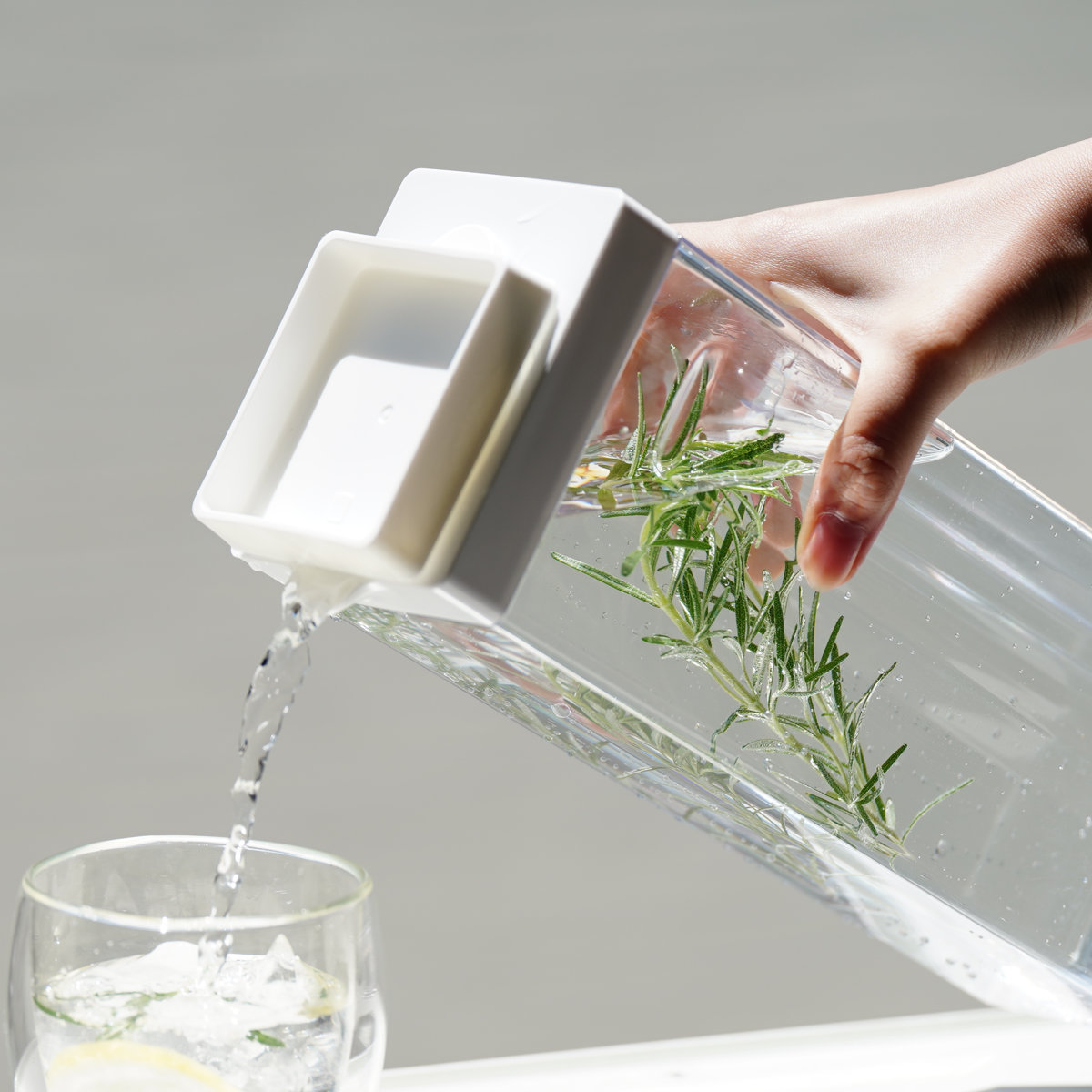 見た目はガラスのような透明感ですが、樹脂製で軽くて割れにくい材質です。使いやすい1.8Lサイズで水出し茶はもちろん、フレーバーウォーターなども作って保存しておけます。