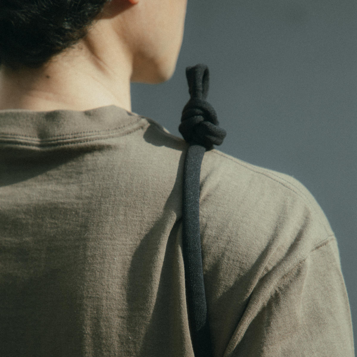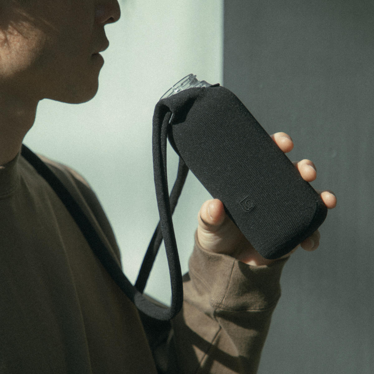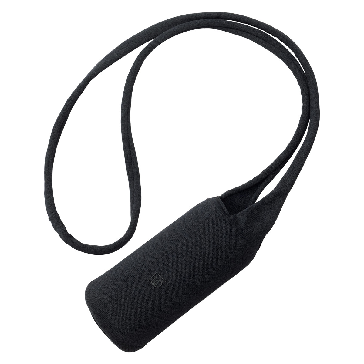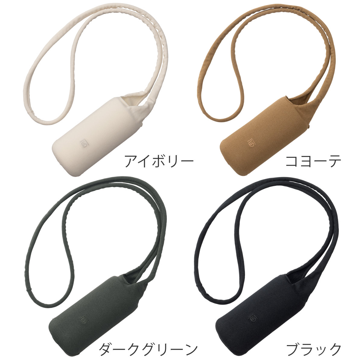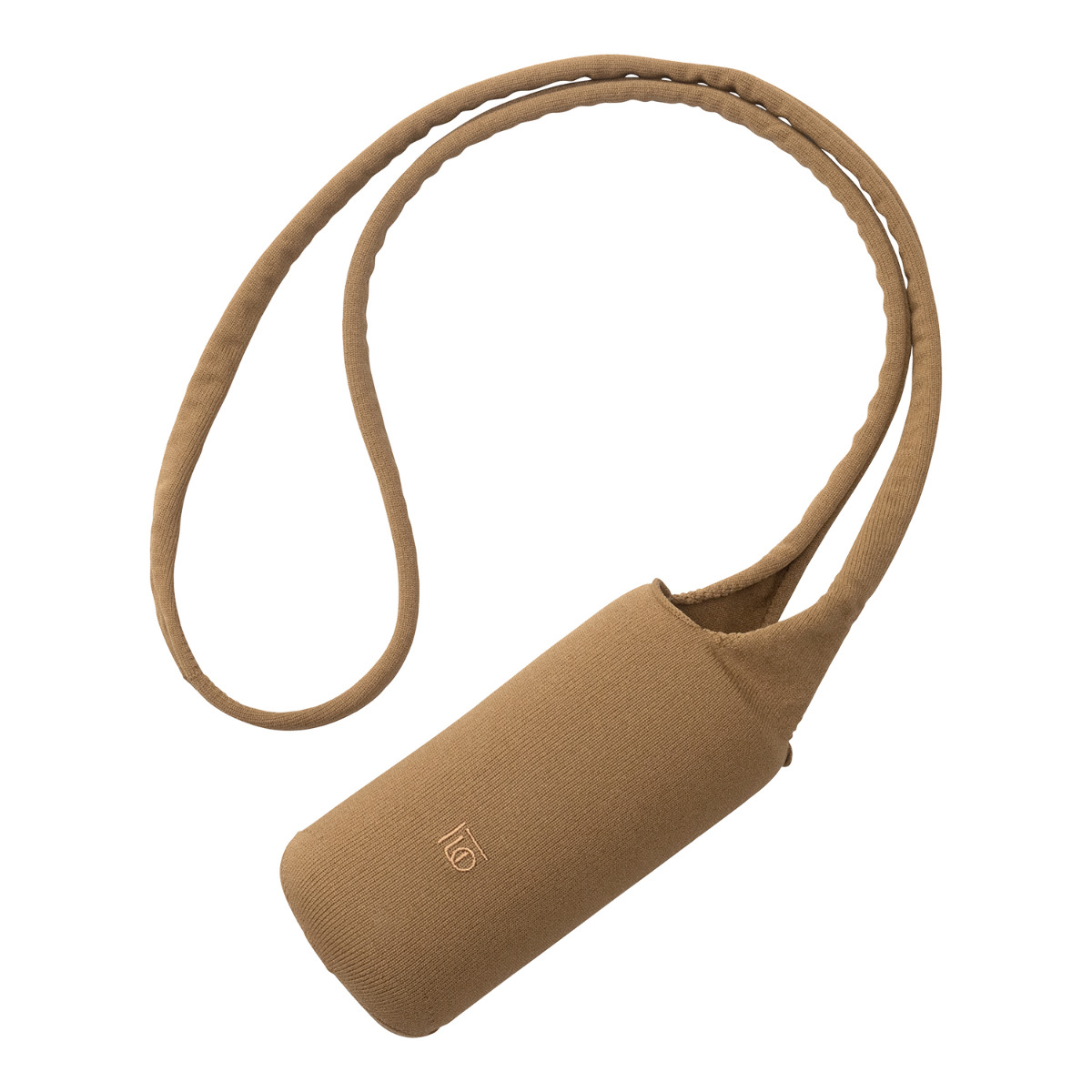 バッグ部分には、ボトルをしっかりとホールドする伸縮性のあるナイロンのニット素材を採用。ストラップ部分は伸びすぎを防ぐため、裏面にポリエステルの糸を編み込み、両端にはタック編みを施しています。