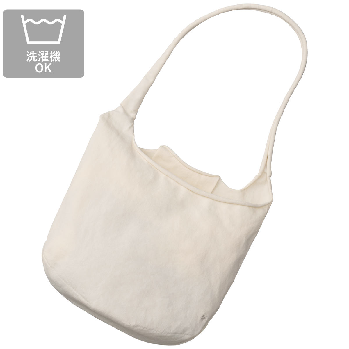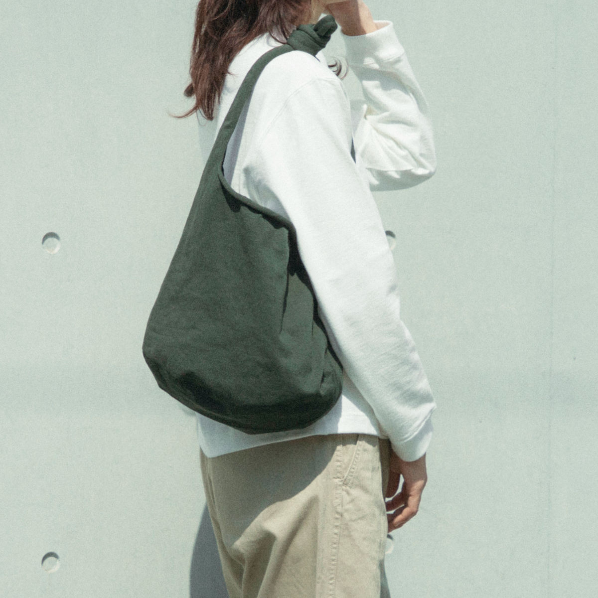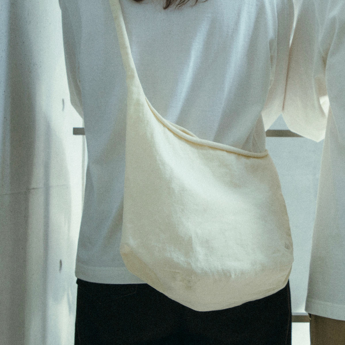 体にフィットし、身にまとうように持ち運べるスリングバッグです。軽くて柔らかな素材と有機的な形状で、持つ人の動きにフレキシブルに寄り添います。伸縮性のあるニット素材で、中身が少なくても多くても収まりのよいデザイン。外出先で荷物が増えても安心です。