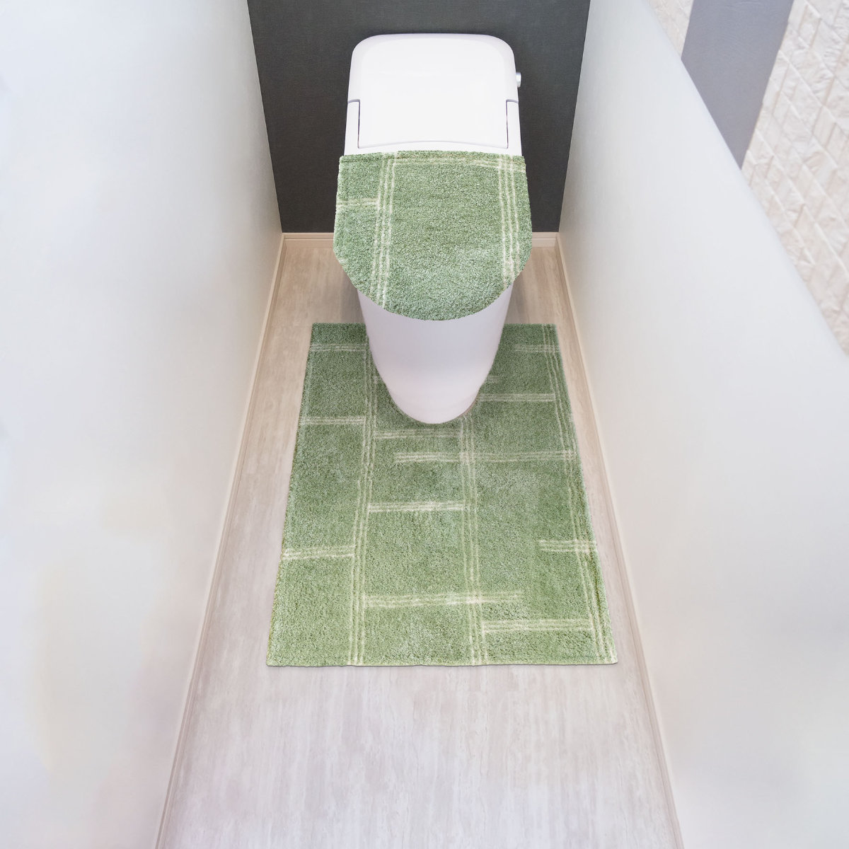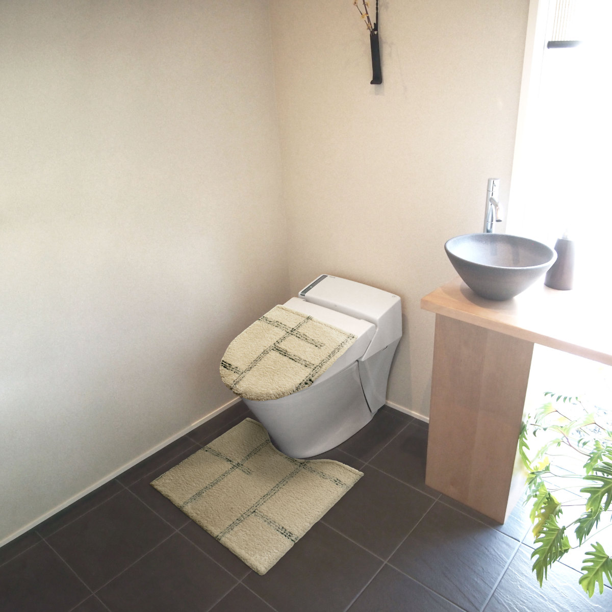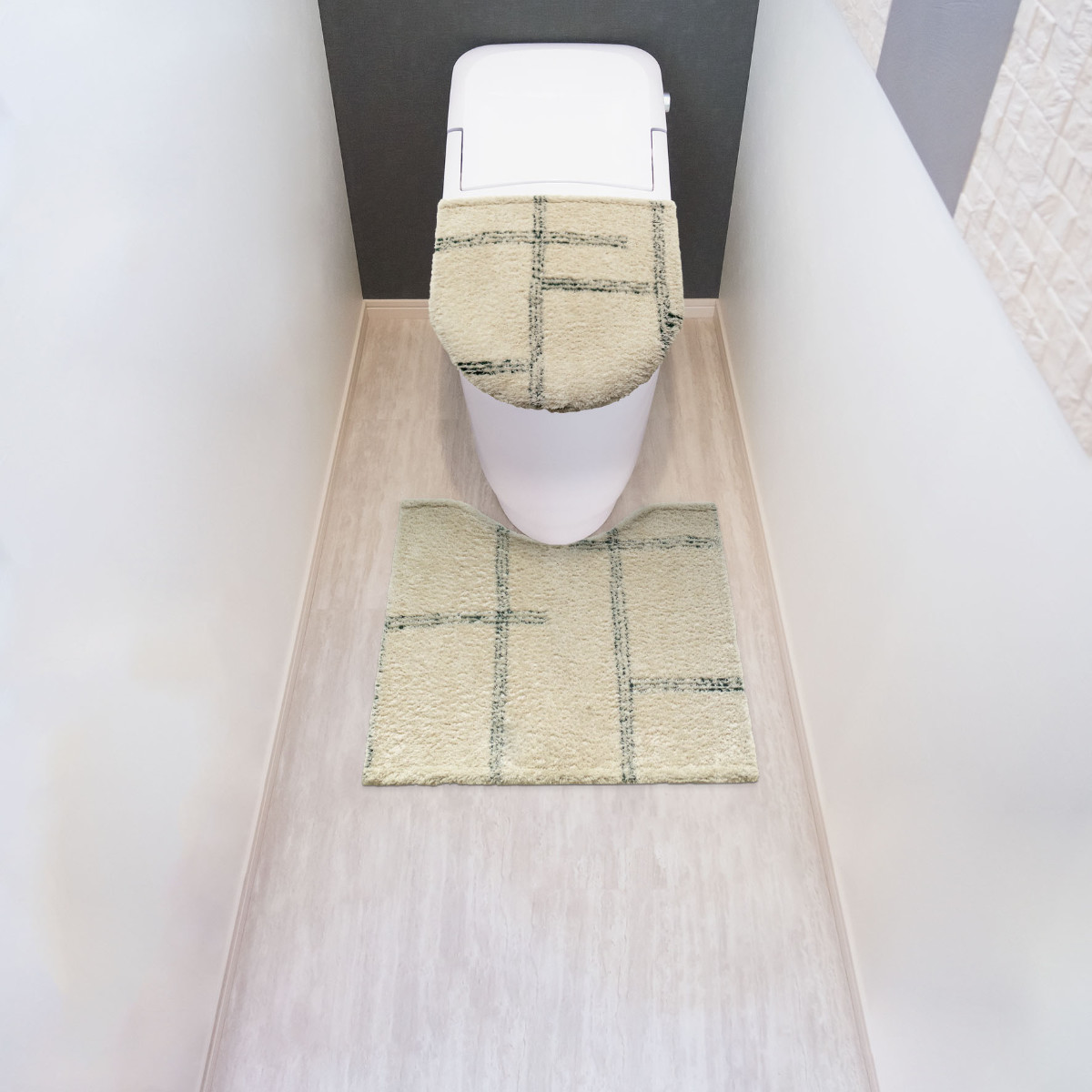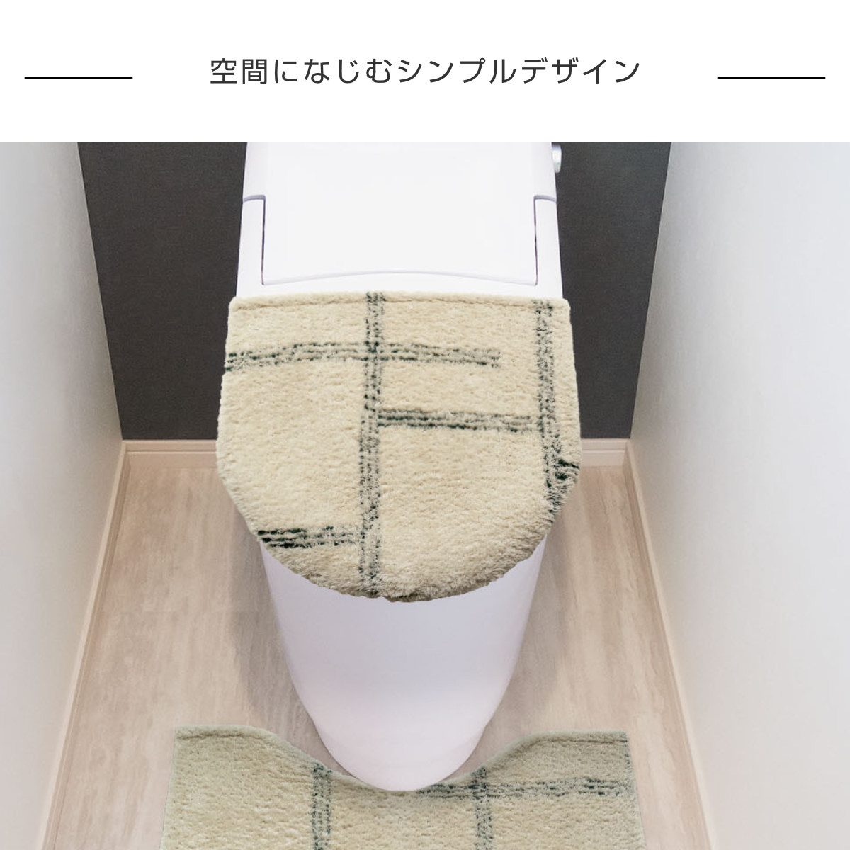 マットやカバー類を同シリーズで揃えることで、トイレ空間に統一感が生まれ、すっきりとした印象に仕上がります。落ち着いたカラーとシンプルなデザインが調和し、清潔感のある心地よい空間を演出します。
