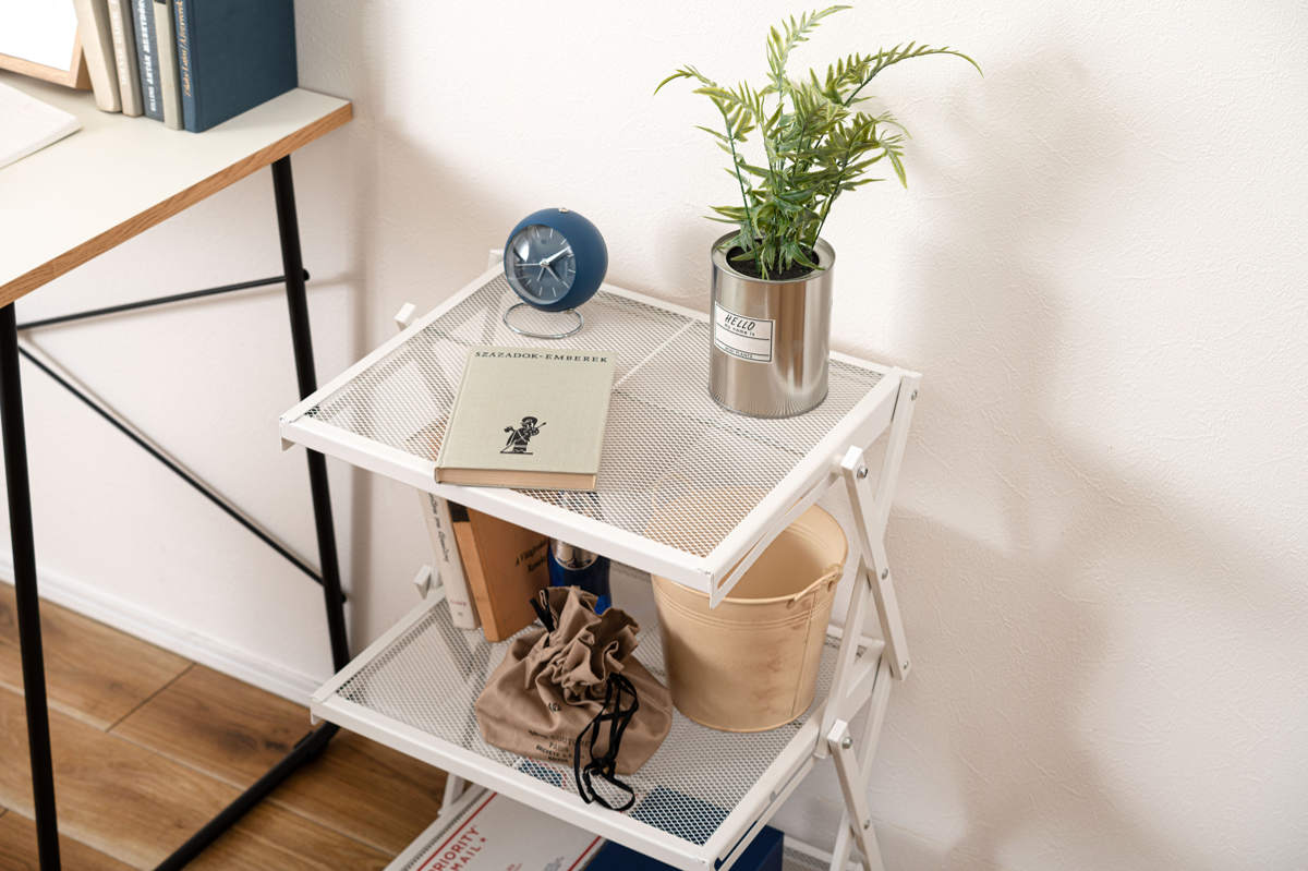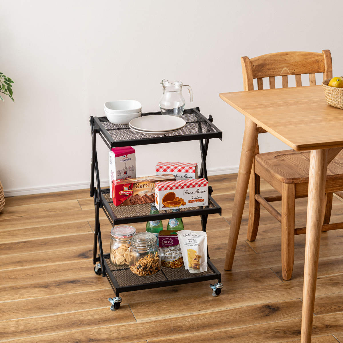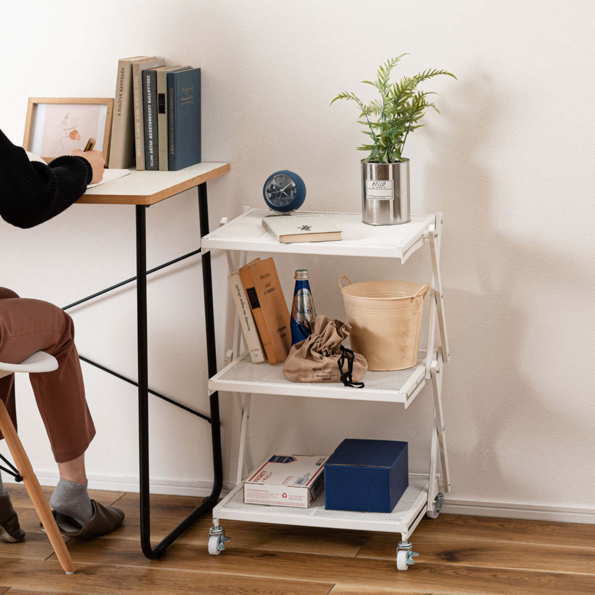 使わない時には折りたたんでおけるフォールディングラックです。幅45cmのコンパクトサイズでありながら、しっかりと収納できる3段のオープンラック仕様で、整理整頓にも魅せる収納にもぴったり。無駄を省いたシンプルなデザインで、様々な用途で使いやすいラックです。