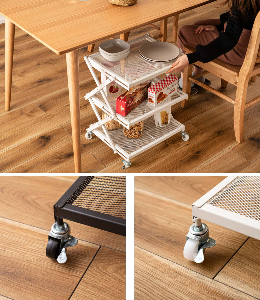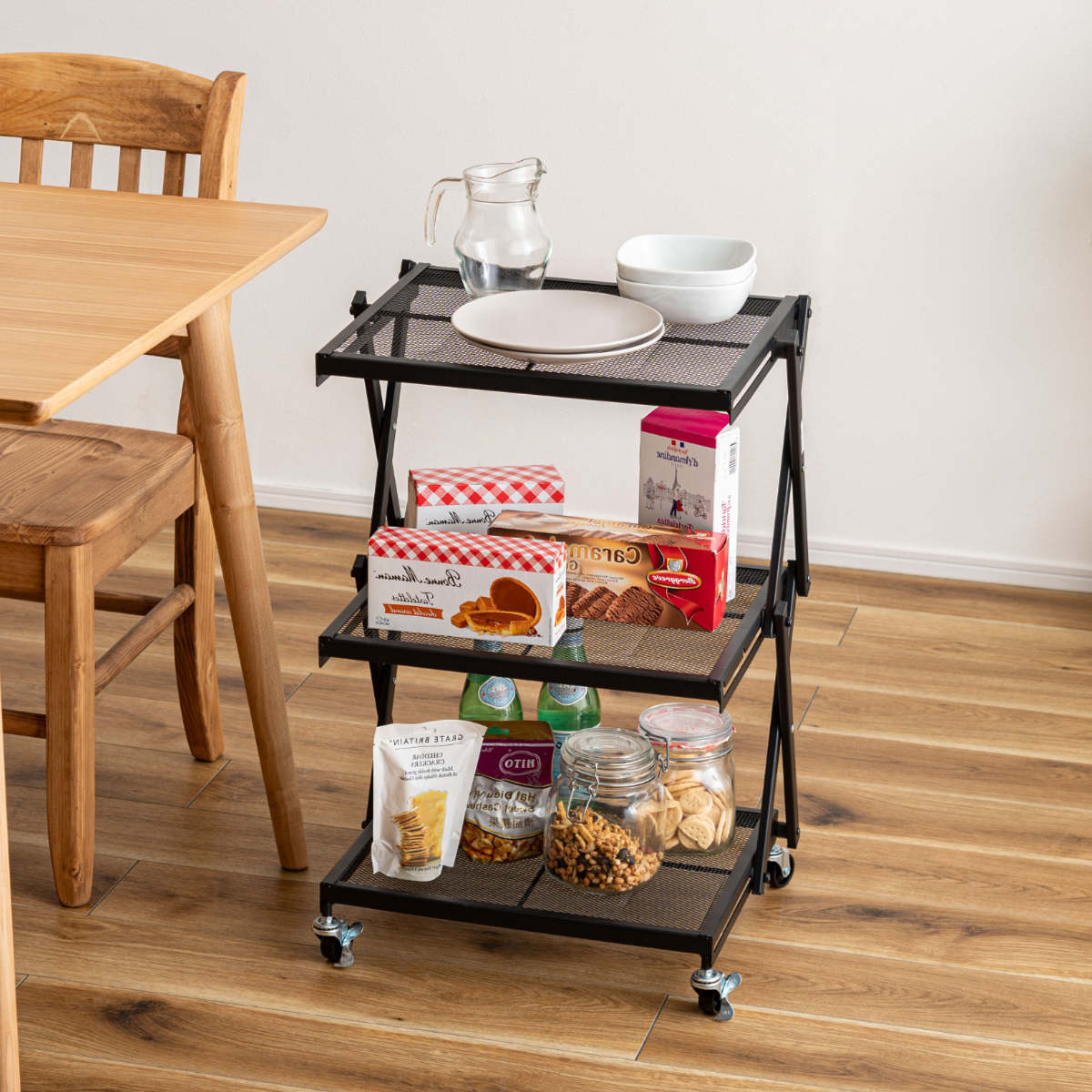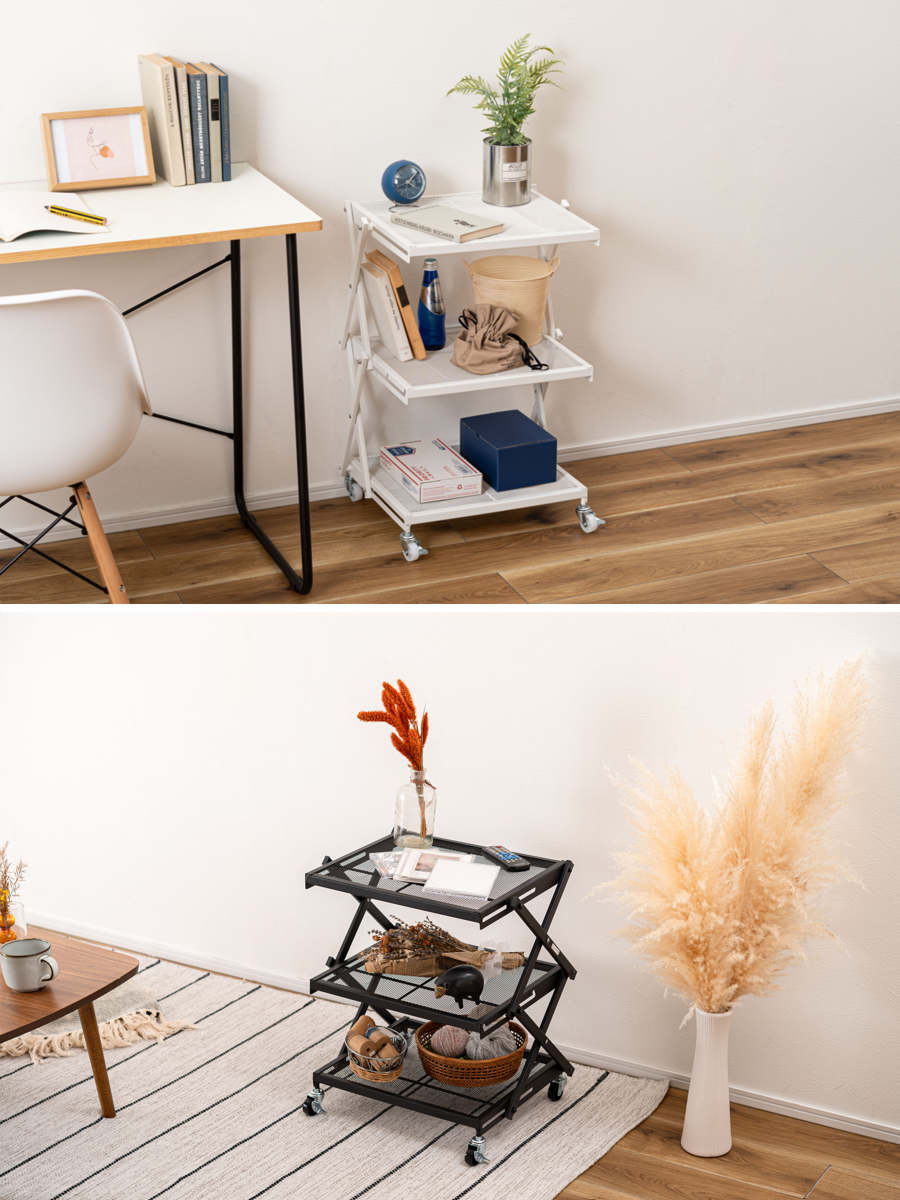 使わない時には折りたたんでおけるフォールディングラックです。幅45cmのコンパクトサイズでありながら、しっかりと収納できる3段のオープンラック仕様で、整理整頓にも魅せる収納にもぴったり。無駄を省いたシンプルなデザインで、様々な用途で使いやすいラックです。