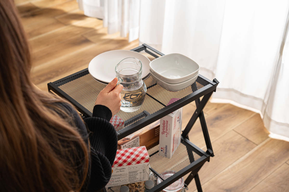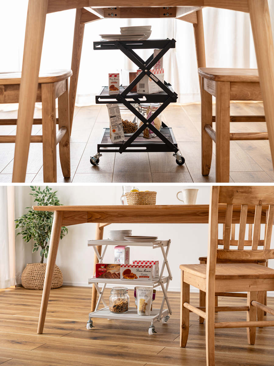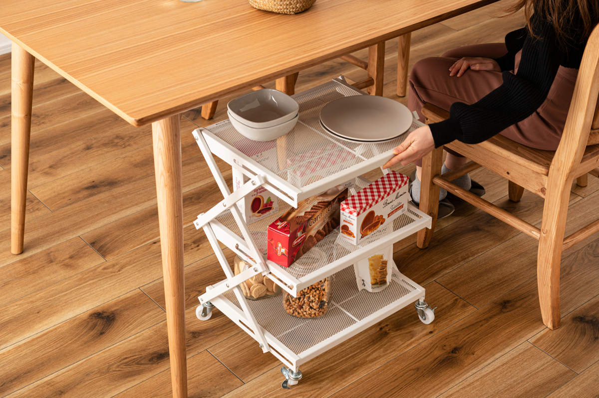 高さを調節すれば、幕板のあるダイニングテーブルの下でも使用することができます。ダイニングでよく使うアイテムを、すぐ手に取れるところに置いておけば時短にも◎