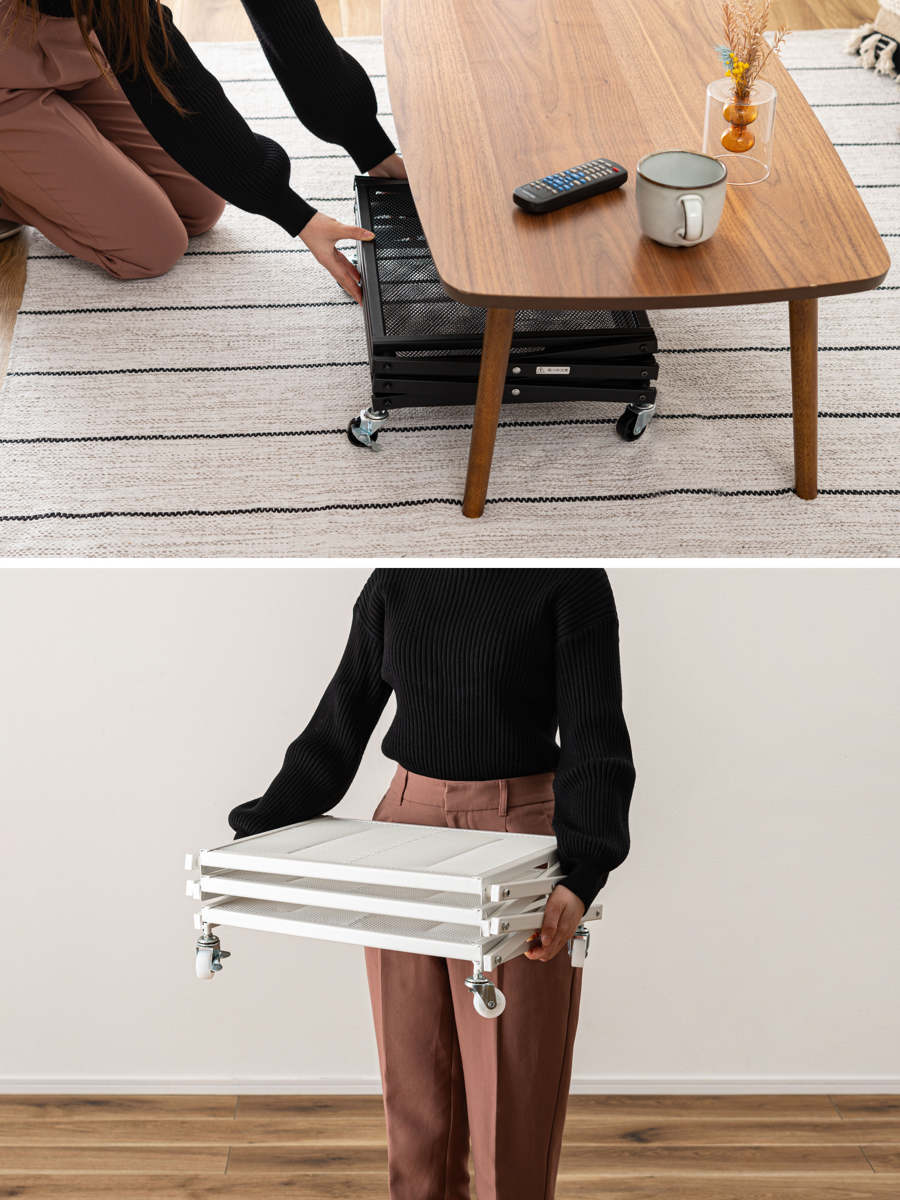 使わないときには、折りたたんで収納が可能。テーブルやソファの下などの、ちょっとした隙間に入るコンパクト仕様です。重さ4.5kgと軽量なので、持ち運びが楽々。