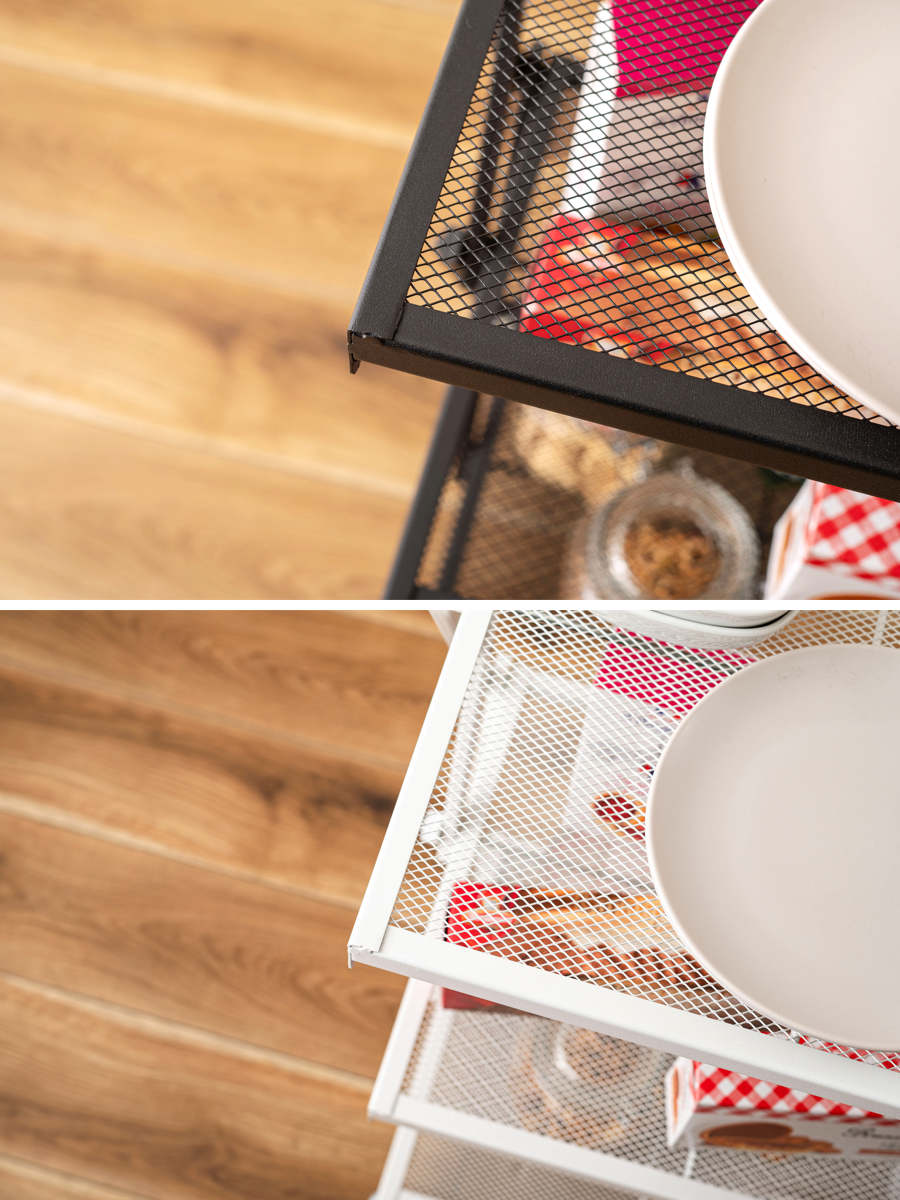 天板は通気性の良いメッシュ仕様なので、湿気の多いキッチンや洗面所にもぴったりです。食品のストックや、タオルの収納におすすめです。