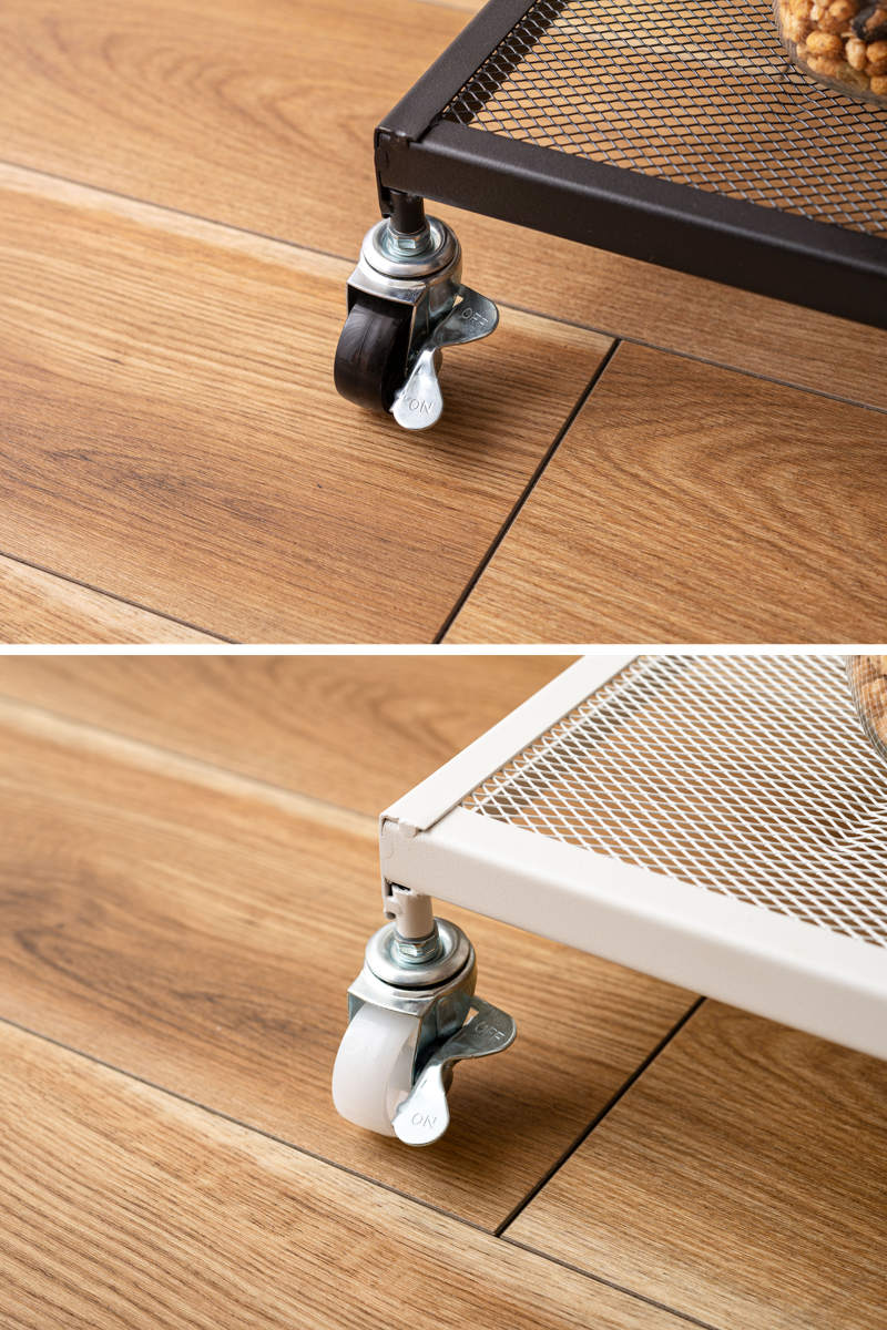 本体カラーに合わせたキャスター付きで、テーブル下から引き出す際やお部屋間の移動がスムーズです。前輪にはストッパーが付いているので、固定ができて安心。