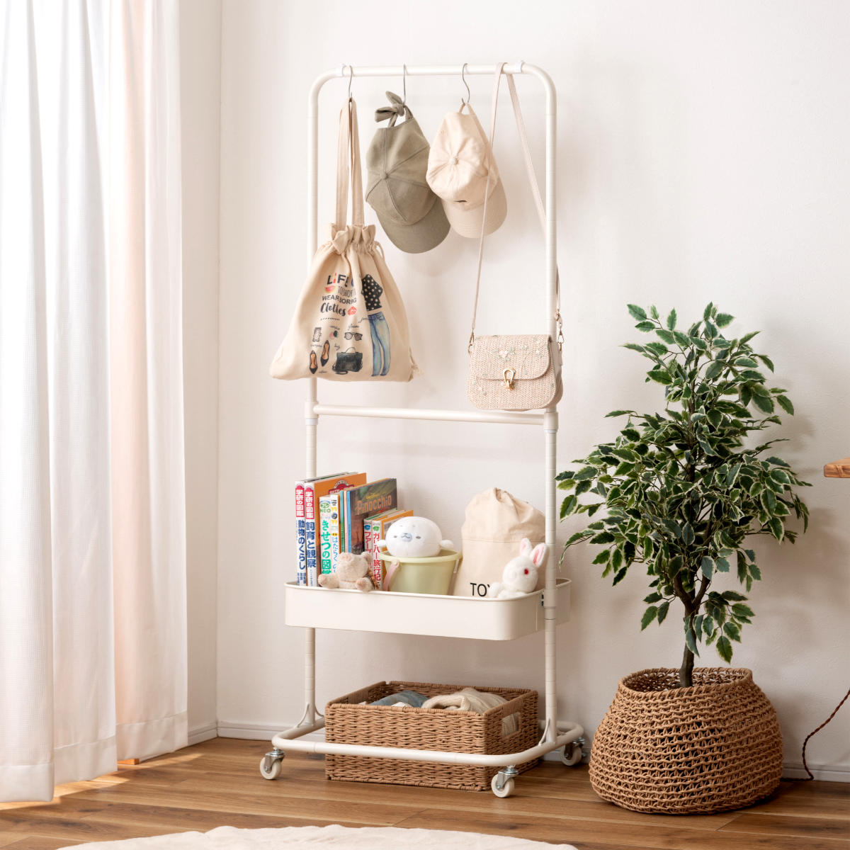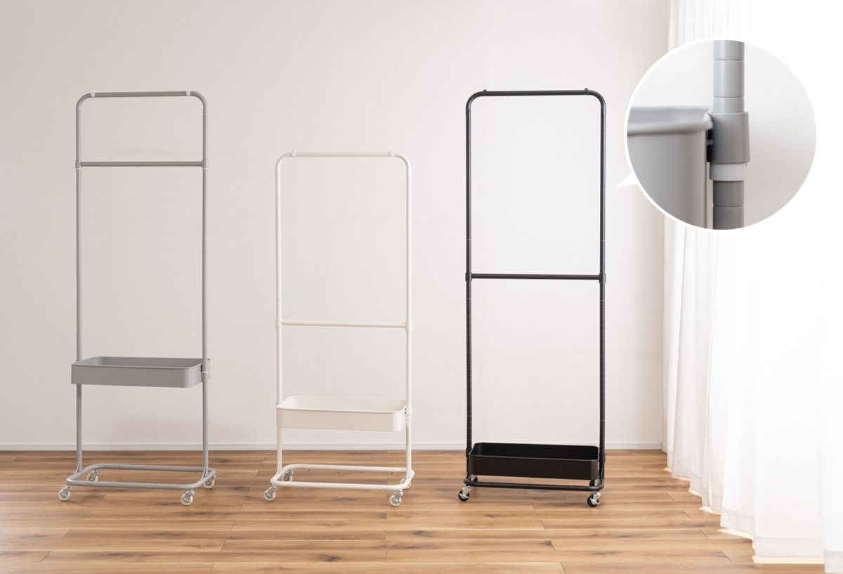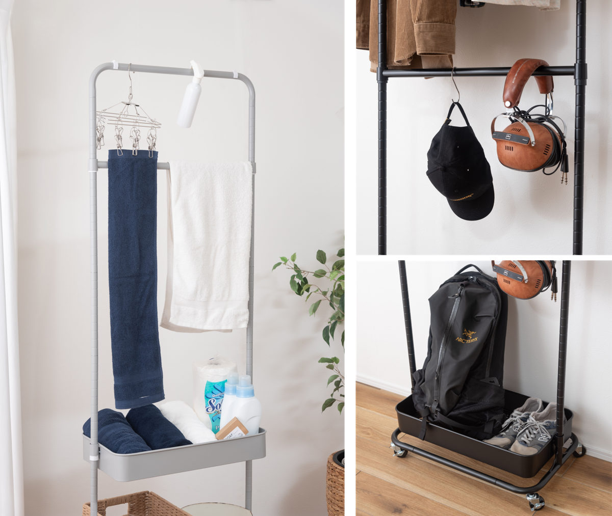 中間のハンガーとトレーも、お好みで高さの調節ができます。お洋服やバッグ、小物をまとめて収納したり、ランドリーでの使用もおすすめ。