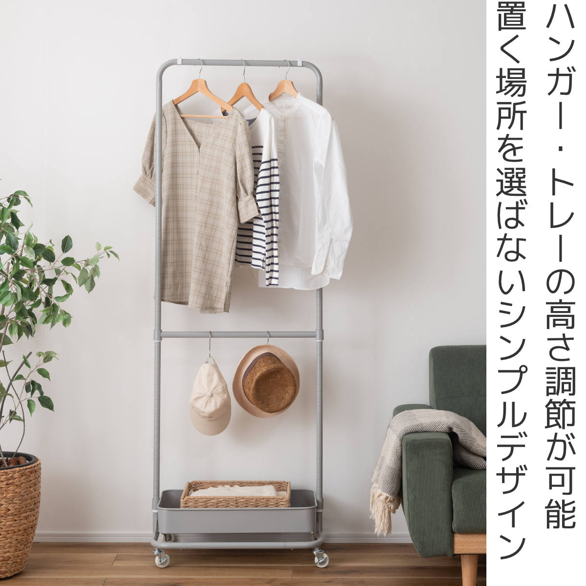 シンプルなデザインで、置き場所を選ばないハンガーワゴンです。本体の高さだけでなく、中間のハンガーやトレーの高さも調節が可能で、用途に合わせた自由な使い方ができます。