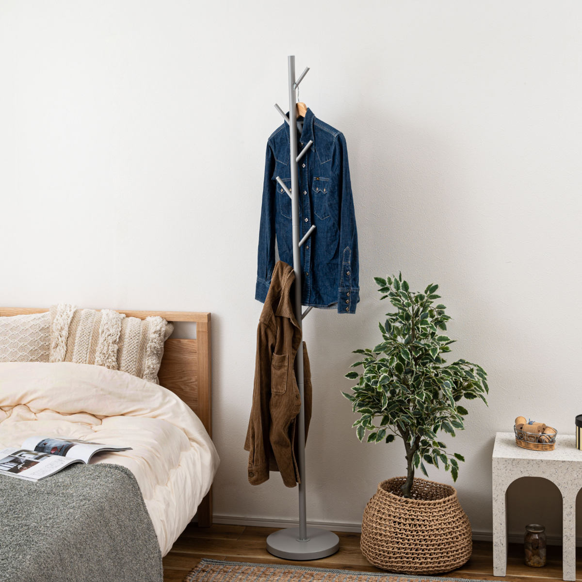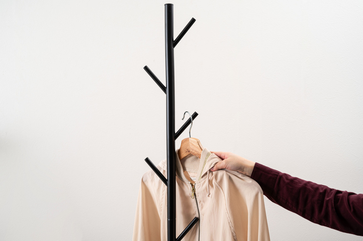 場所を取らないスリムな設計、シンプルデザインのポールハンガー