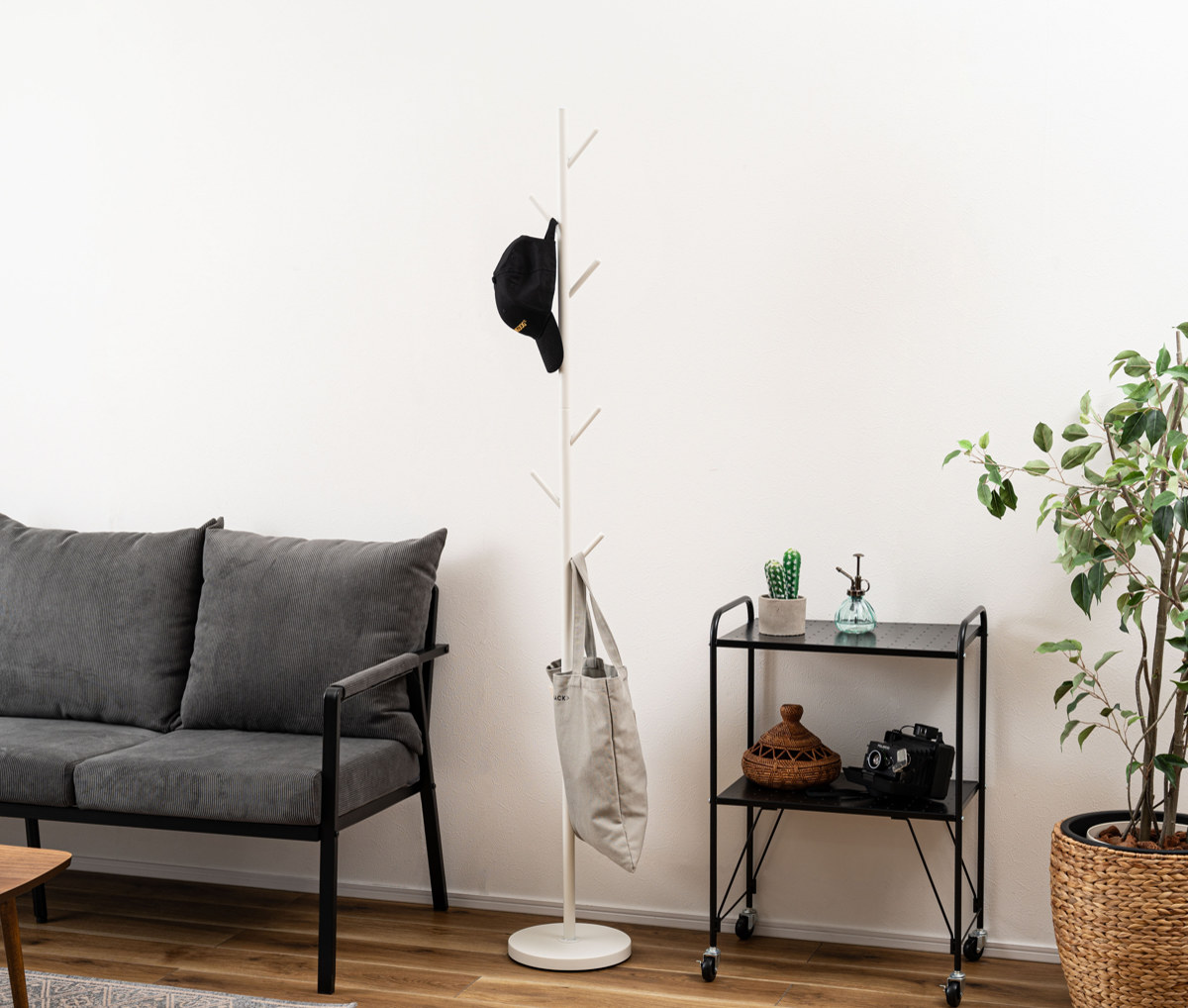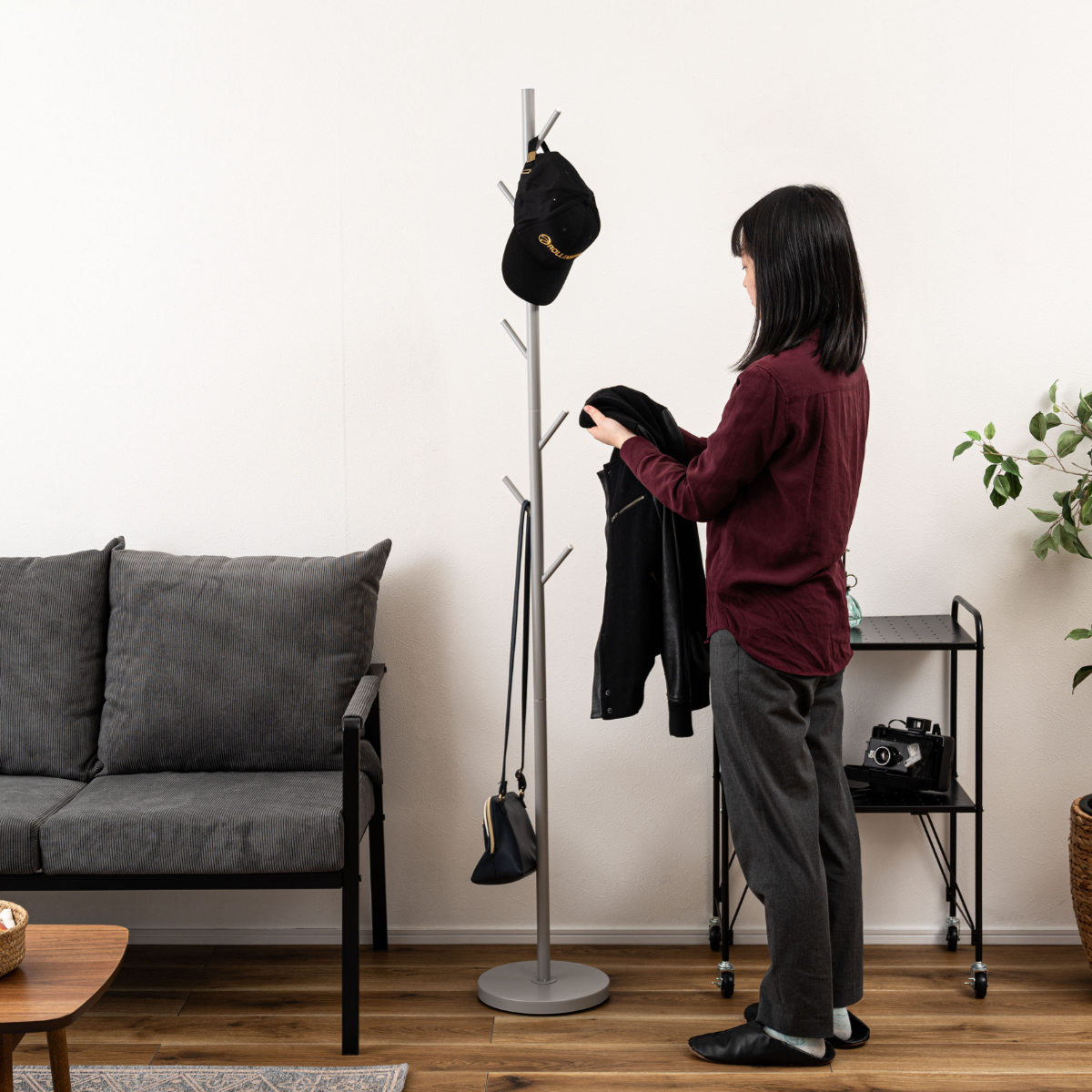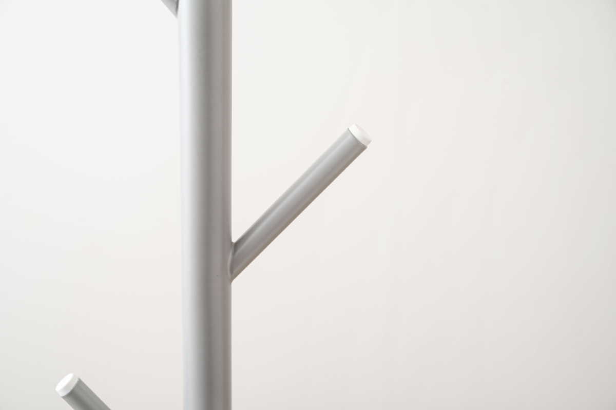 置く場所を選ばないスリムなポールハンガーです。シンプルですっきりとしたデザインで悪目立ちせず、様々な場所で活躍します。斜めに伸びた7本のフックには、カバンやコート、バッグなどを掛けられます。