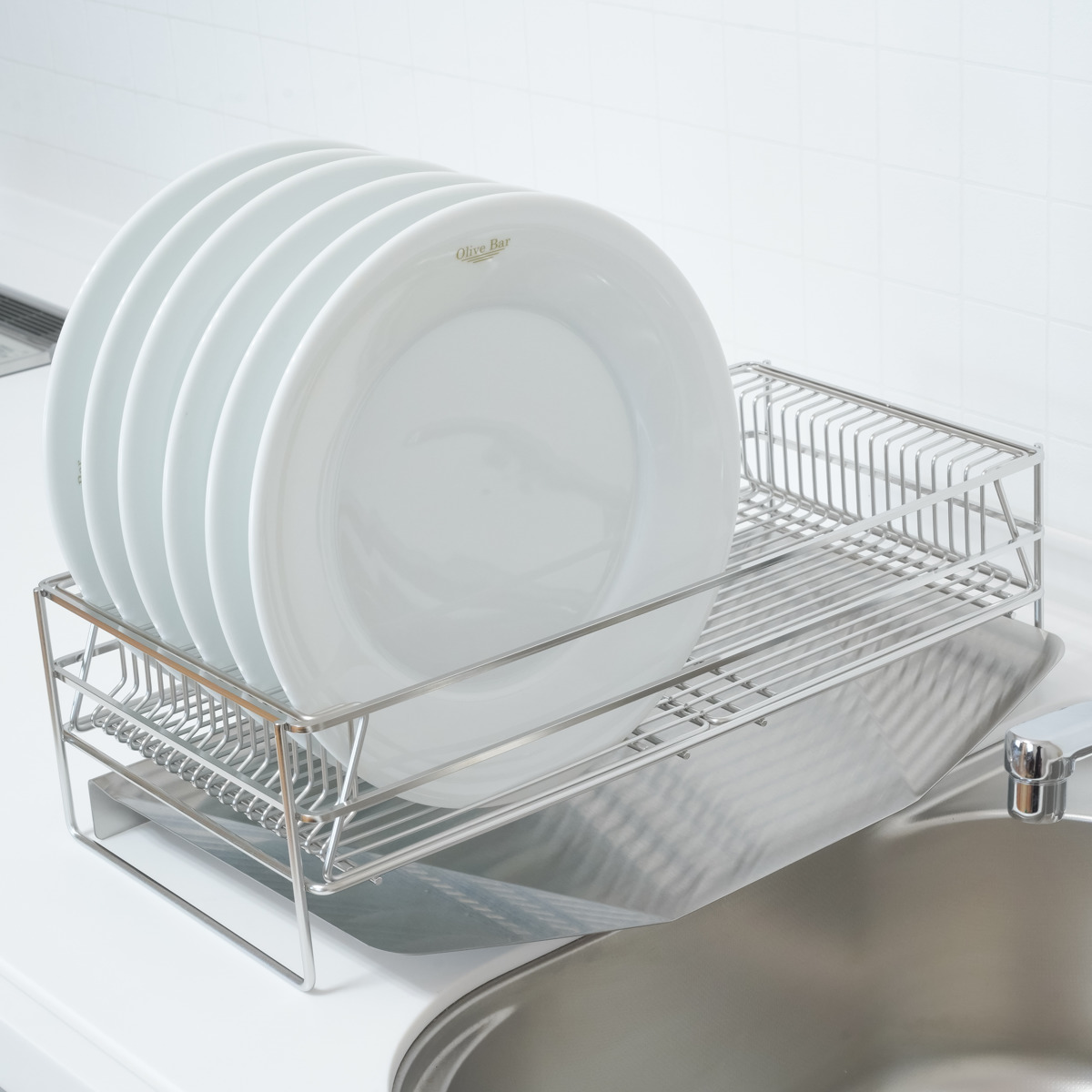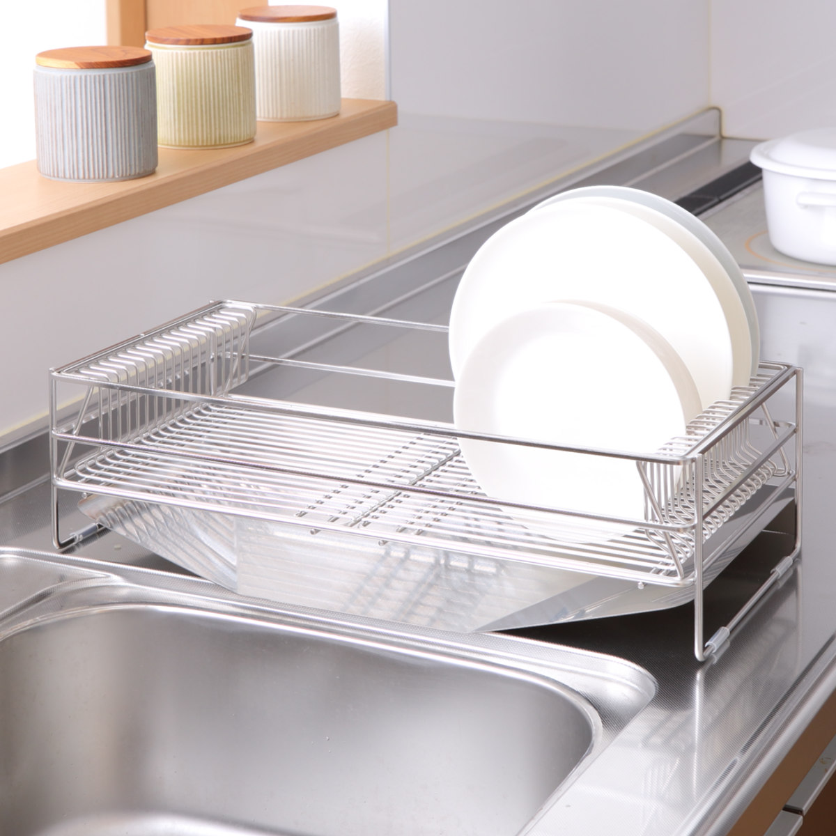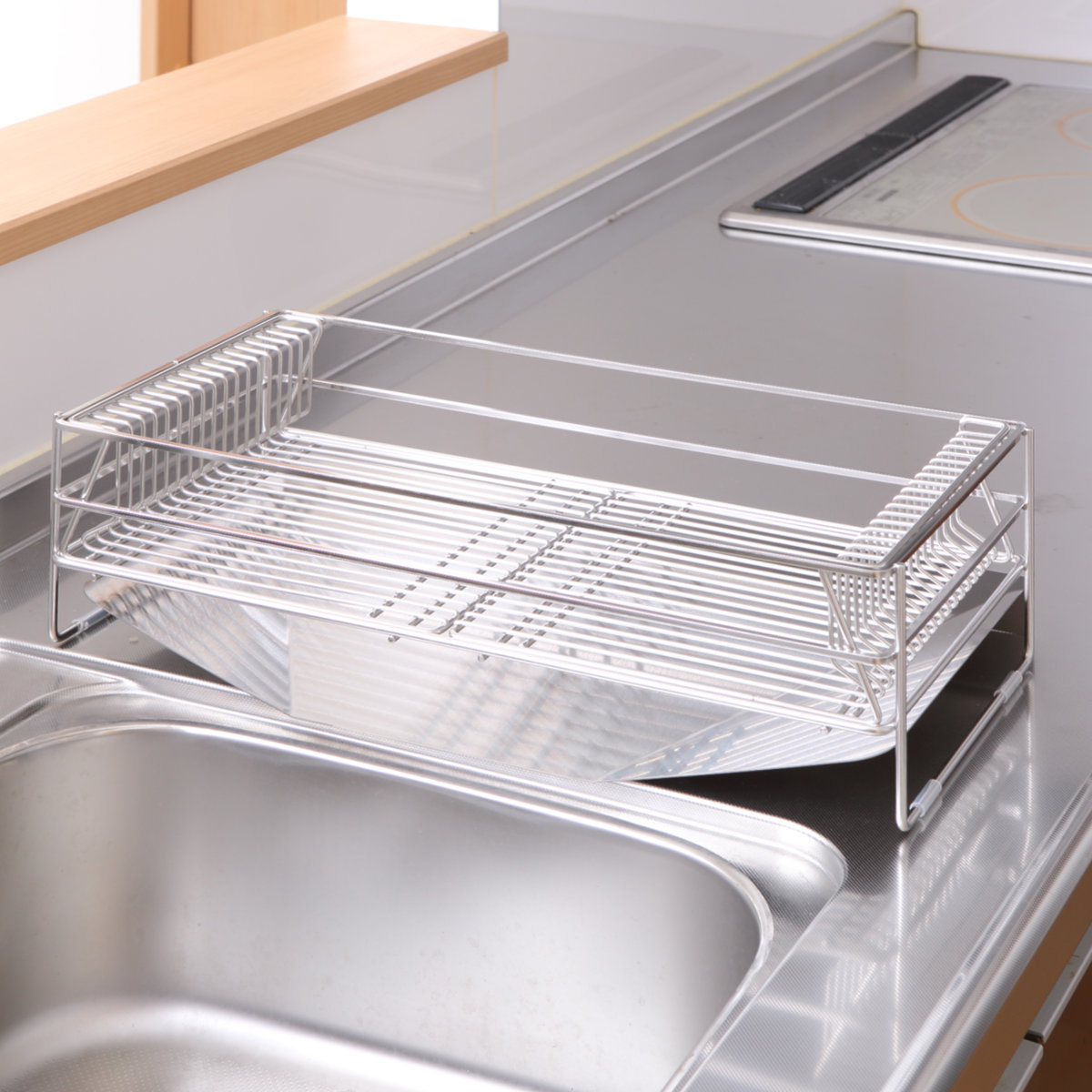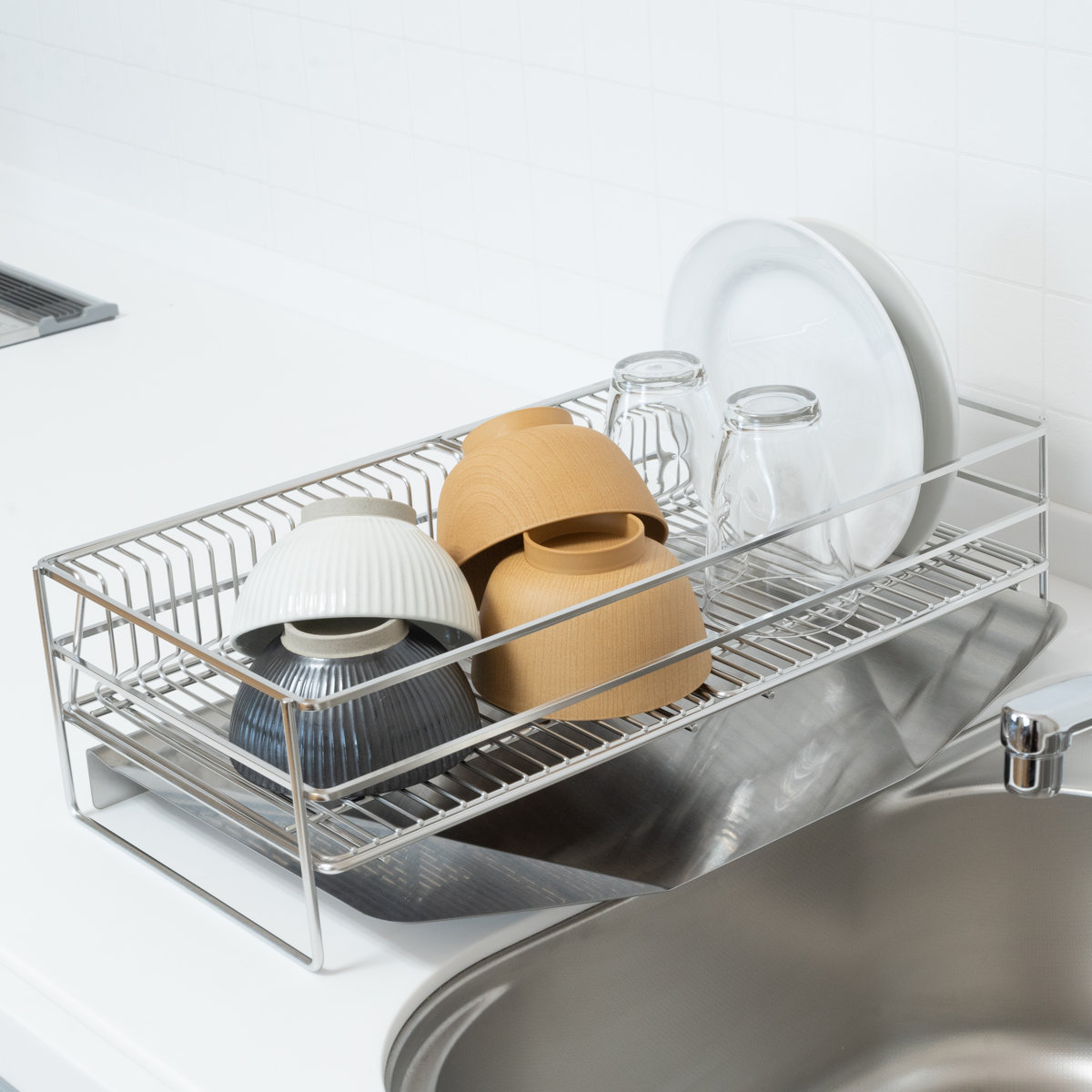 シンプルでスタイリッシュなデザインに加え、機能性にも優れた水切りかごです。ワイヤータイプのため汚れがたまりにくく、水切れも良好です。大きな皿も乾きやすく快適に使えます。