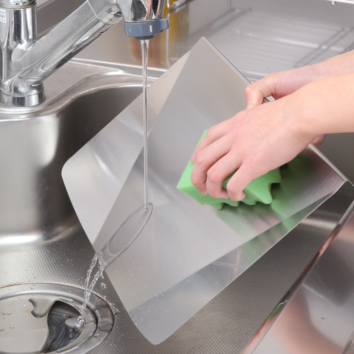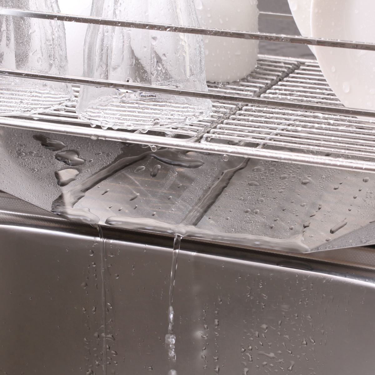 食器から落ちた水が自然にシンクに流れる傾斜トレーで排水の手間がいりません。水が溜まることで発生する水アカやヌメリを予防し、いつも清潔に保つことができます。
