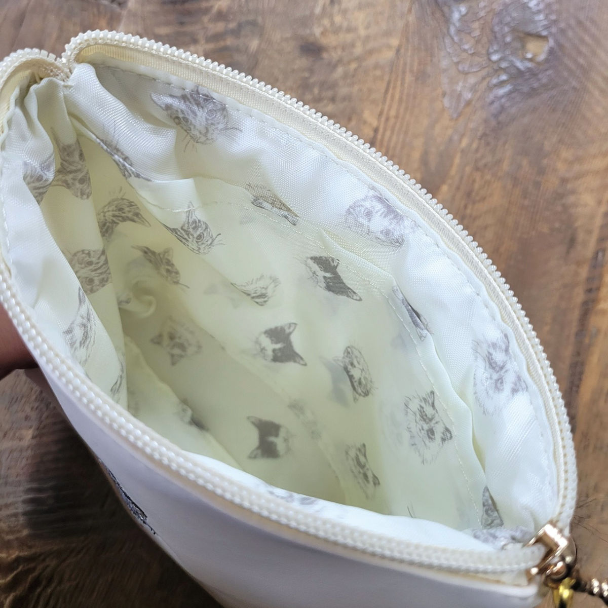 ポーチの内側にもネコちゃんのお顔がプリントされていて、開けても可愛いにこだわって作られています。また、細かい物を仕切って収納できる内ポケットが付いています。