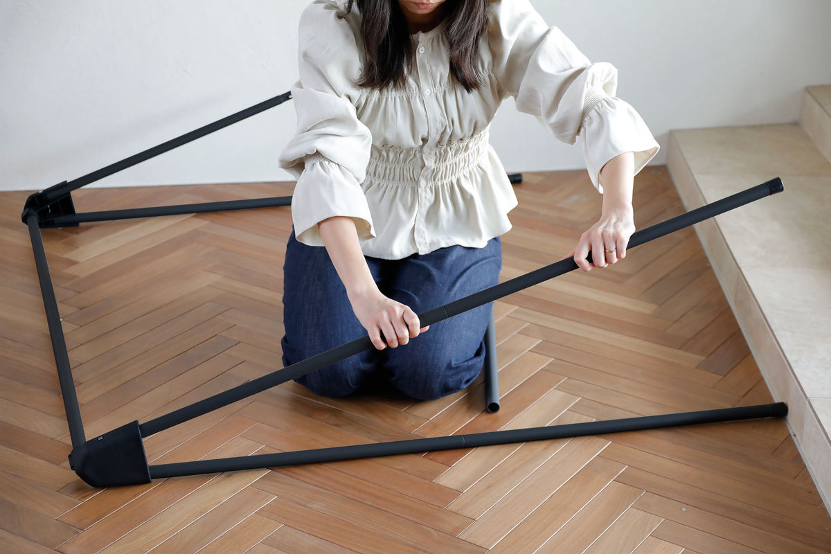 収納時は4本の脚を折り畳むだけでコンパクトになり、ちょっとしたスペースに置けます。使いたいときは脚を広げるだけですぐに使えます。
