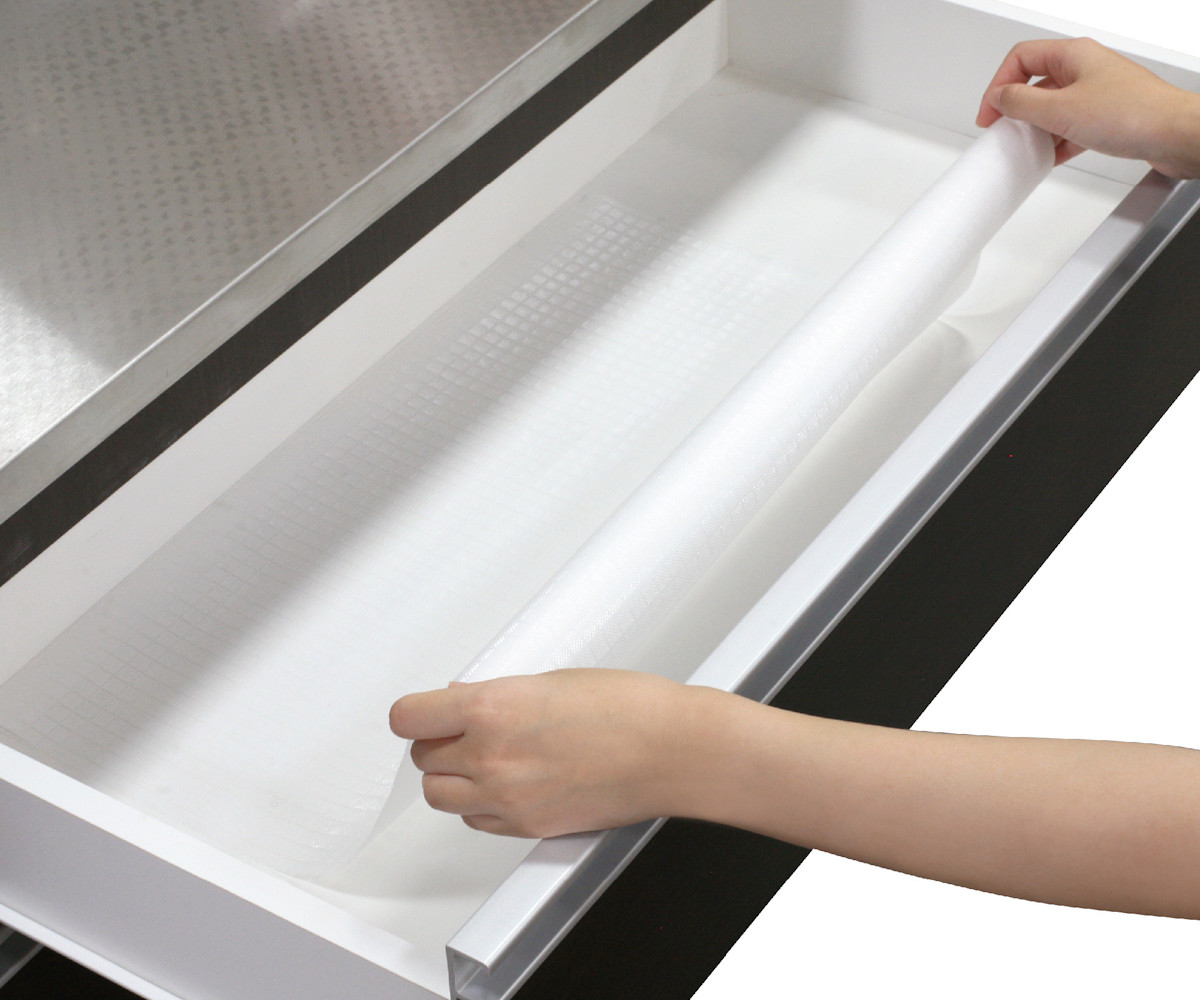 表面と裏面の摩擦力を上げてズレにくさを強化しています。引き出しや食器棚の中身もズレにくいので、システムキッチンをはじめ、食器棚や化粧台など各種収納棚にご利用いただけます。飾り棚の置物などの転倒防止にもおすすめです。