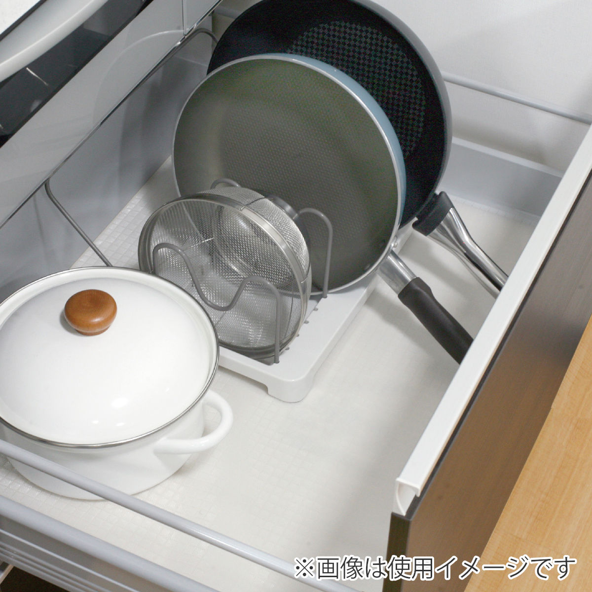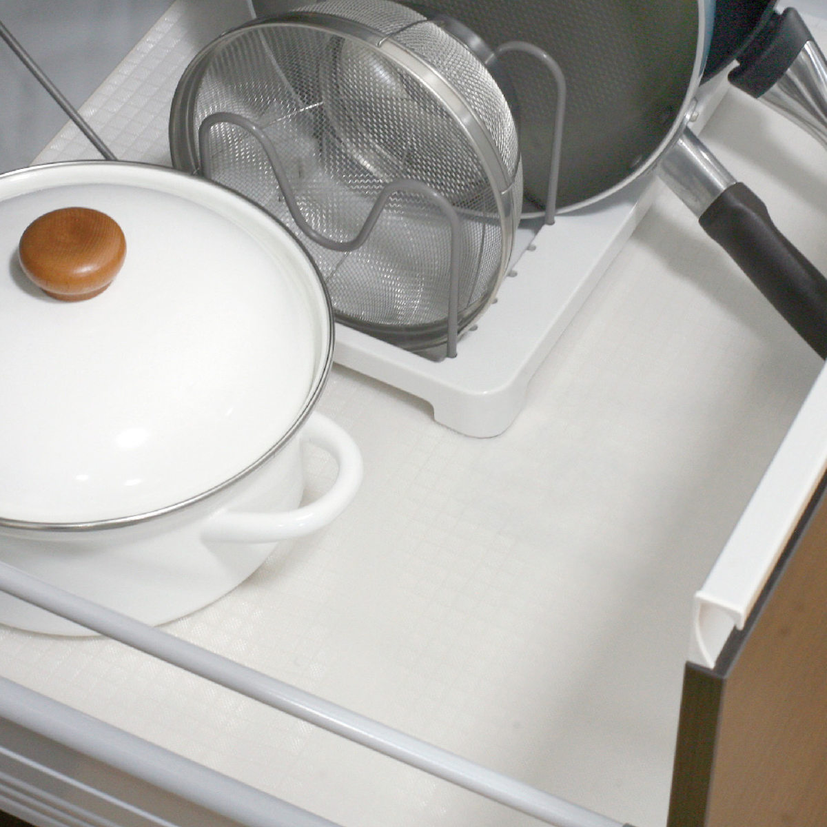 表面と裏面の摩擦力を上げてズレにくさを強化しています。引き出しや食器棚の中身もズレにくいので、システムキッチンをはじめ、食器棚や化粧台など各種収納棚にご利用いただけます。飾り棚の置物などの転倒防止にもおすすめです。