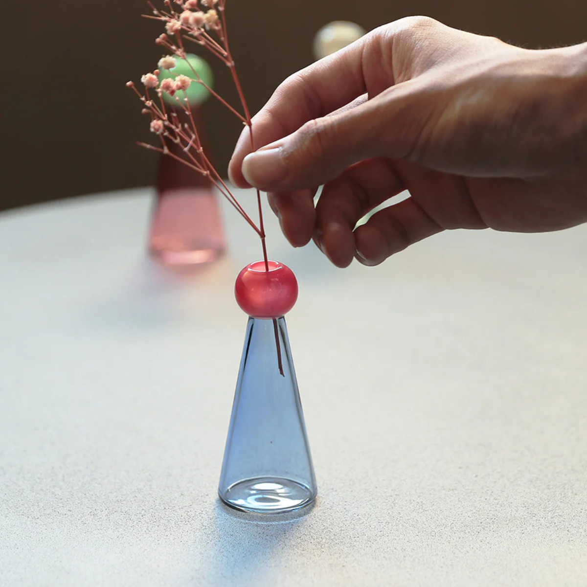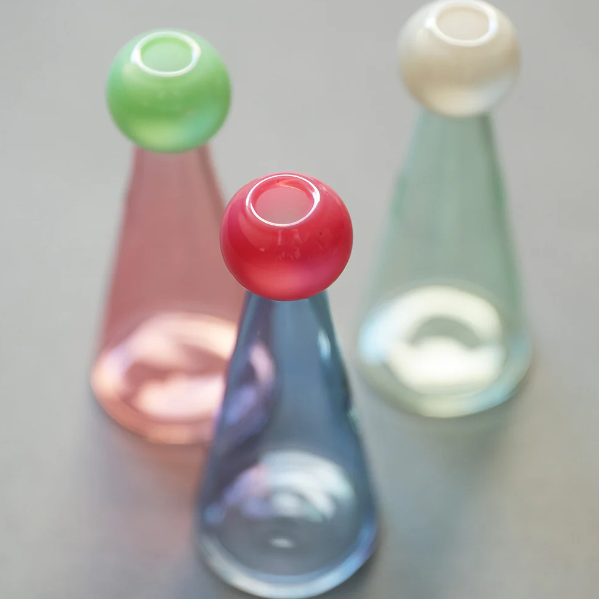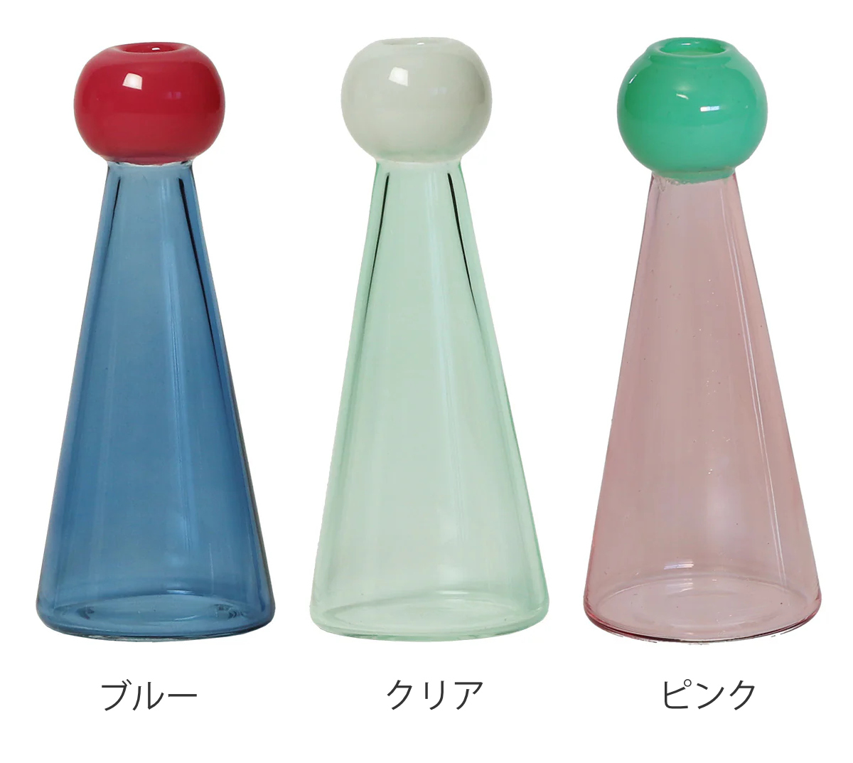 キャンディのような色合いと、ころんとしたフォルムが可愛らしい一輪挿し。透明感溢れるガラス素材に上品なパステルカラーをまとった円錐型のボディと球体型の口もとがガラスビーズのよう。ドライフラワーや枝物との相性も抜群です。