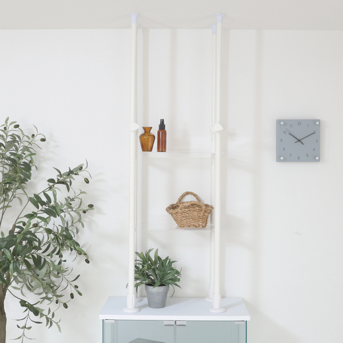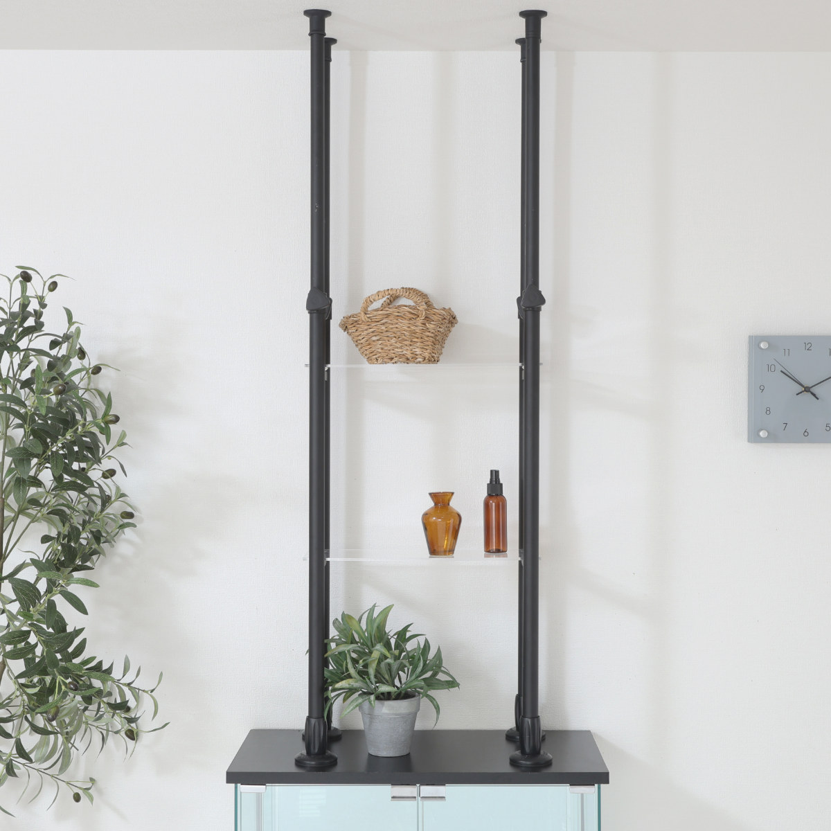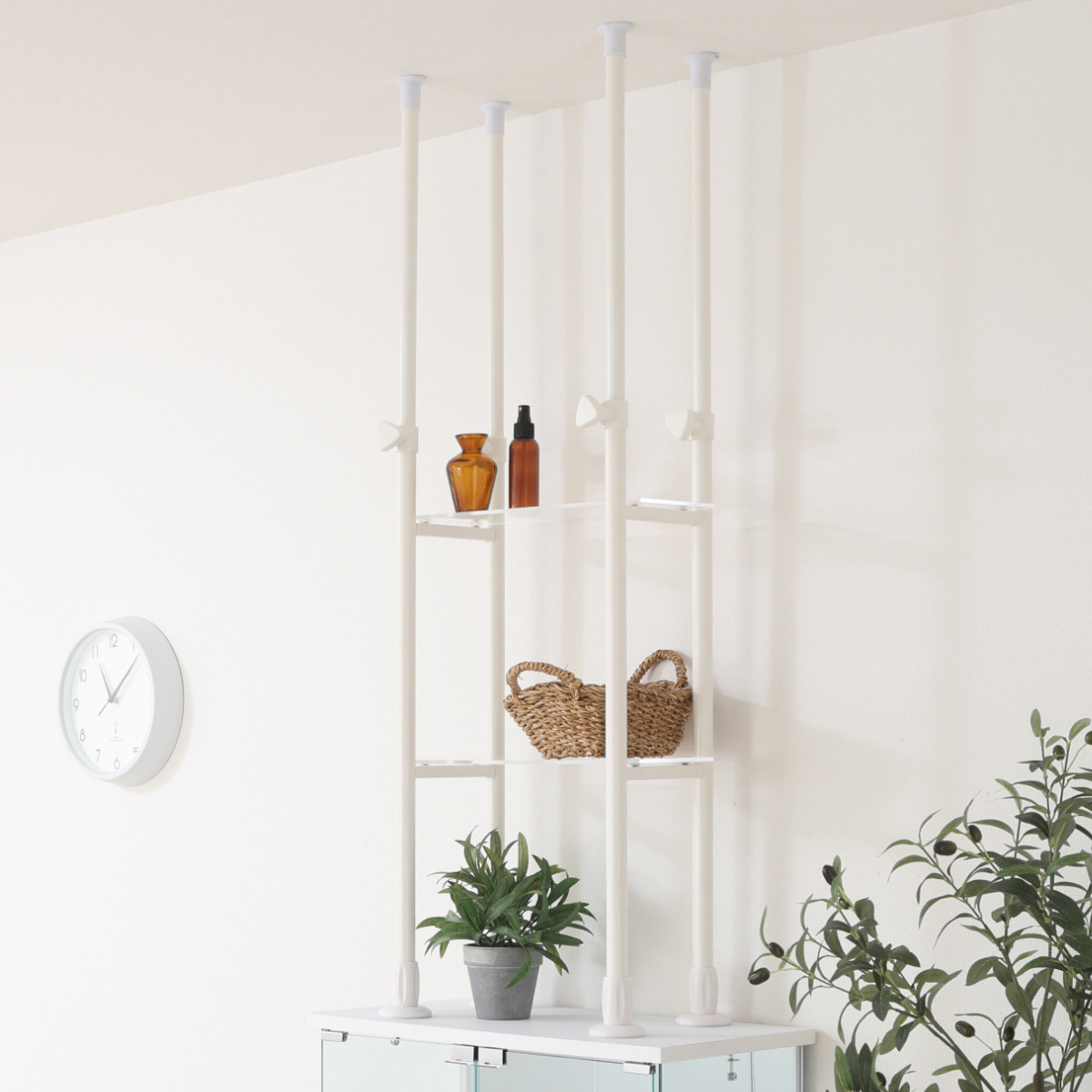 取り付けには、ネジなどの工具は必要なく、誰でも簡単に設置できます。高さも、使用する棚と天井の高さに合わせて調整できます。