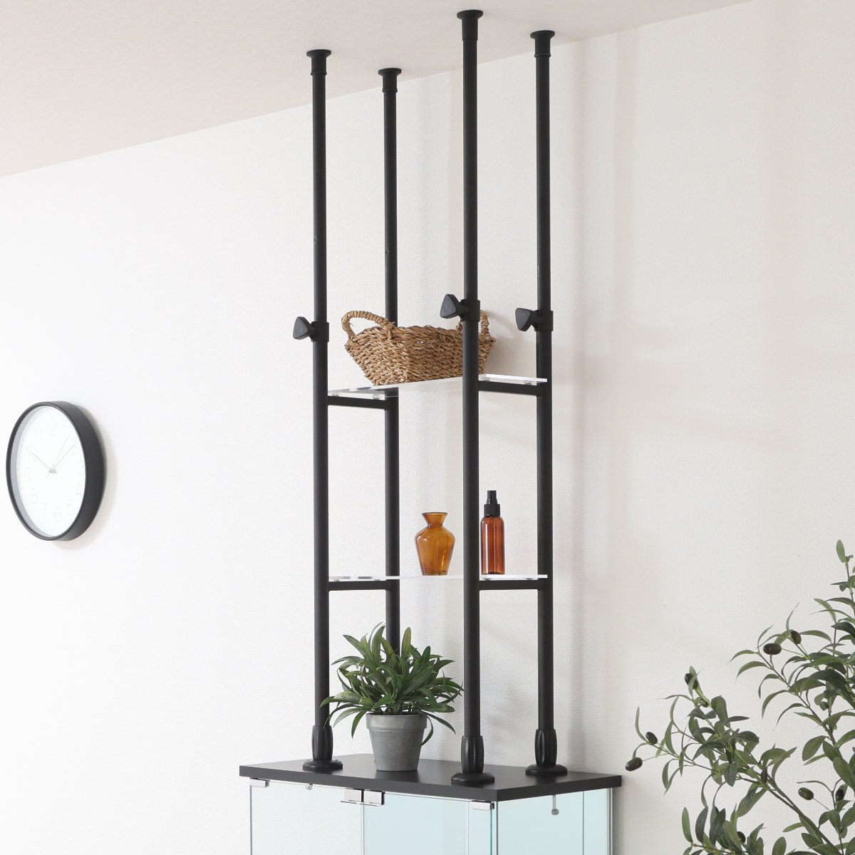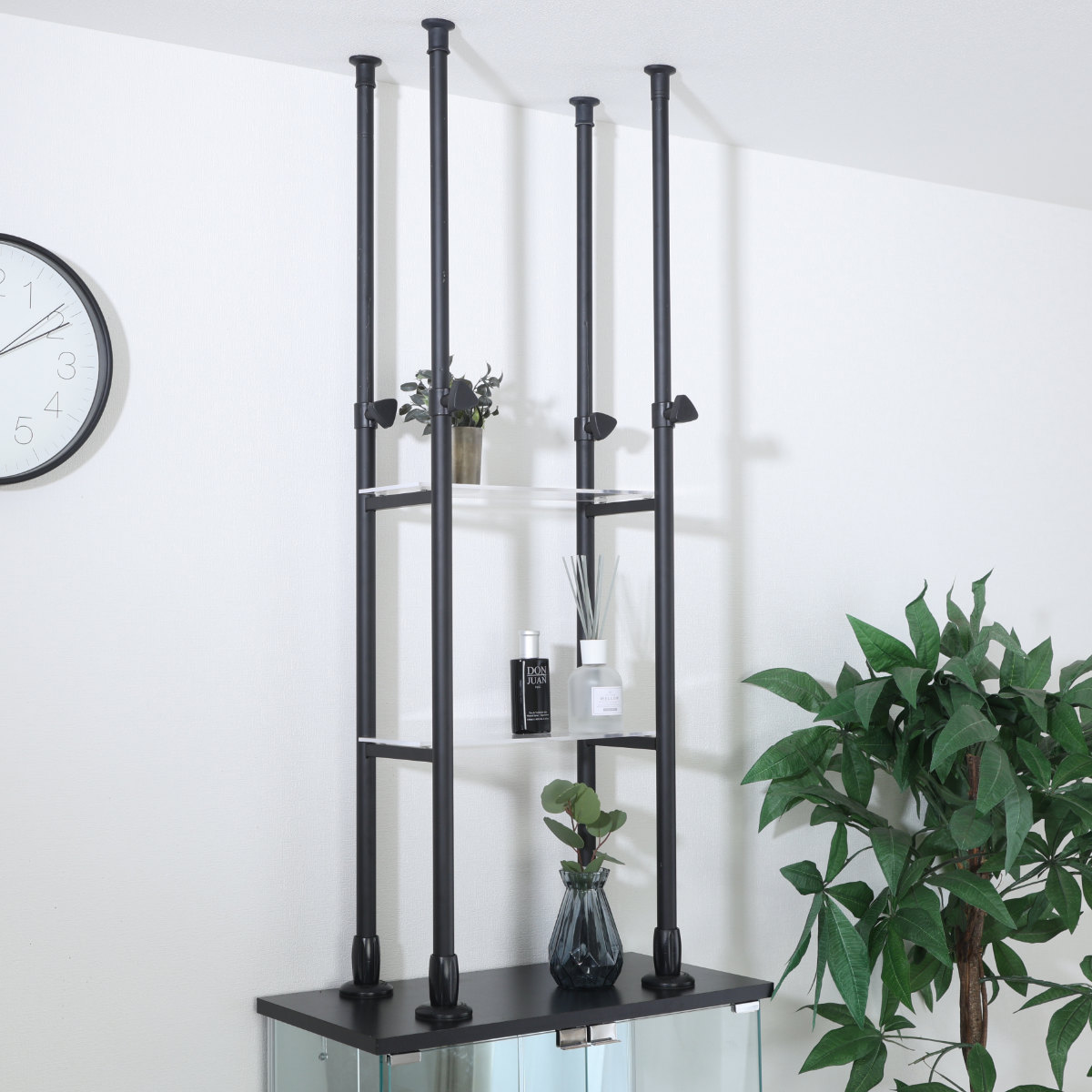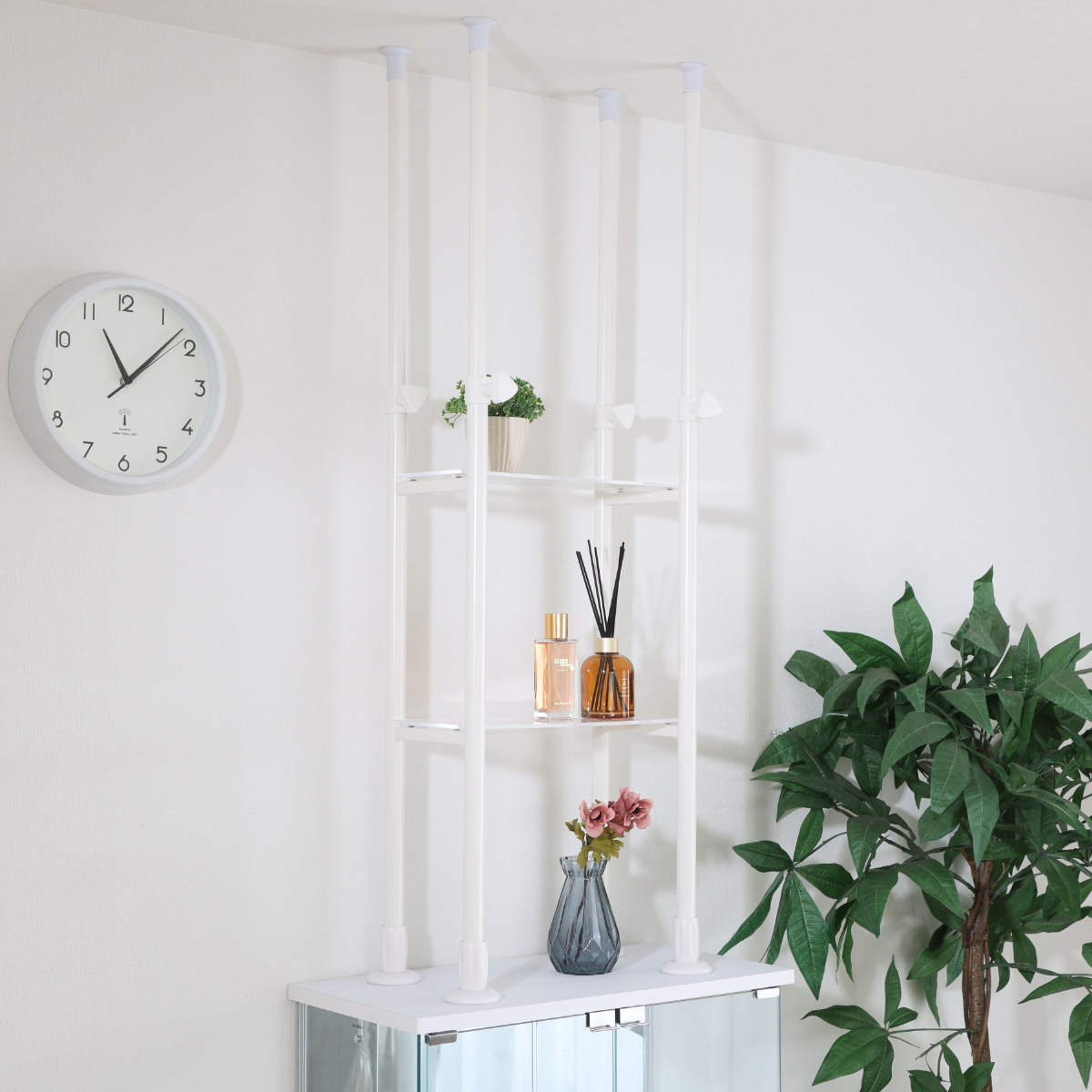 取り付けには、ネジなどの工具は必要なく、誰でも簡単に設置できます。高さも、使用する棚と天井の高さに合わせて調整できます。