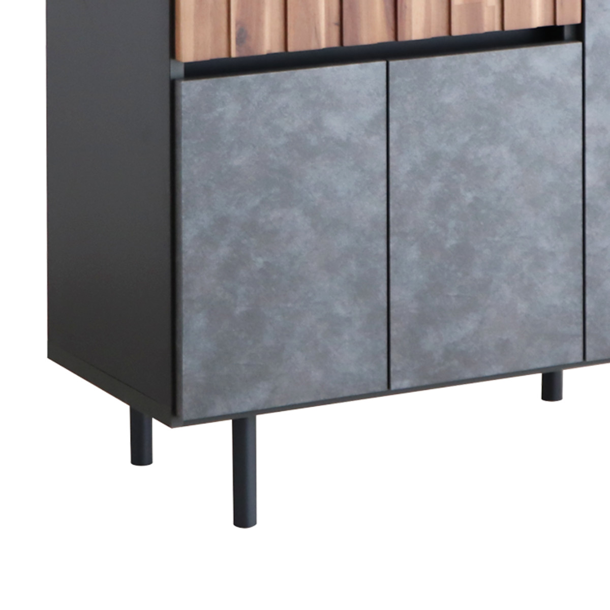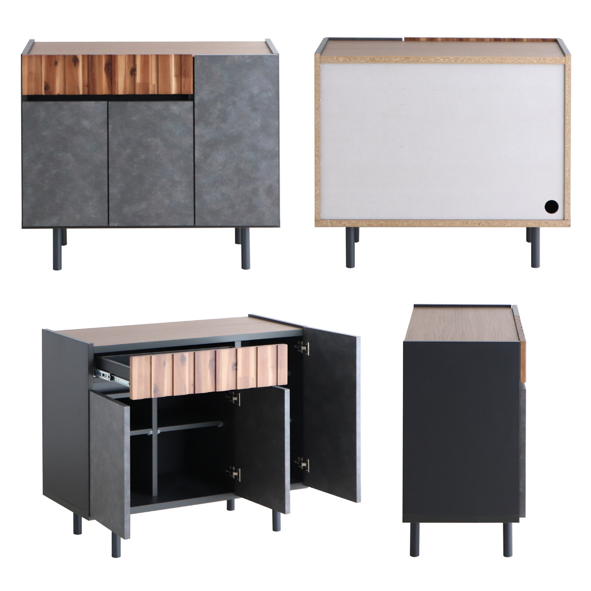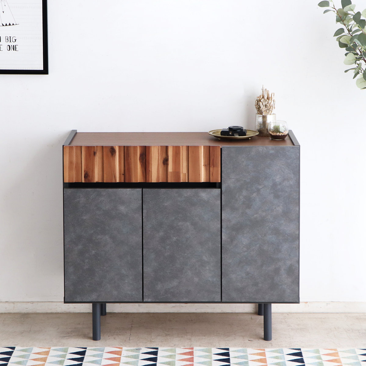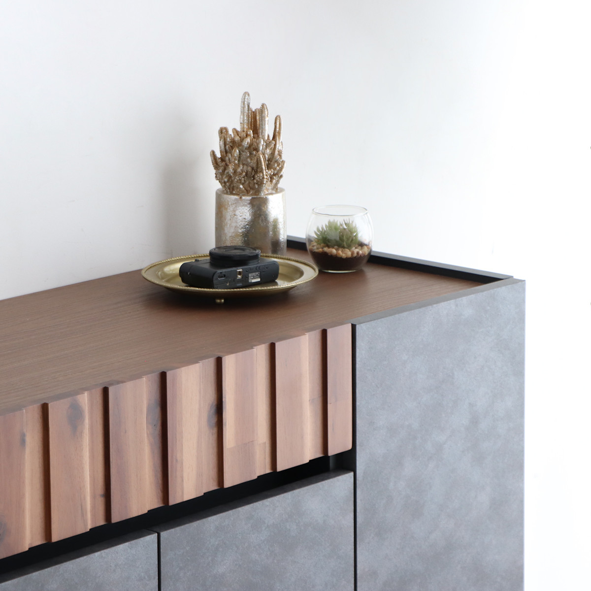 モルタル調の前板とブラウンの木目が特徴的なサイドボードです。モノトーンを基調とした都会的なスマートさと、木のぬくもりを感じられるデザインです。日本の職人が丁寧に作った高品質で安心安全のF☆☆☆☆商品です。