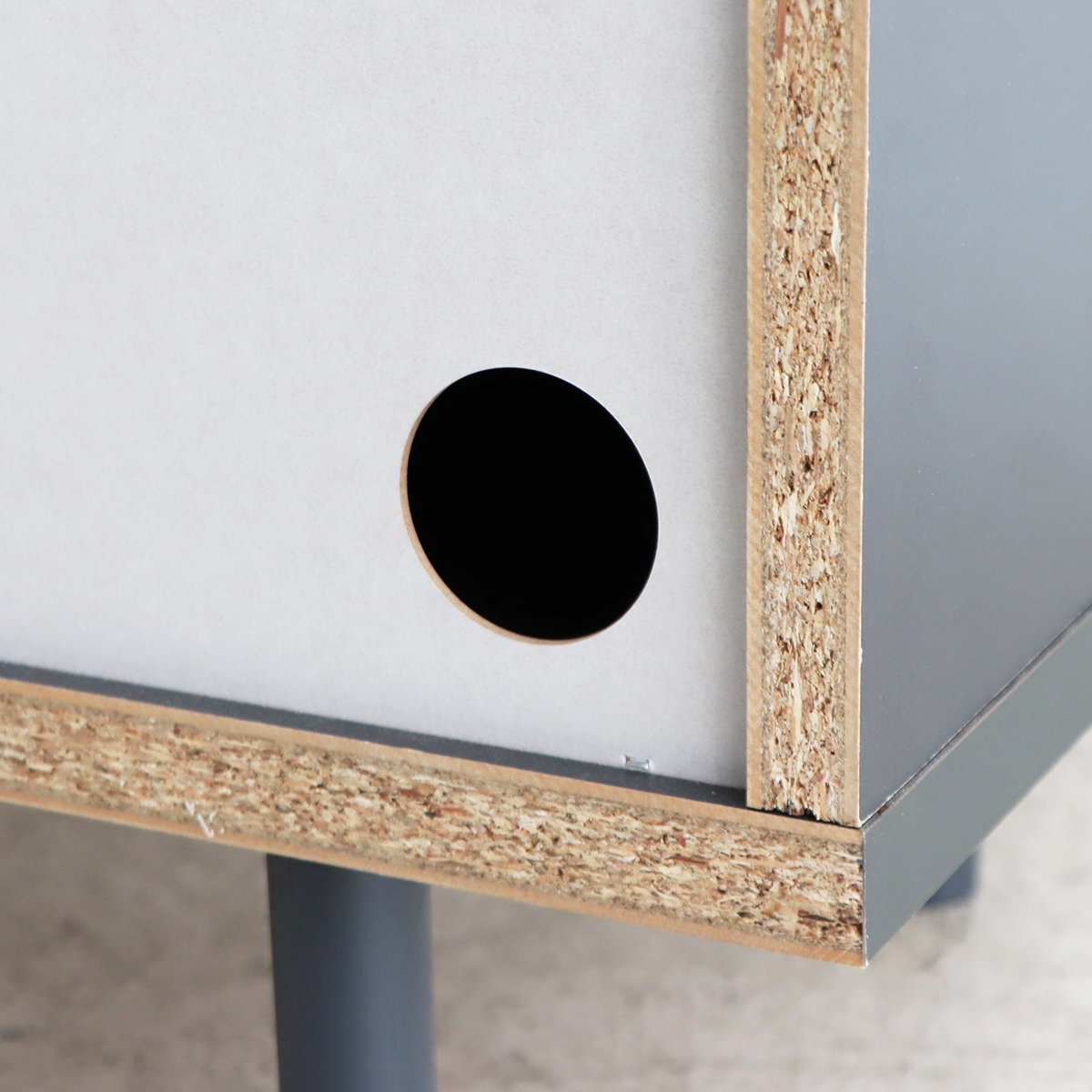 扉収納は、配線にも考慮した仕様です。背面にコード穴を付けているので、Wi-Fiルーターなどの収納にも最適です。コード類を背面にすっきり隠せます。