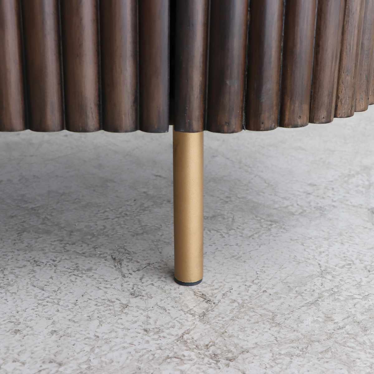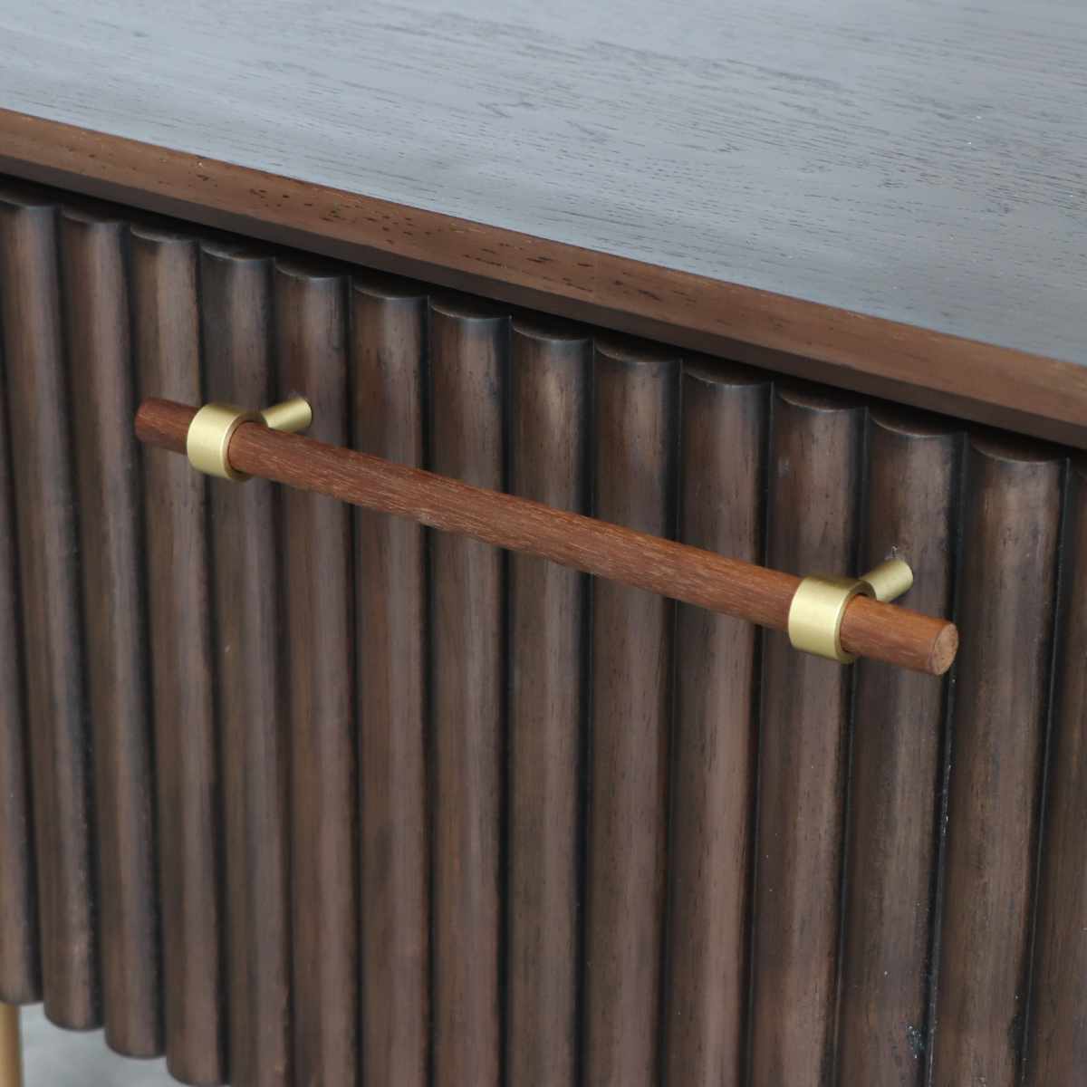 ハンドルは、木のぬくもりと金具の上品なアクセントが美しく調和したデザインです。手にしっくりとなじむやさしい丸みとスマートなフォルムが、サイドボード全体の印象をぐっと引き締めます。