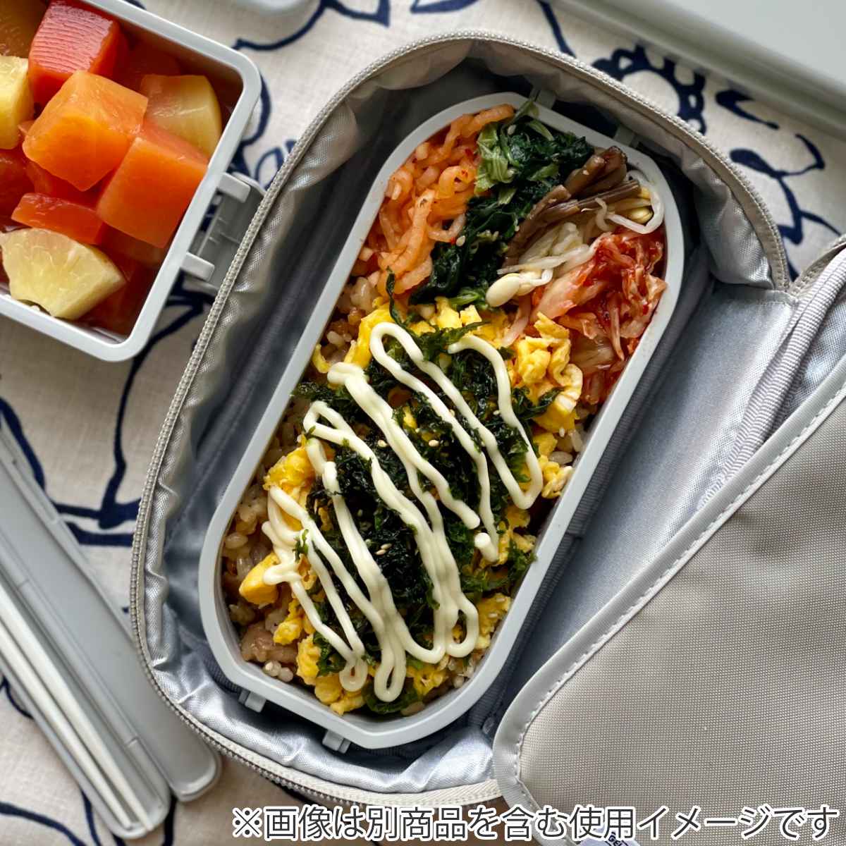 開口部が大きく開くので、お弁当箱やカトラリー、保冷剤などの出し入れもスムーズです。サイズや形状の異なるお弁当箱を組み合わせて、すっきりと収納できます。