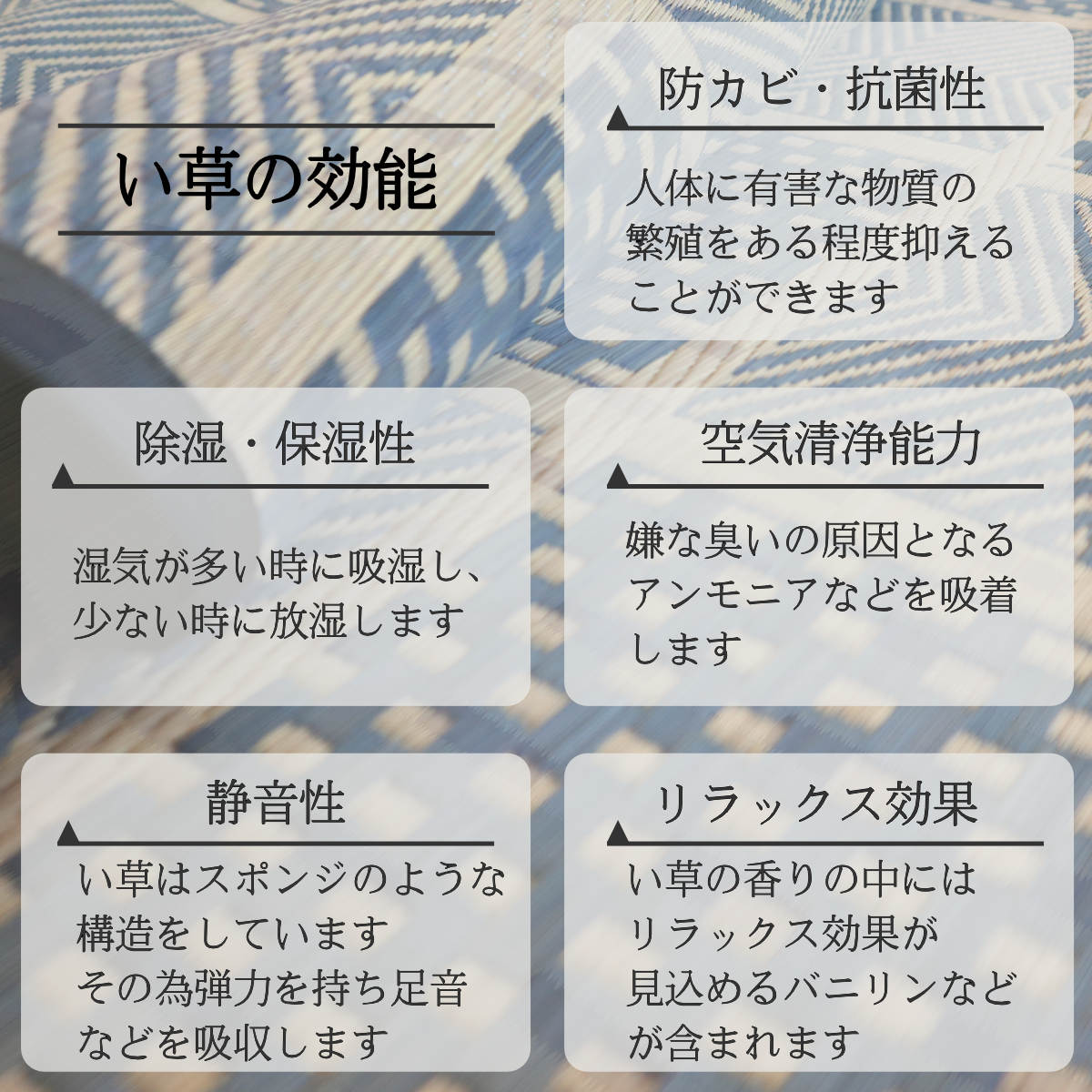 リビングや寝室などリラックスしたい場所に敷くことで、身体に優しいい草の効能が発揮され、快適な時間をお過ごしいただけます。