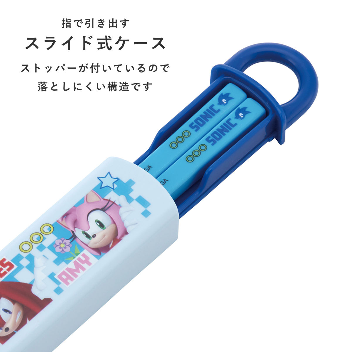 ケースは指で引き出すスライド式で、衝撃に強く丈夫な構造です。本体から抜け落ちを防ぐストッパー付きです。