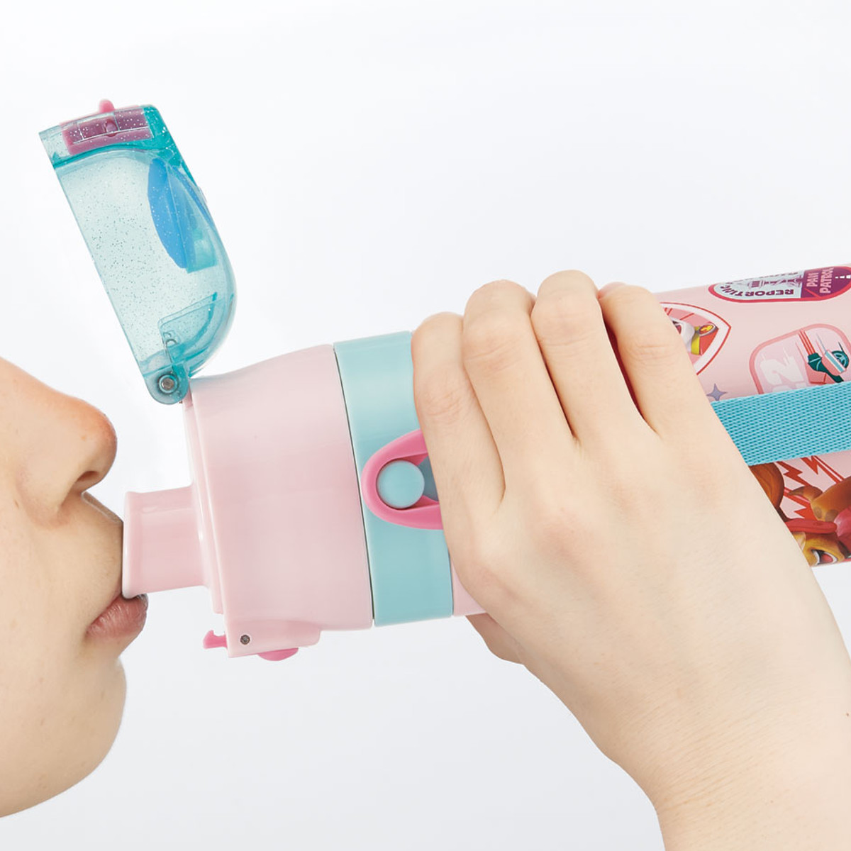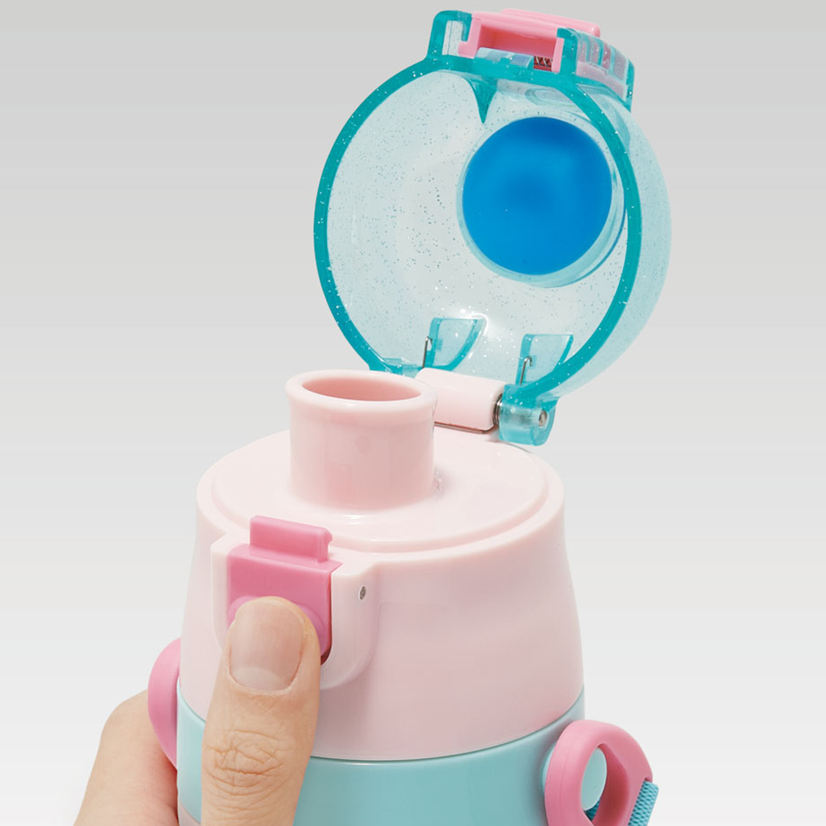 水筒の蓋はボタンを押すだけで開けることができるワンタッチ式です。飲み終わったら蓋をカチッと閉めるだけなので、小さなお子様でも簡単に開閉できます。