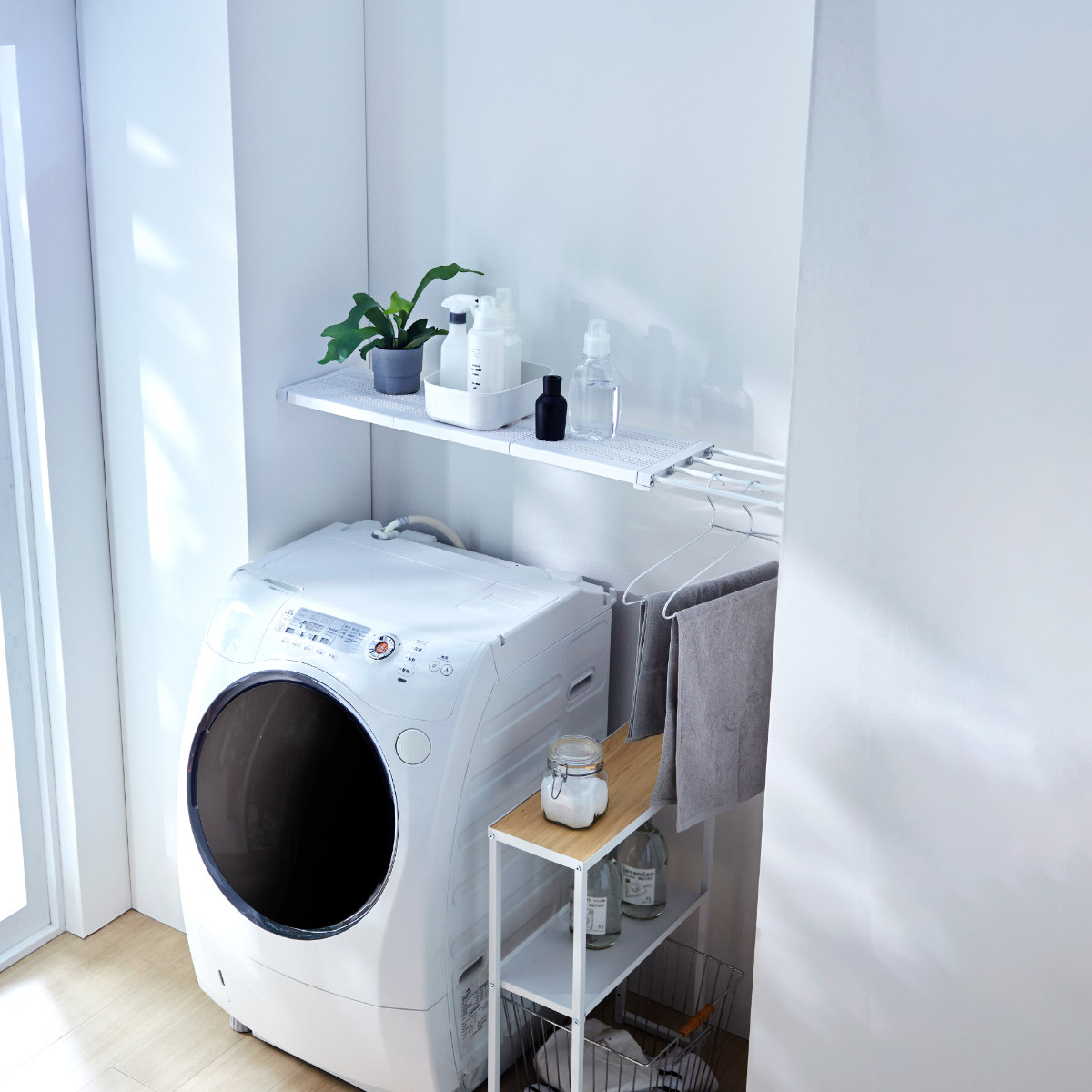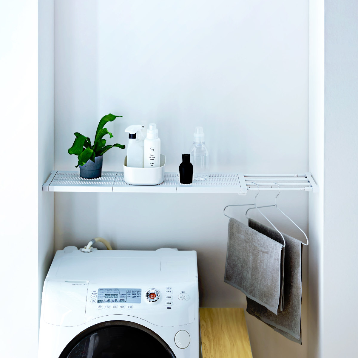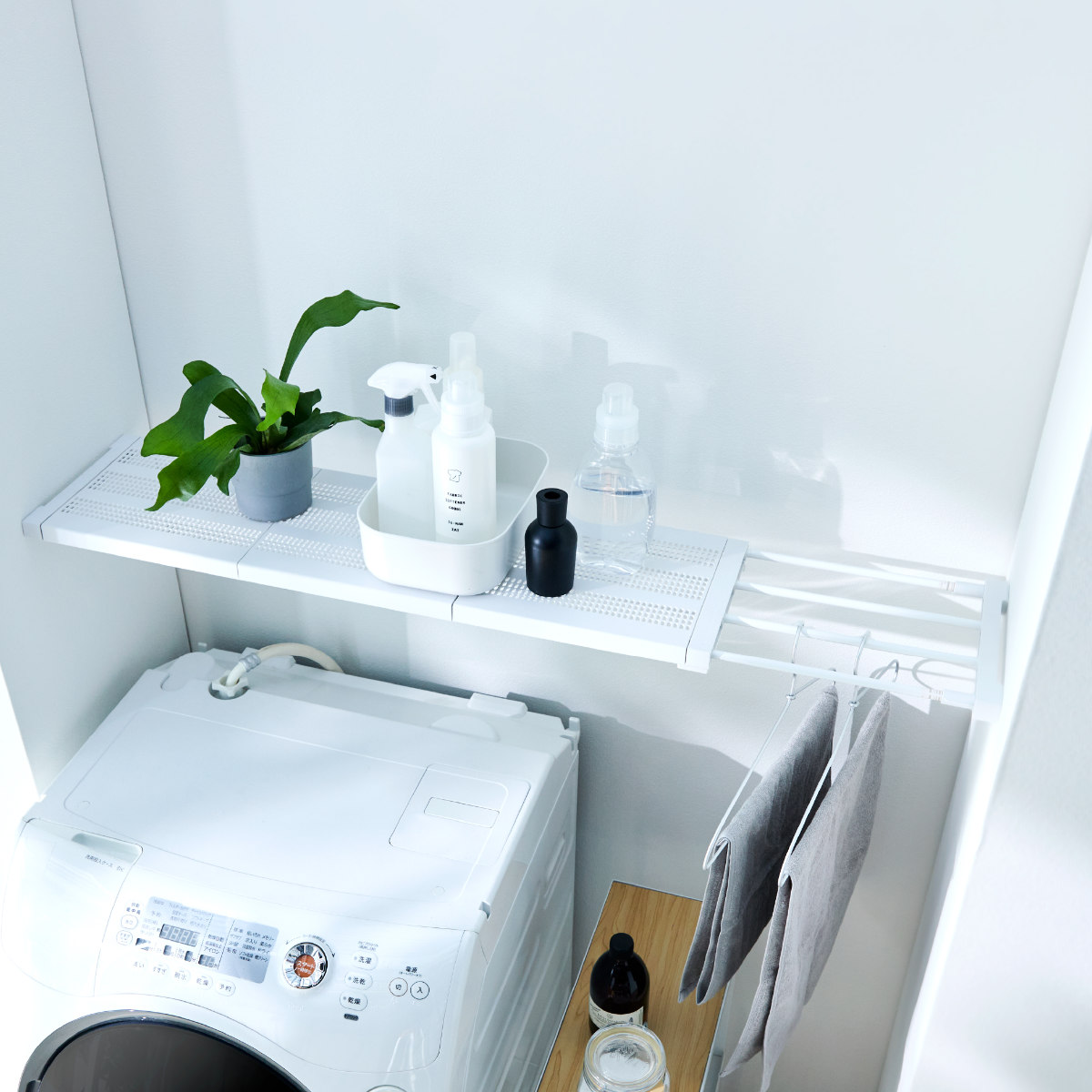 突っ張り式の棚は、トイレや洗面所、お部屋のちょっとしたデッドスペースに取り付けるだけで、簡単に収納スペースを作り出すことができます。せまいお部屋にも圧迫感を与えないスッキリとしたデザインです。