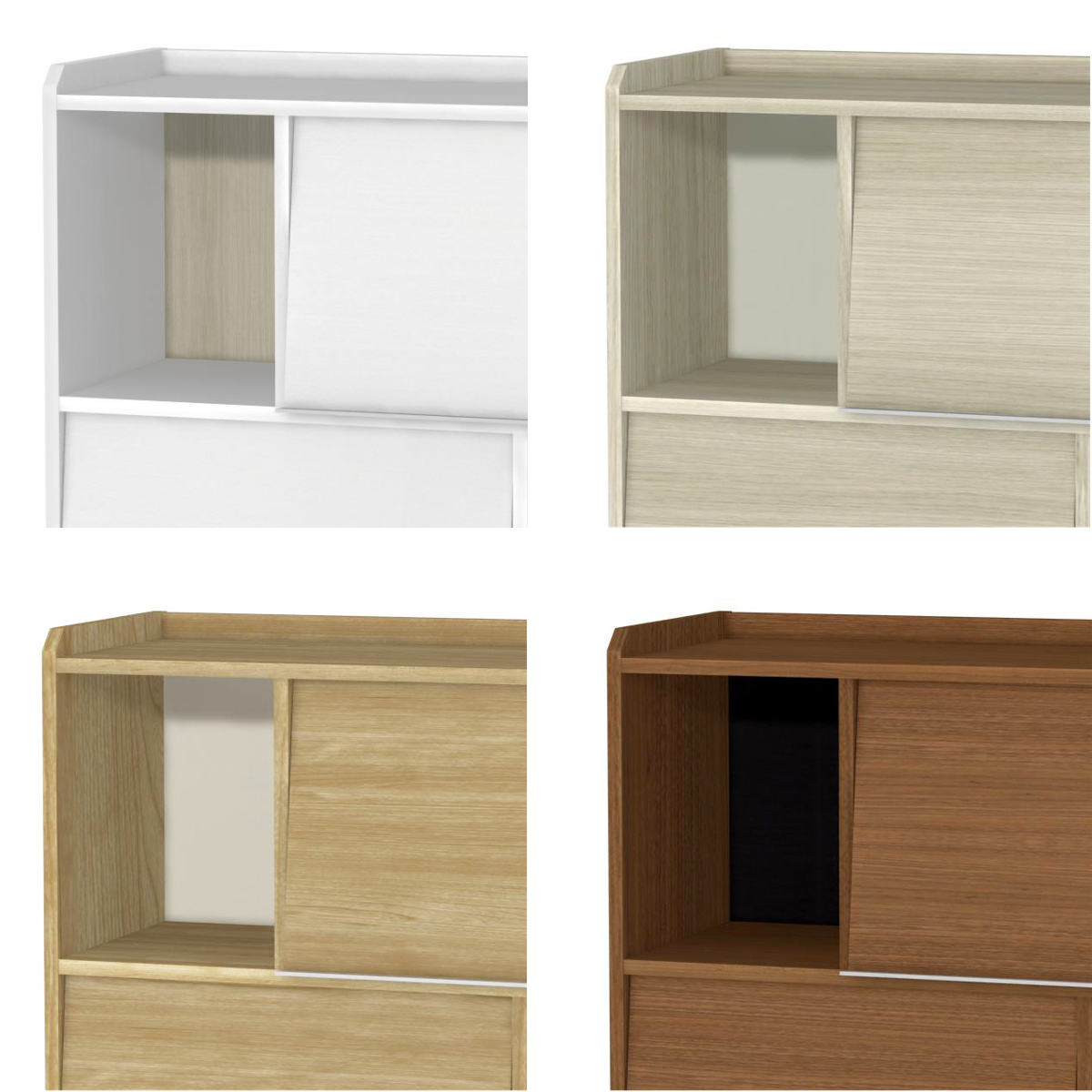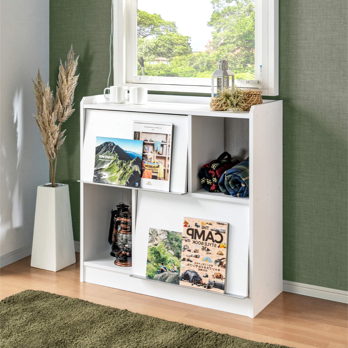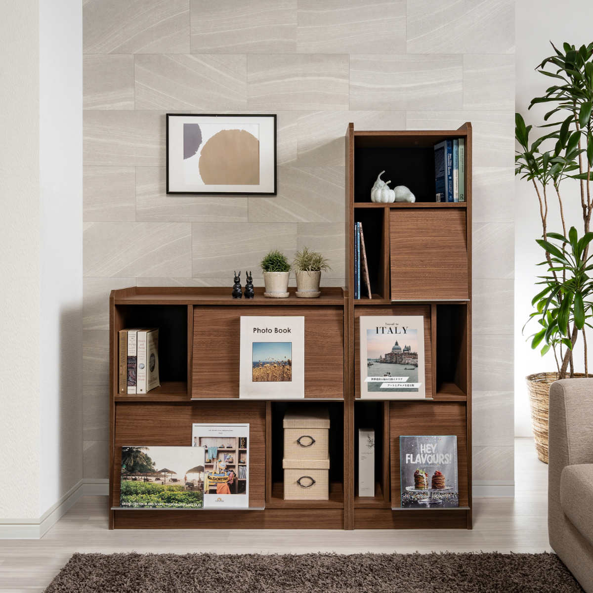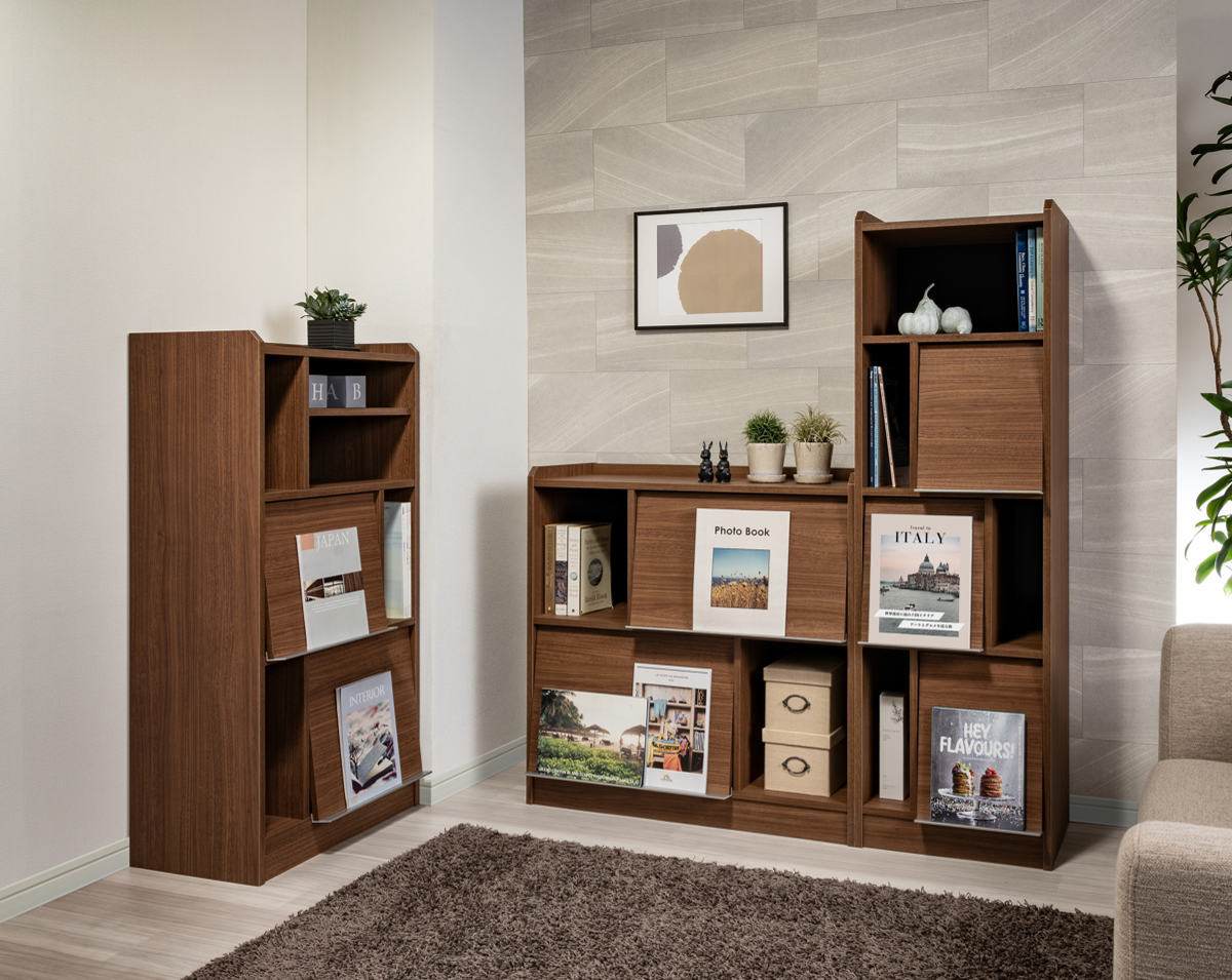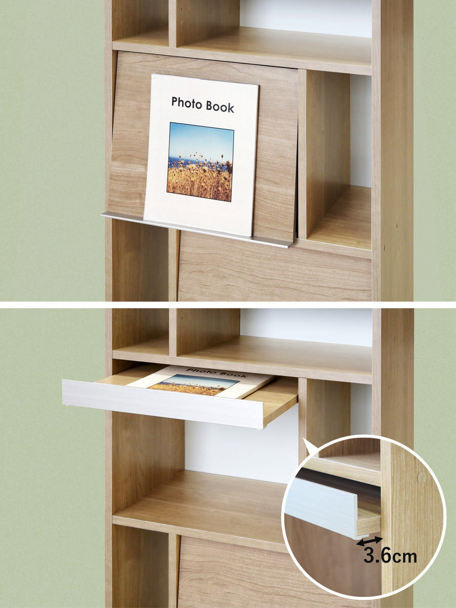 扉を閉じることで中に収納したものを隠せるフラップ扉。扉にはお好きな雑誌やCDを立て掛けてディスプレイを楽しめます。生活感のあるものを扉内に収納すれば、お部屋がすっきり。扉は、ディスプレイしたアイテムを飾ったまま開閉できます。